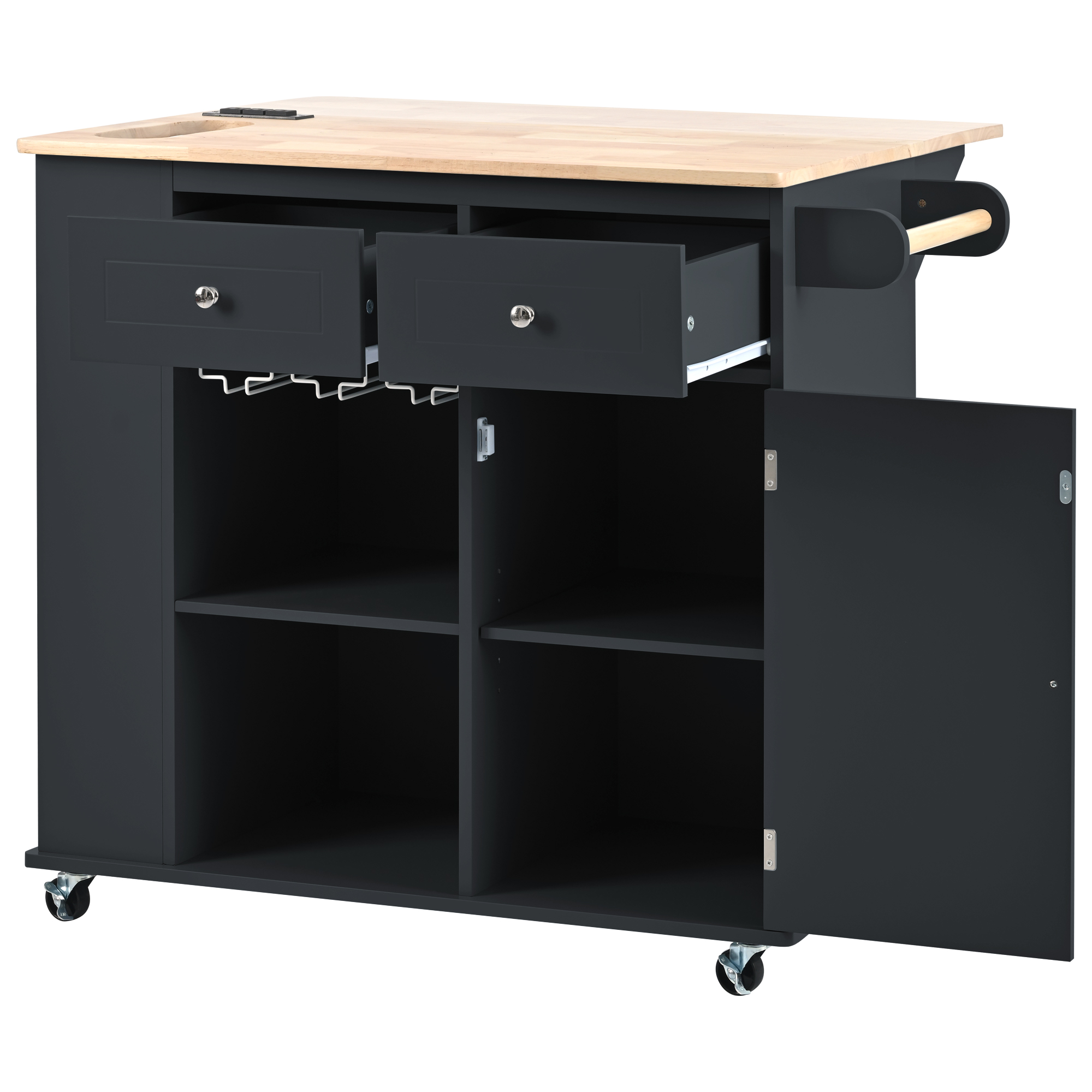 Product Name:Kitchen Island with Power Outlet,Kitchen Storage Island with Drop Leaf and Rubber Wood,Open Storage and Wine Rack,5 Wheels,with Adjustable Storage for Home, Kitchen, and Dining Room, Black