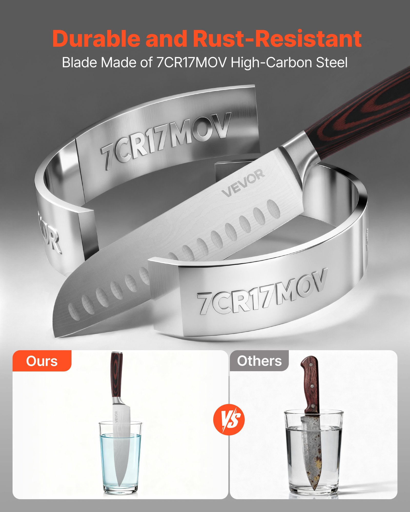 Durable & Rust-Resistant: Made of 7CR17MOV high-carbon stainless steel, this knife block set offers hardness and toughness, avoiding chipping or cracking. The blades are oil-quenched and polished to pass salt spray tests, ensuring a rust-resistant surface and long-lasting sharpness even in humid kitchens
