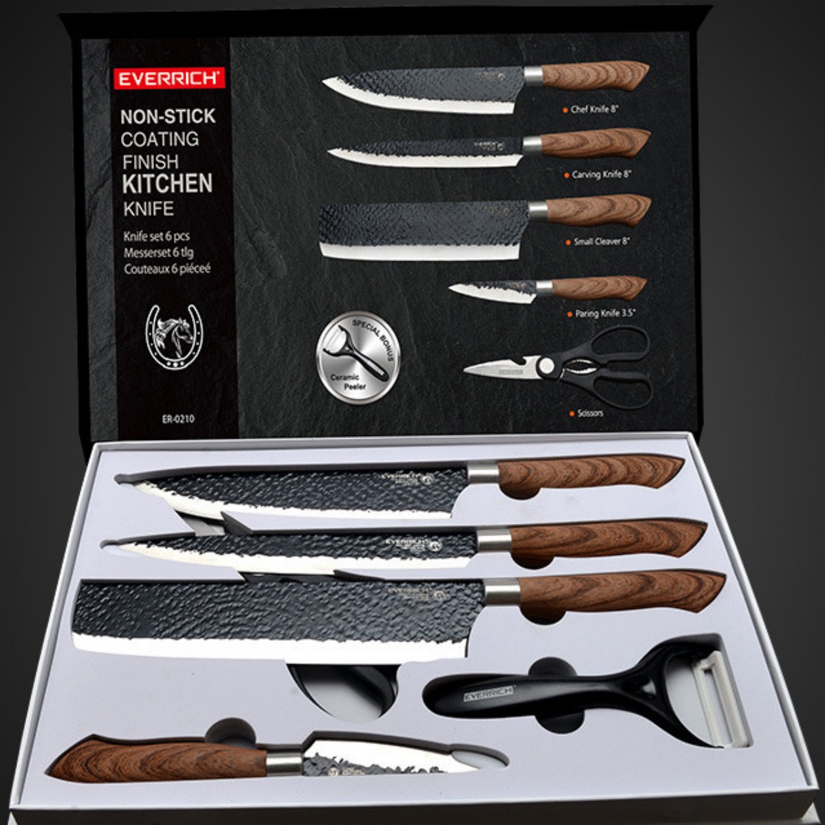 8-inch western kitchen knife, 8-inch chef's knife, 8-inch raw fish knife, 3.5-inch fruit knife, kitchen scissors, melon cutter*1