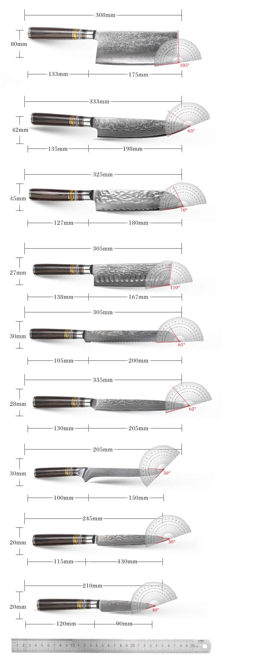 Colour:7 inch chef's knife,8 inch chef's knife,7 inch Japanese chef's knife,7 inch small chef's knife,8 inch meat cleaver,8 inch bread knife,6 inch boning knife,5 inch all purpose knife,3.5 fruit knife