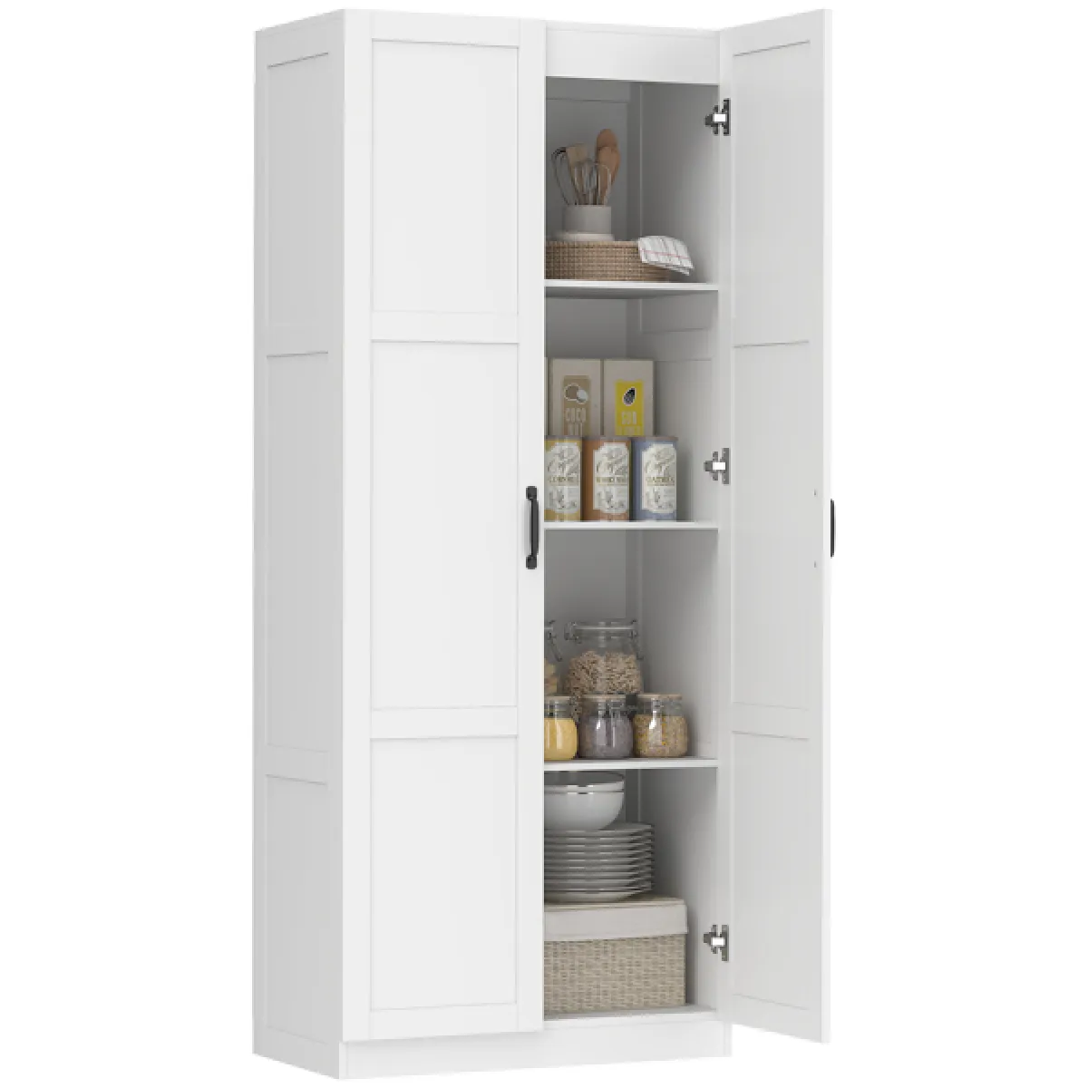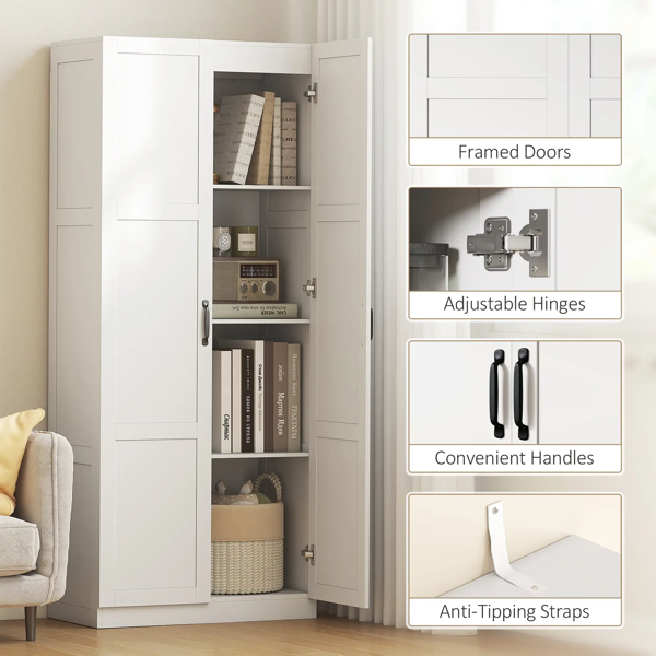 Features: - Vertical kitchen pantry cabinet maximises storage efficiently - Seven compartments organize food cookware and supplies for calmer kitchens - Four 5-level adjustable shelves adapt storage for tall bottles appliances - Soft-close hinges keep doors quiet and family friendly - Solid color finish with framed doors suits modern farmhouse interiors - Plywood frame is lighter and stronger than particleboard. Melamine surface is easy to wipe clean - Anti-tipping straps add stability for everyday safe use - Assembly required Specification: - Color: White - Material: Plywood - Overall Dimensions: 29.5" W x 15.7" D x 70.9" H - Cabinet Inner Size: 28.3" W x 15.2" D x 16.9" H (top compartment), 14.2" W x 15.2" D x 15.9" H (other compartments) - Weight Capacity: 22 lbs. (fixed shelf), 33 lbs. (adjustable shelf), 110 lbs. (overall)