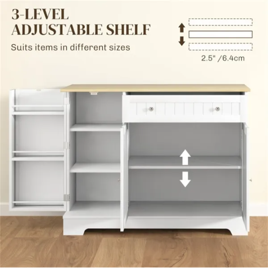 - Weight Capacity: 335 lbs. (total), 50 lbs. (fixed shelf), 30 lbs. (adjustable shelf), 25 lbs. (drawer), 10 lbs. (door shelf)