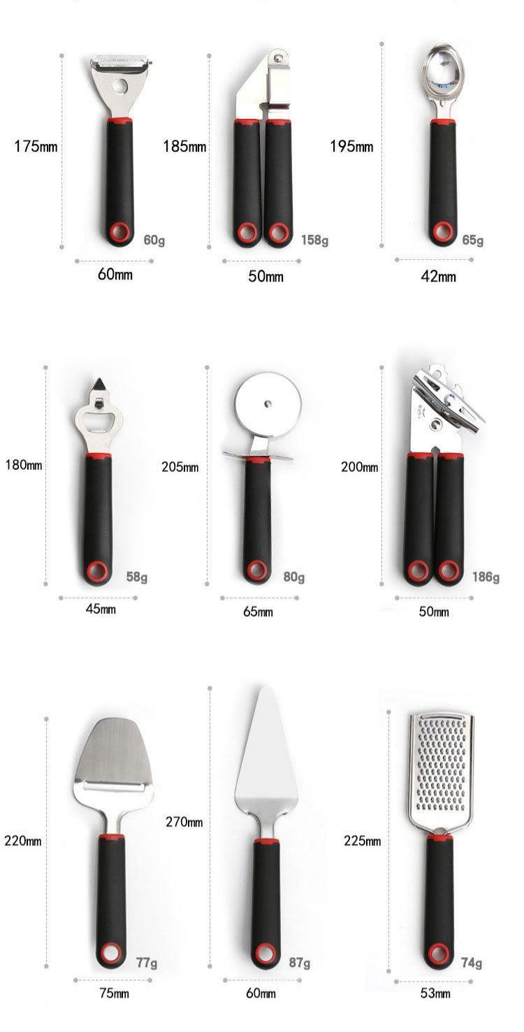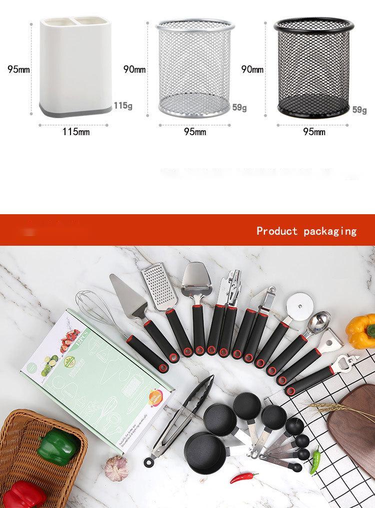 Specifications: Whisk, melon planer, ice cream spoon, garlic press, pizza cutter, cheese planer, bottle opener, cheese spatula, cake spatula, tin opener, measuring spoon, food tongs, slotted spoon, spoon, slotted spatula, pot Shovel, Spoon, Potato Press, Plastic Storage Bucket, Metal Storage Bucket, Metal Storage Bucket-Black, 5 Piece Set + Storage Bucket + Color Box, 6 Piece Set + Storage Bucket + Color Box, 7 Piece Set + Storage Bucket + Color Box, 12-piece set + color box, 16-piece set + color box
