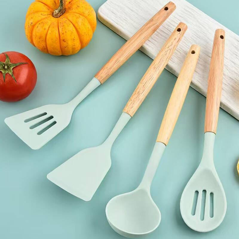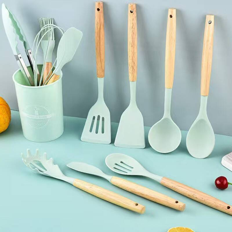 Kitchen Utensil Set 12 PCS Silicone Cooking Tools with Wooden Handle, Cooking Utensils Set Heat Resistant & Non-Scratch for Nonstick Pans, Utensil Set Includes Spatula, Spoon & Tongs, Kitchen Accessories Dishwasher Safe, Green Kitchen Accessories for Modern Homes, Essential Kitchen Utensils