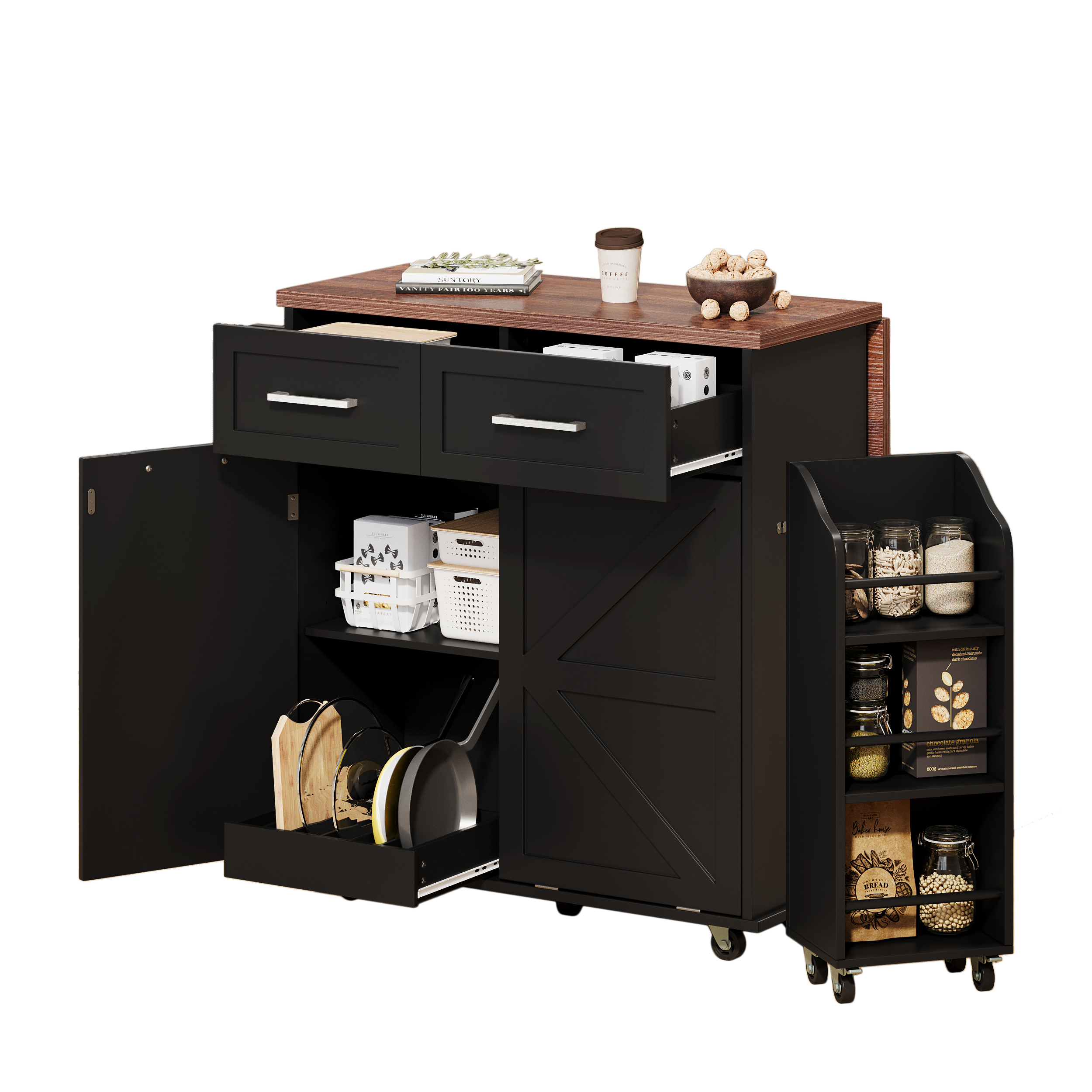 - [Unique Removable Mobile Side Shelf] The right side of the island has a separate removable side shelf. You can hang it on the cabinet or remove it separately. The 3-tier storage design allows you to arrange different bottles and cans. The 4 universal pulleys on the bottom ensure that this shelf can be used separately.