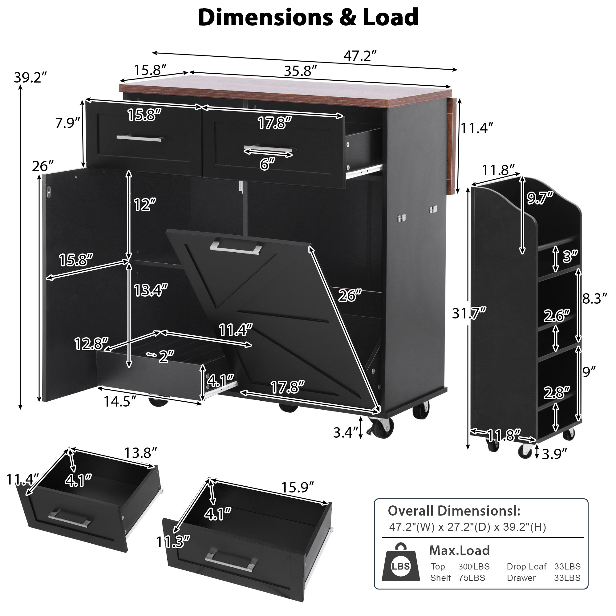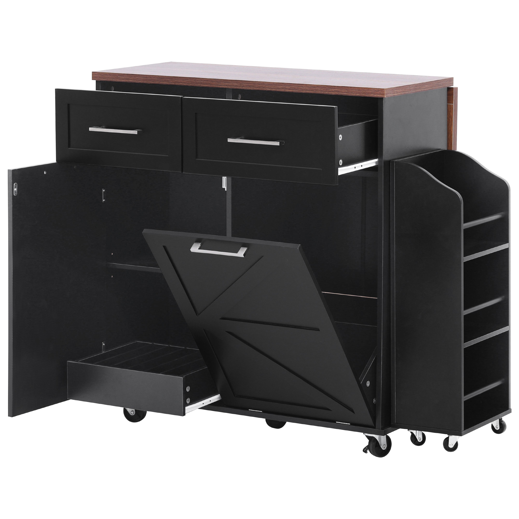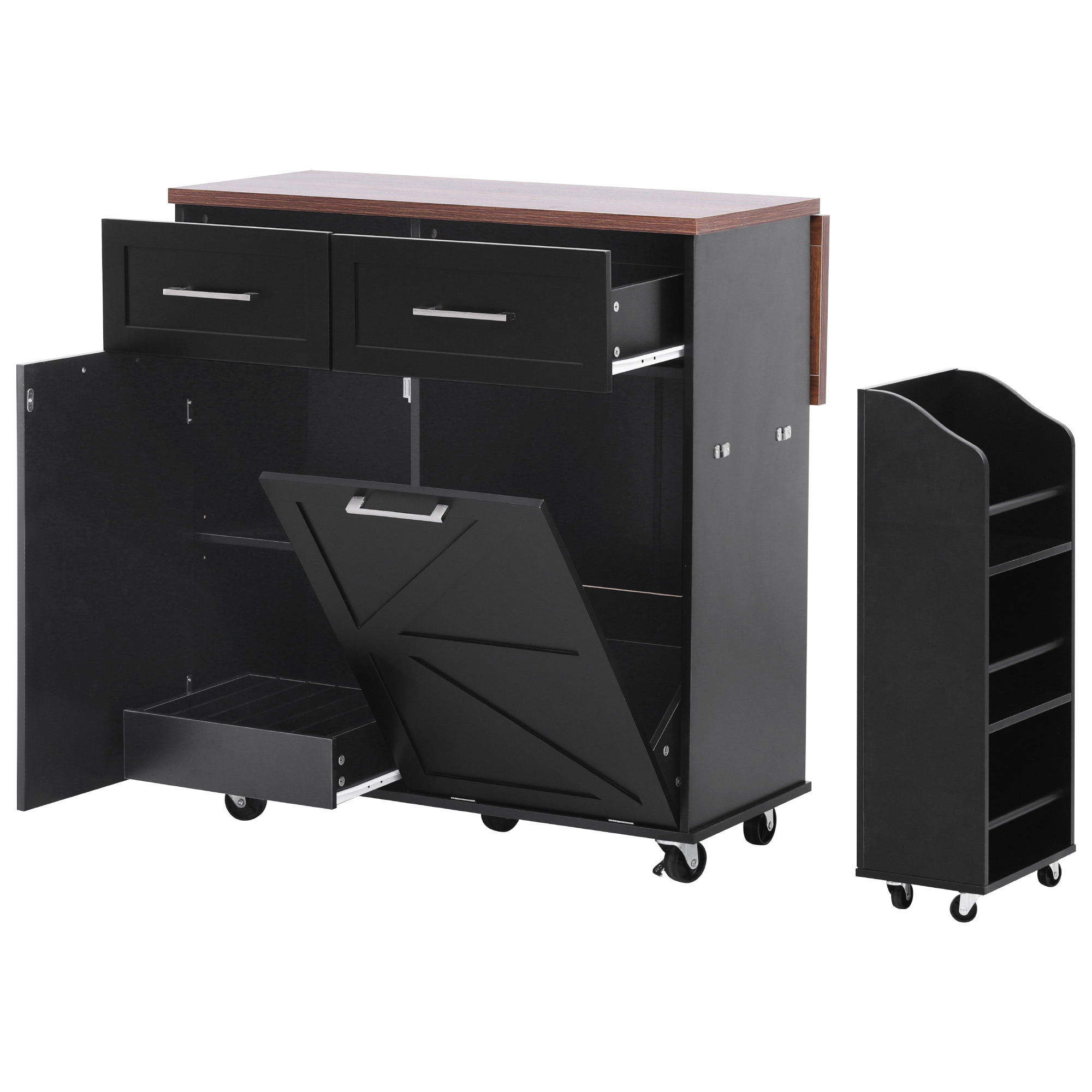 Decoration::Unique Removable Mobile Side Shelf + Tilt Trash Can Cabinet + Drop Leaf + Solid Wood Feet
