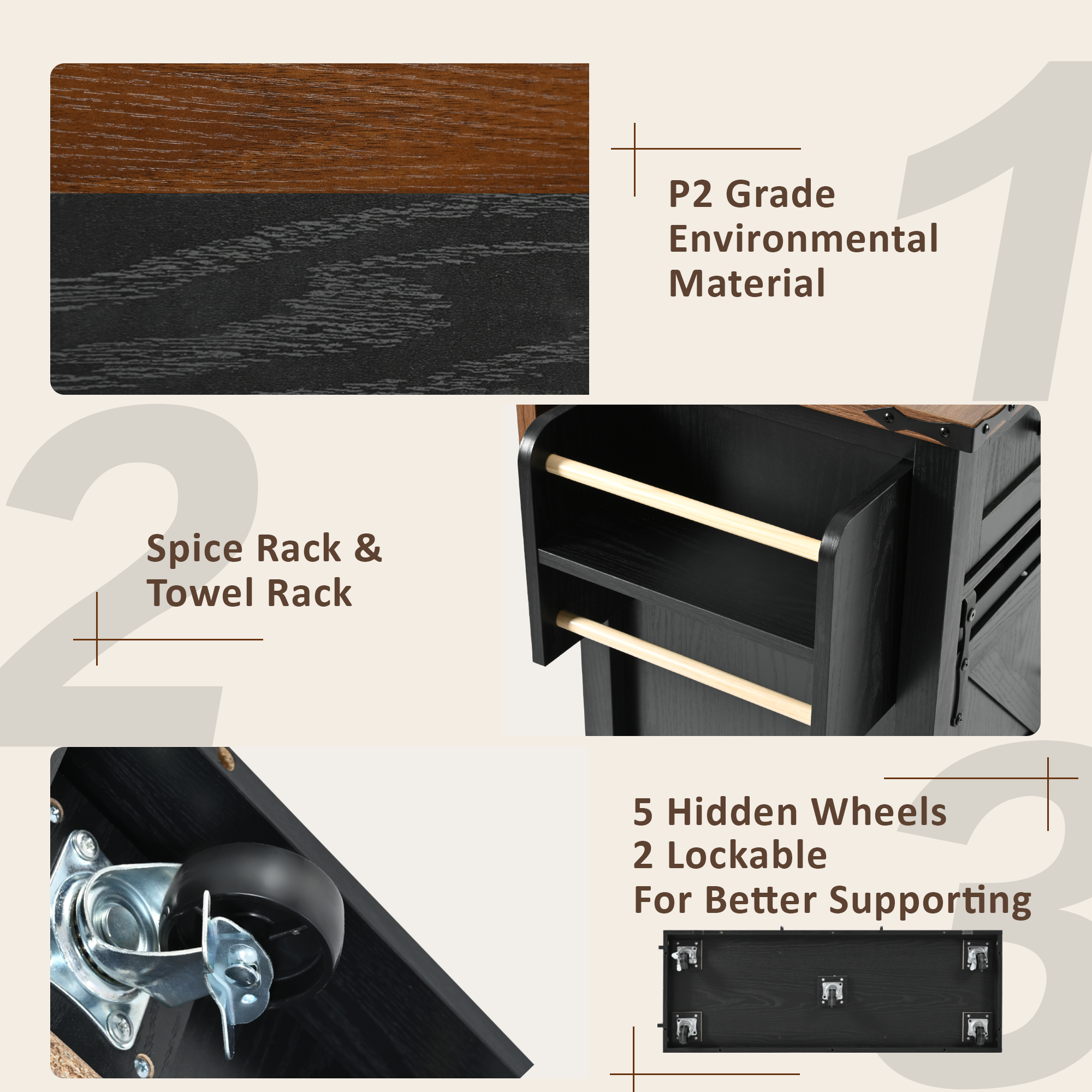 - [Rolling kitchen island] This mobile kitchen island on wheels is equipped with 5 universal wheels, 2 of which are lockable. The central placement of one wheel at the base ensures enhanced overall stability during movement. This feature allows for effortless relocation as needed, providing greater convenience for cleaning and reorganizing the kitchen space.
