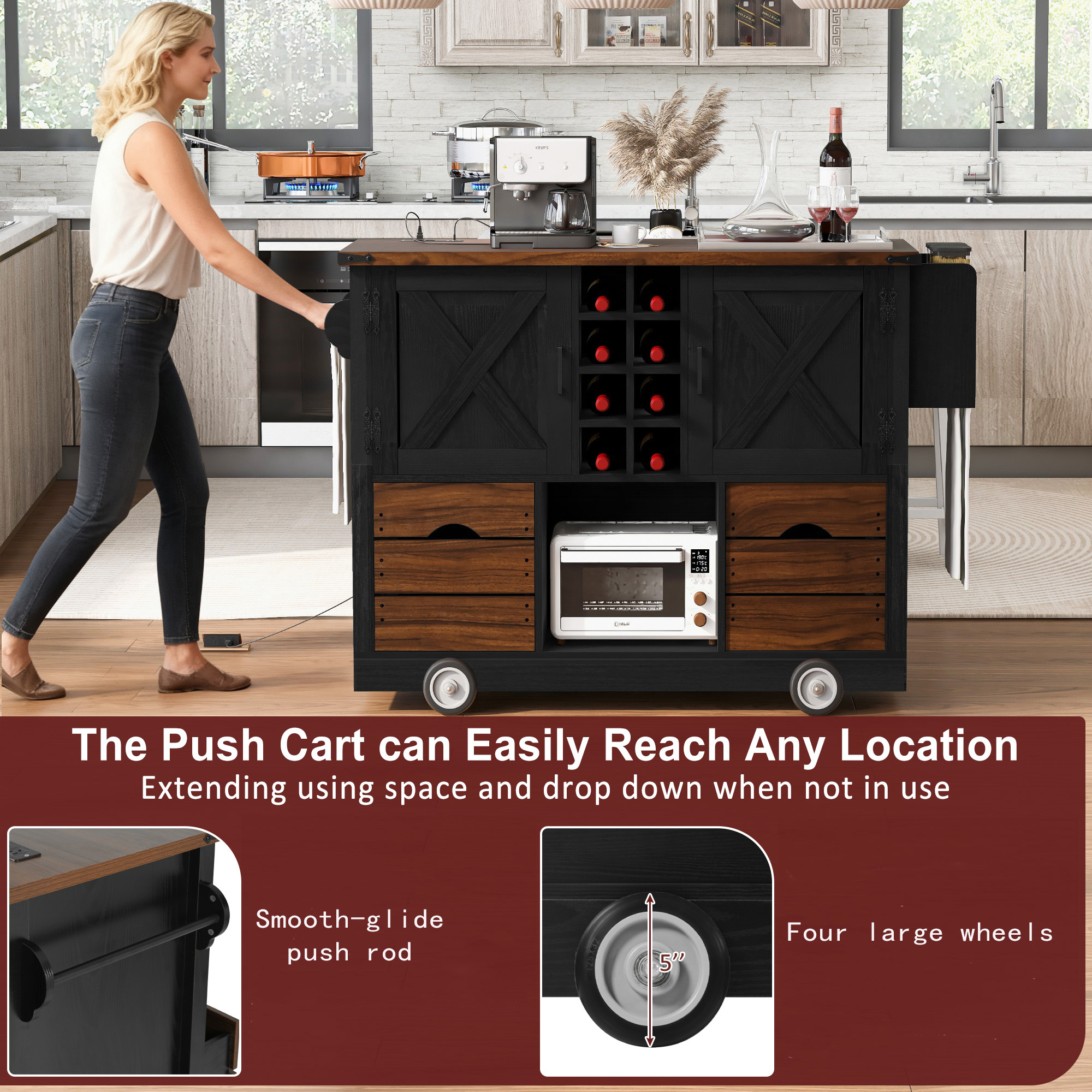 - [Mobile Kitchen Island] Our mobile kitchen island features four oversized 5-inch diameter casters. Wherever you need to go indoors, this cart effortlessly gets you there. Even in challenging outdoor environments, you can freely maneuver this cart to your destination.