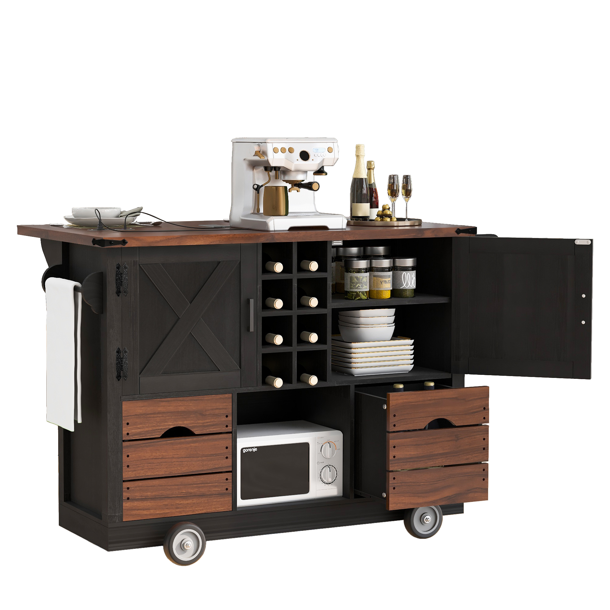 - [Convenient Charging Station] Say goodbye to messy charging cables and enjoy the convenience of the built-in charging station. This elegantly designed kitchen cart includes a sophisticated built-in power outlet, featuring 2 AC outlets, 1 USB port and 1 Type-C port to effortlessly meet all of your kitchen appliance power requirements. You can conveniently charge your coffee maker, juicer, and toaster on the countertop of this kitchen storage island.