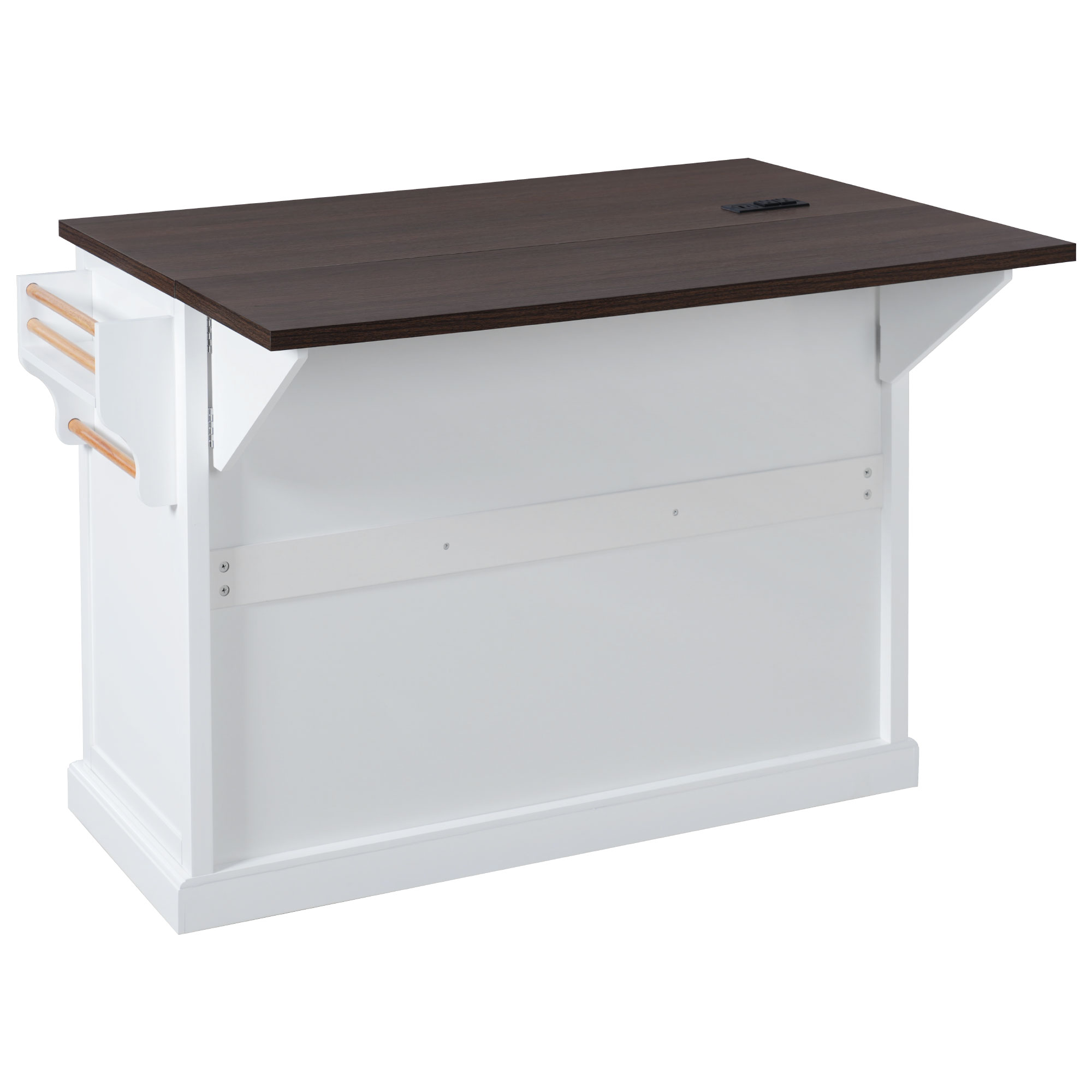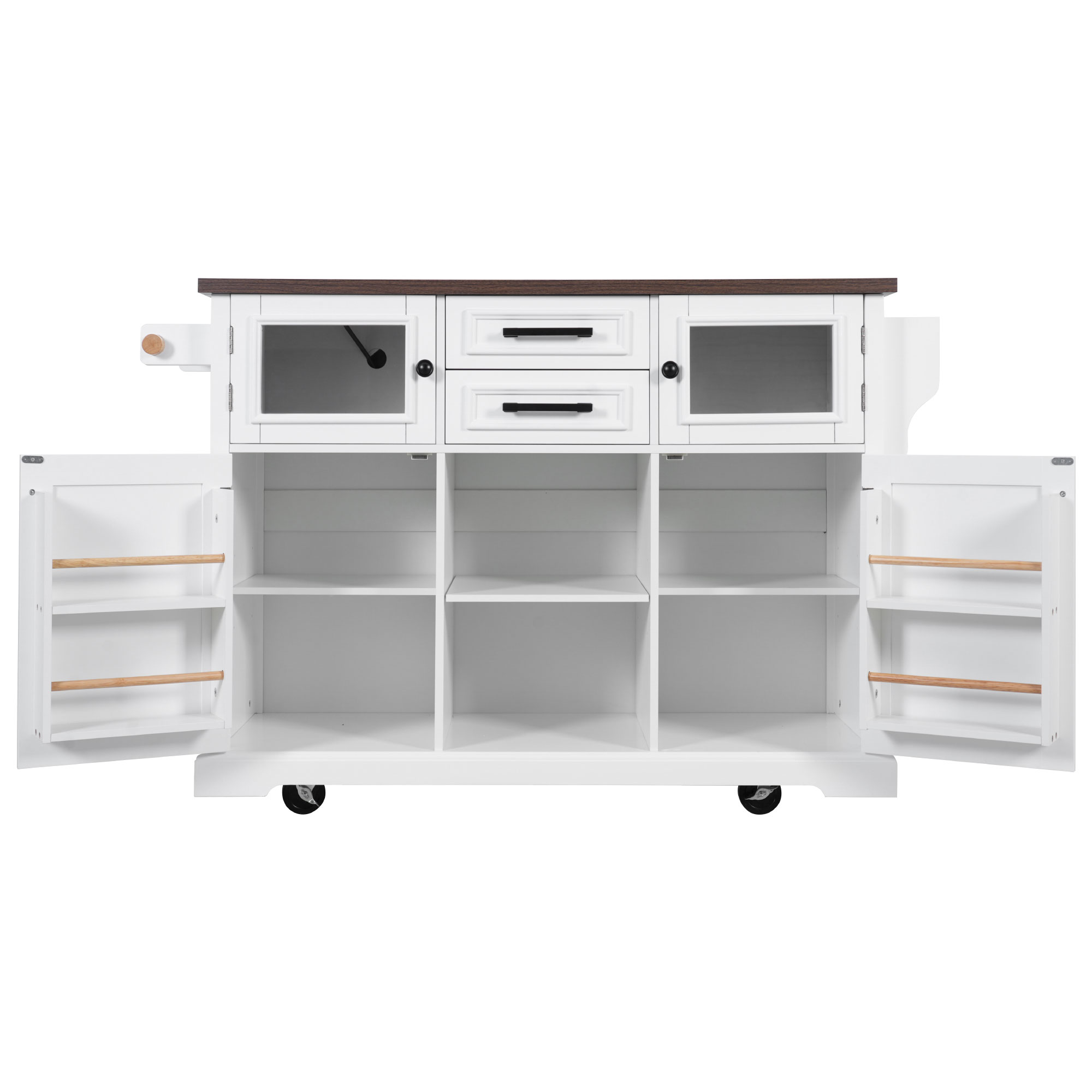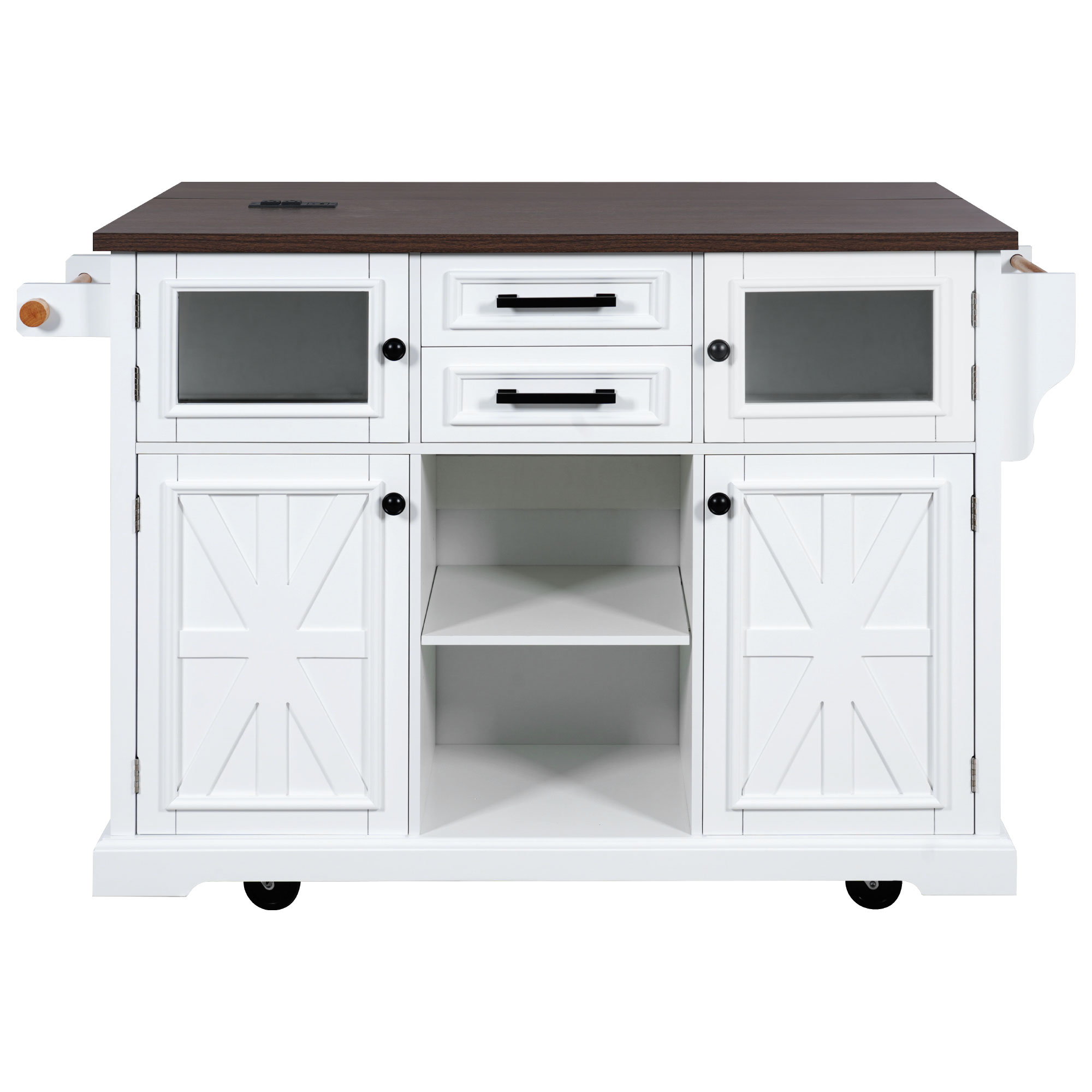 Product Name:K&K 54.9" Kitchen Island with Drop Leaf, Power Outlet, Kitchen Storage Cart with 4 Door Shelves, Cross Barn Doors & Visual Glass Door, Rolling Kitchen Island on 4 Wheels for Kitchen, Dining Room,White
