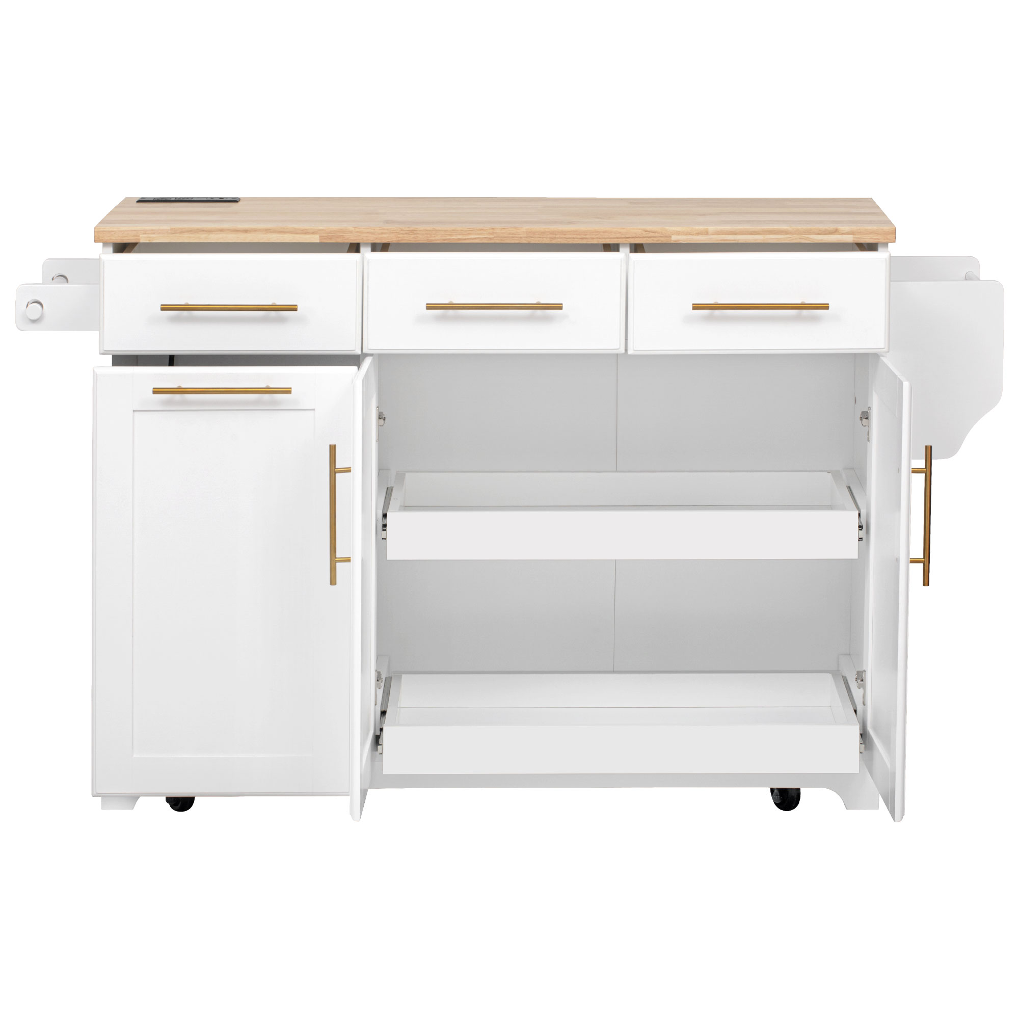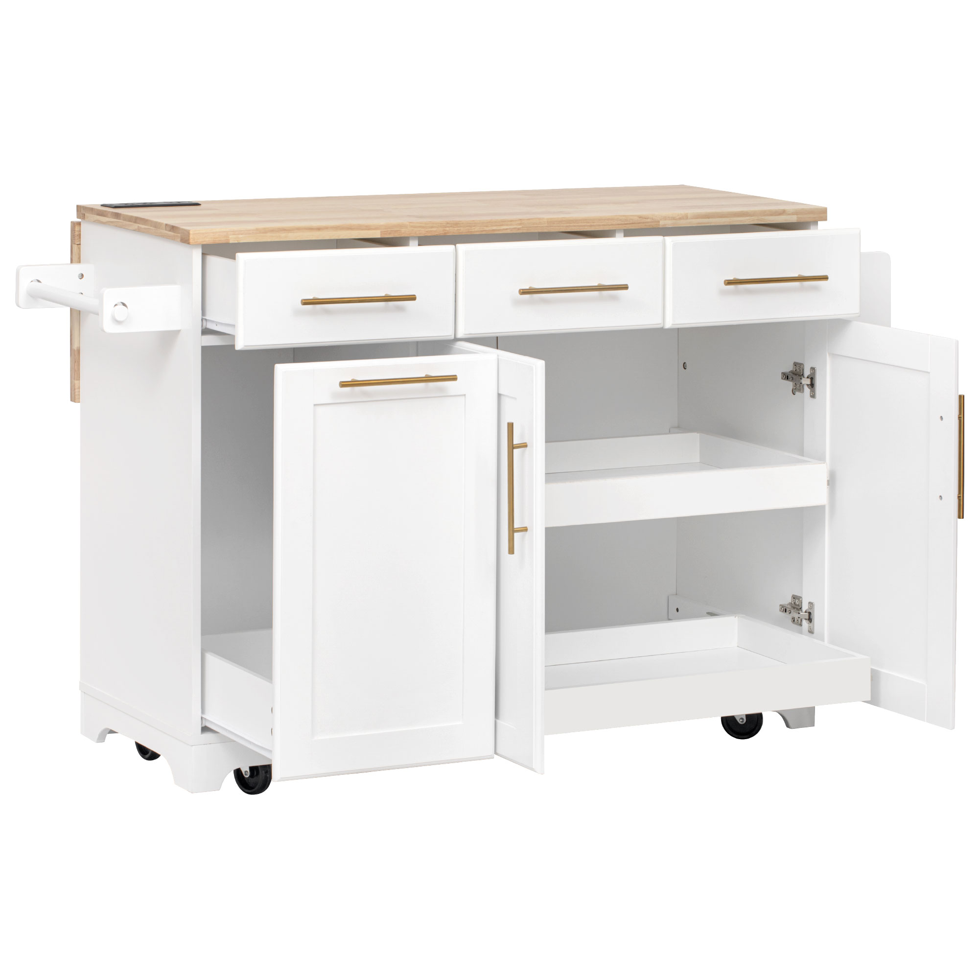 Decoration:Pull-out Cabinet Organizers & 10 Gallon Trash Can & Power Outlet & Rubber Wood table & Drop Leaf