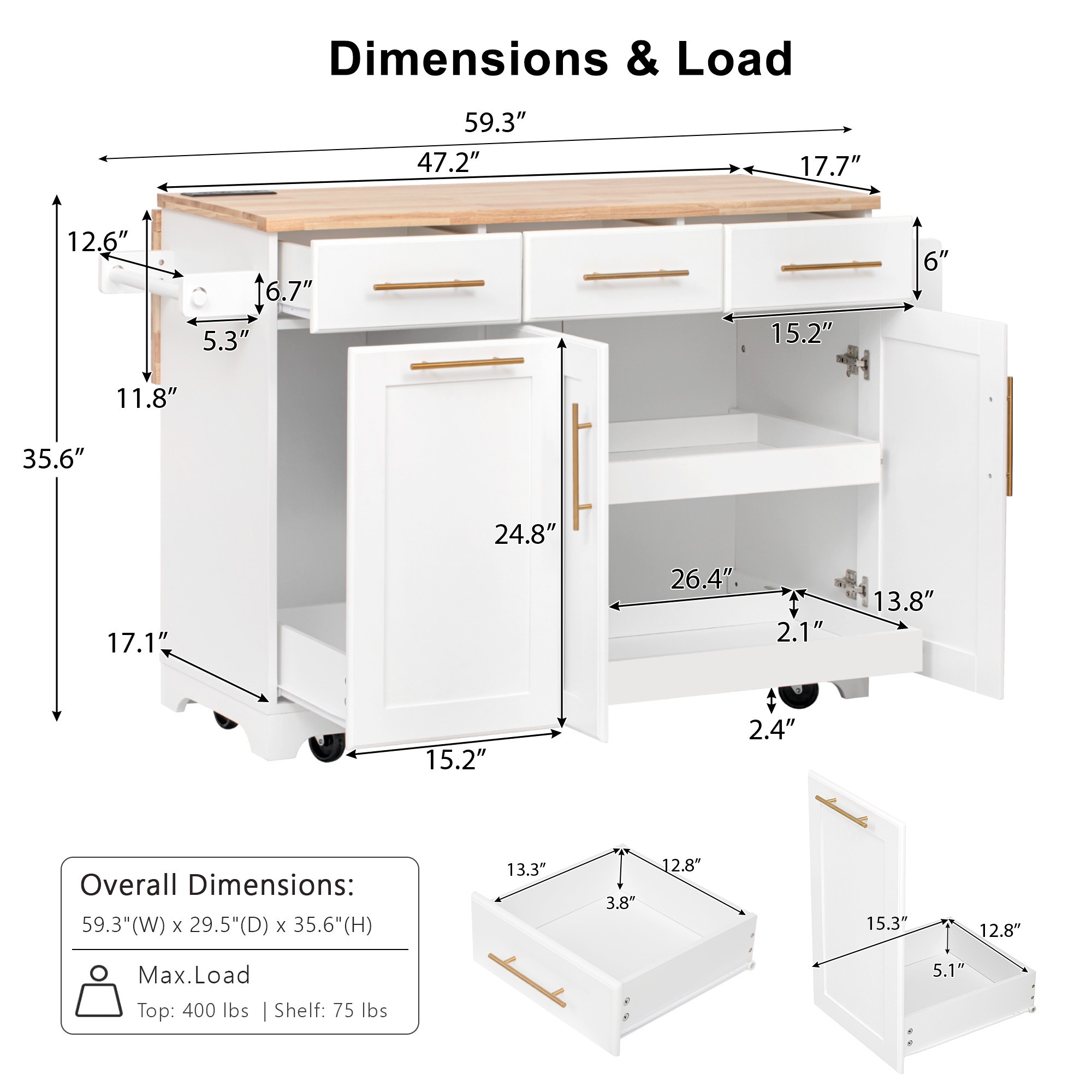 Product Name:K&K 59.3" Kitchen Island with Storage 2 Pull Out Cabinet Organizers & Rubber Wood Drop Leaf, Rolling Kitchen Island with Trash Can Storage, Power Outlet, Spice & Towel Rack for Kitchen, Dining, White