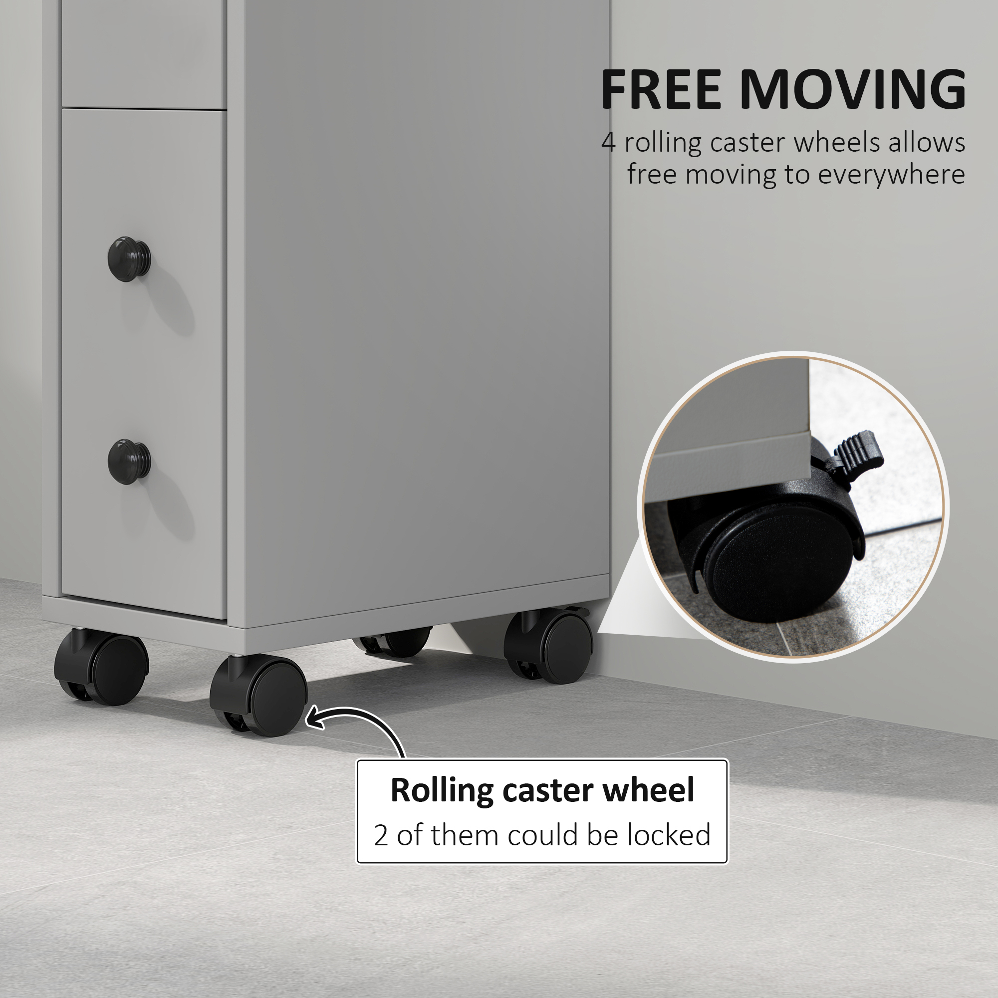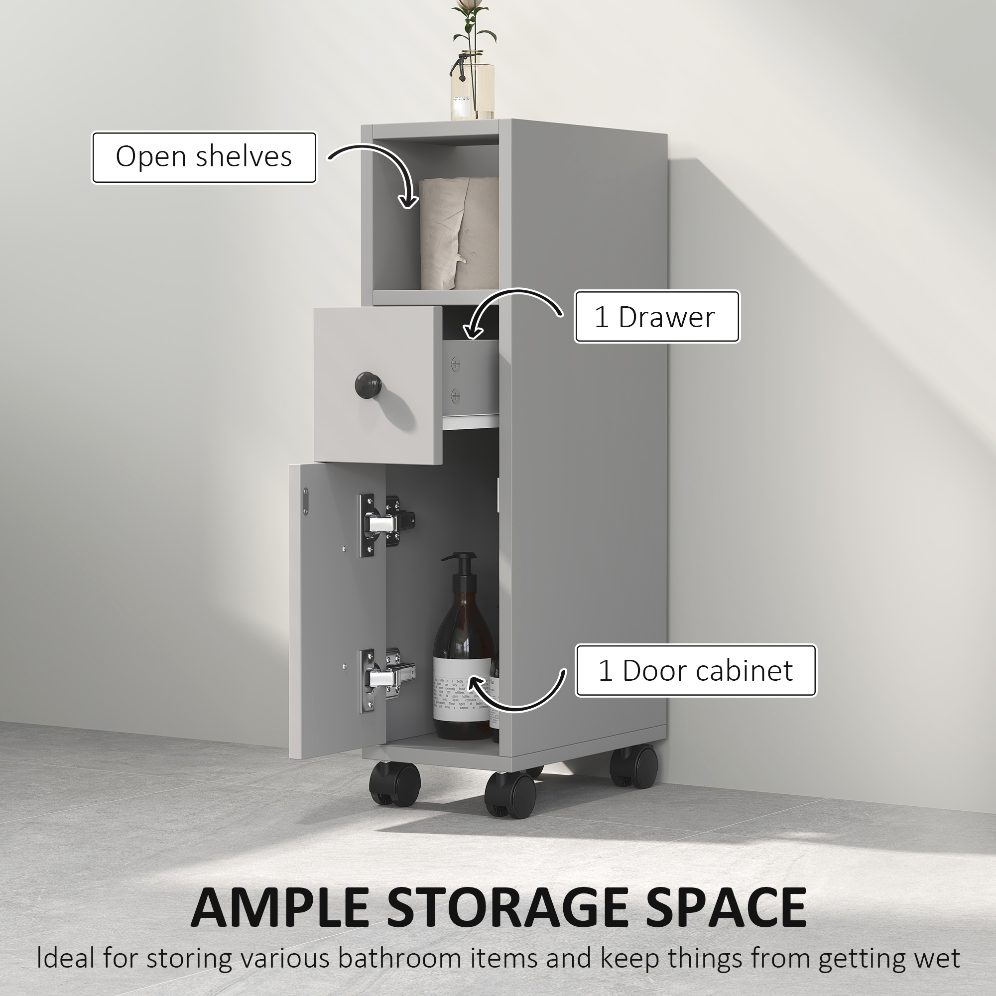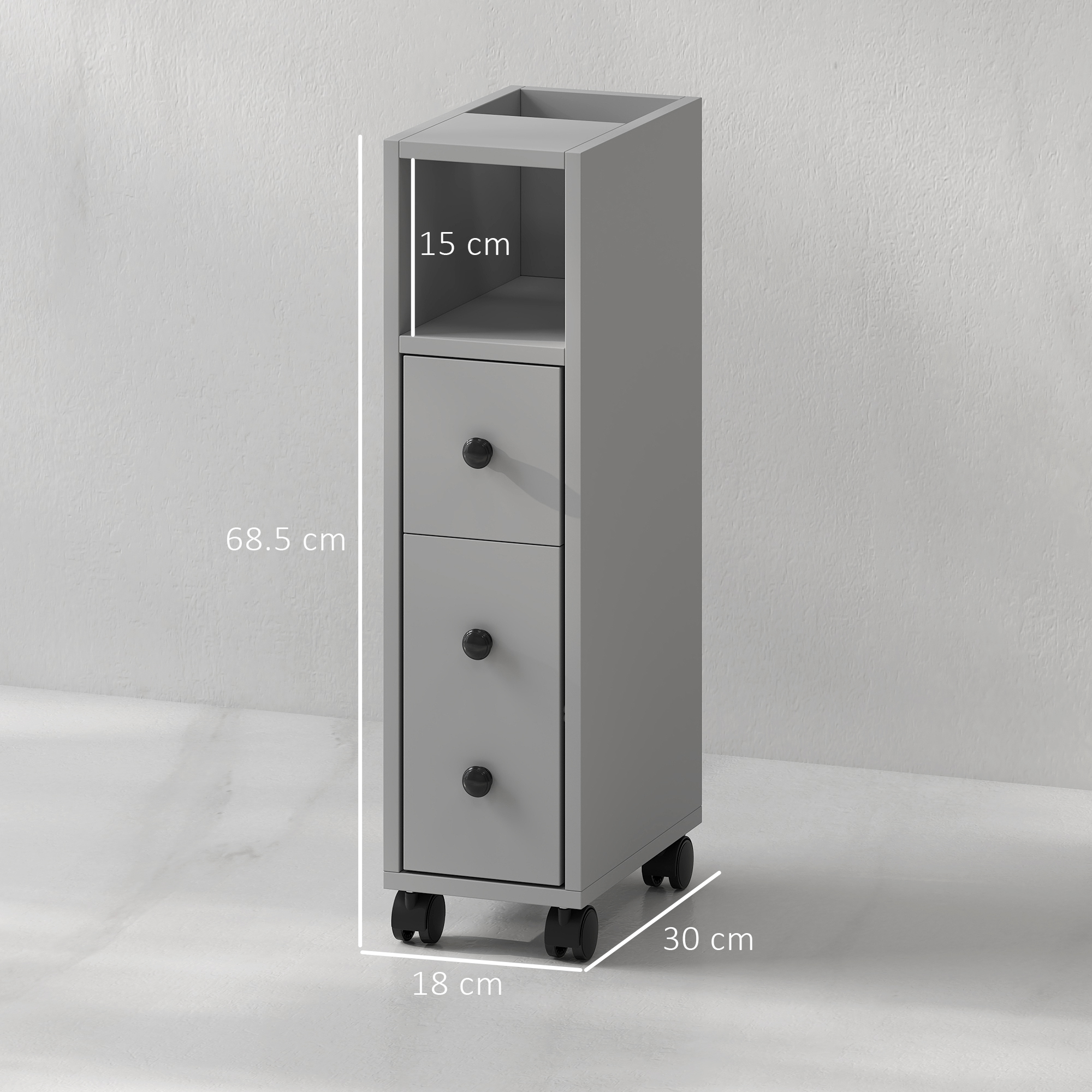 Expand your storage space beautifully with this bathroom cabinet from kleankin. A design which focuses on efficiency and style for homes, it is made with a large bathroom cabinet, a top drawer and two open compartments, giving you a decent amount of storage room. The frame is made from robust particle board to ensure it's suitable for everyday use and its slimline sizing will fit into narrow spots quite easily. Grey all over for a fresh appeal, it's equipped with black handles for a smart contrasting look and is finished with wheels for easy movement.