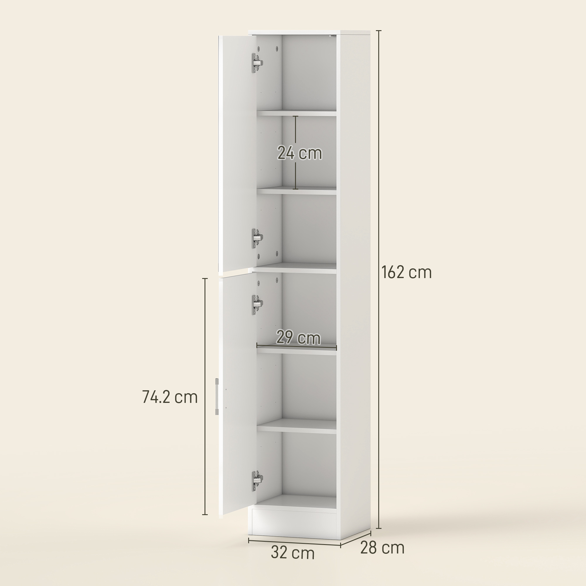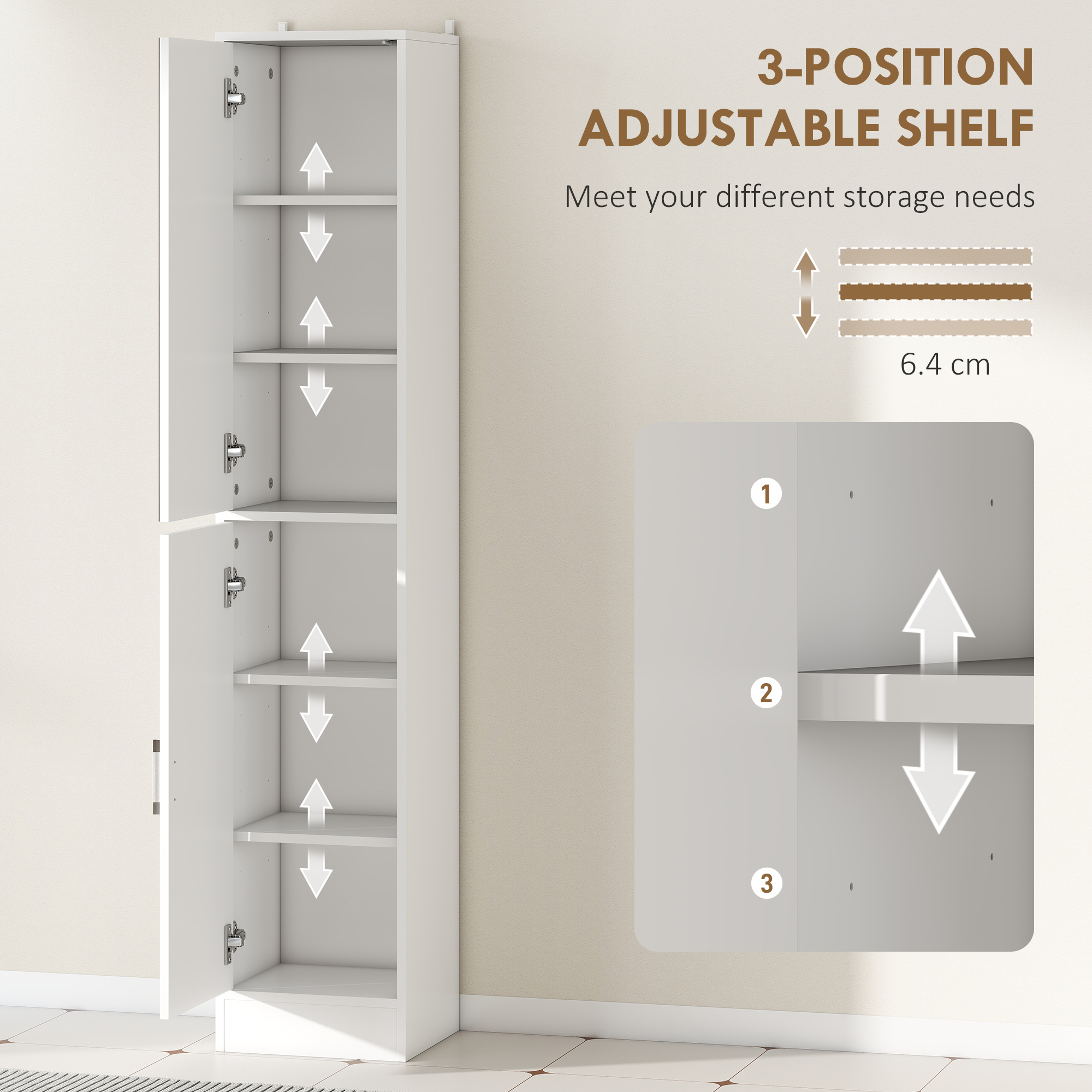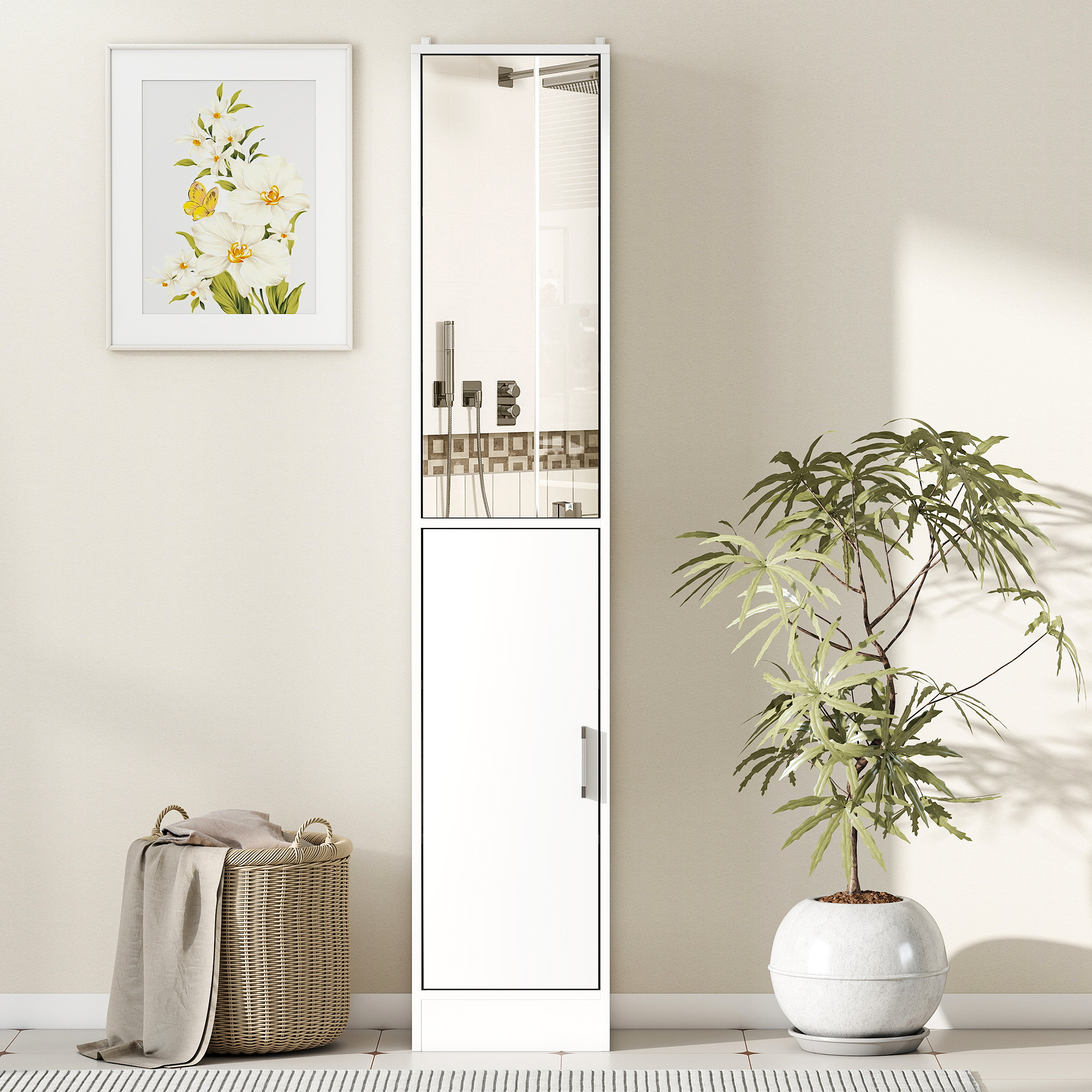 A beautiful and tidy bathroom starts with this slimline cabinet from kleankin. Inside, there are five shelves which offer plenty of storage - separate sections give each family/flat member their own individual space. Two-cupboard design comes with two doors: top is fitted with a mirror so you can get ready, with push-open operation to open/close easily; bottom is fitted with handle. Made from particle board, it's robust and suitable for everyday use, finished with safe anti-tipping straps.