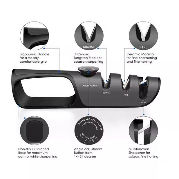 ✨ Adjustable Knife Sharpener: Professional 3-1 knife sharpener with built-in angle adjustment from 14 to 24 degrees, offering the correct blade angle to expertly maintain the cutting edges of your knives (includes a unique ceramic sharpening blade slot designed to sharpen kitchen scissors).