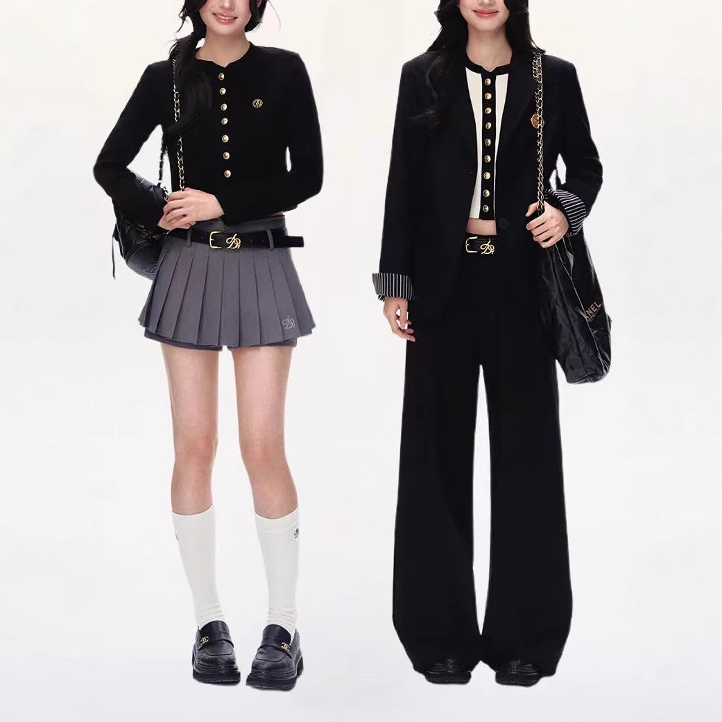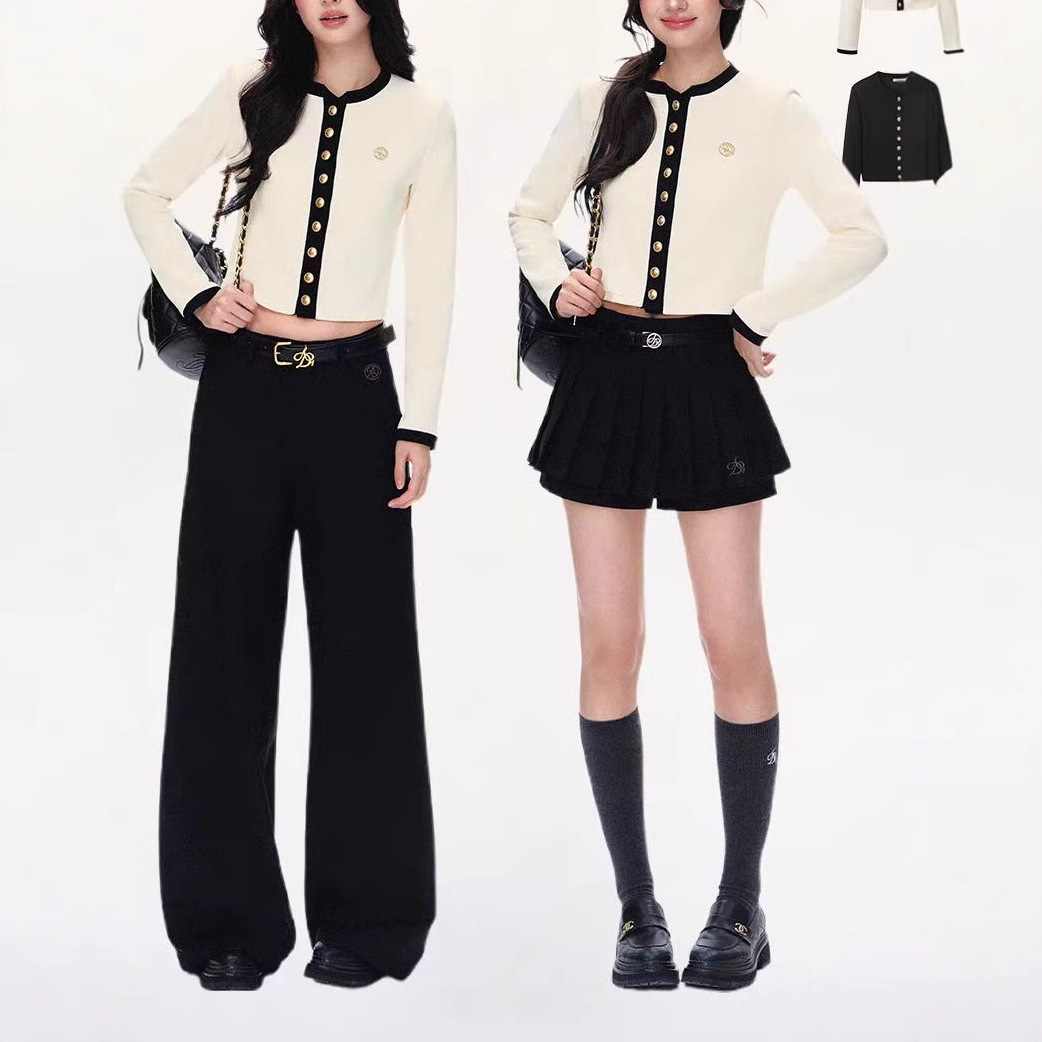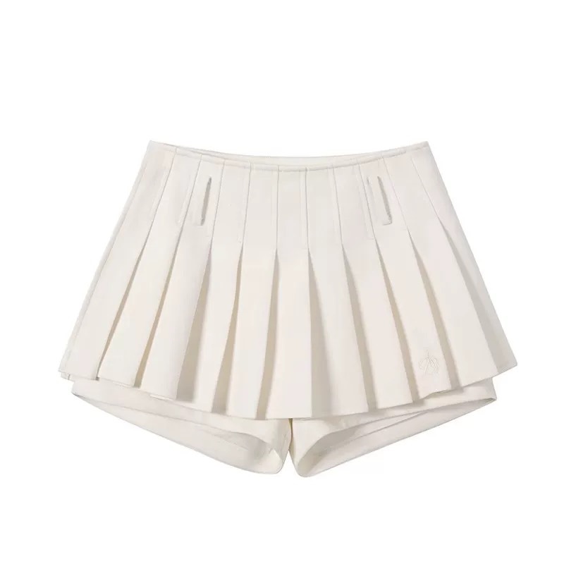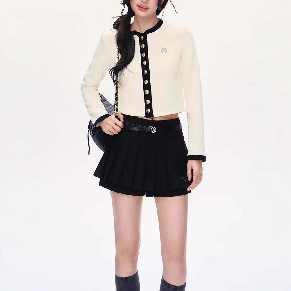 Color: creamy-white top, black top, black pleated skirt, gray pleated skirt, white pleated skirt