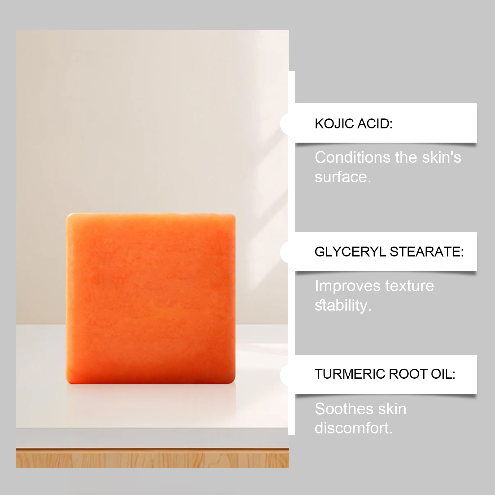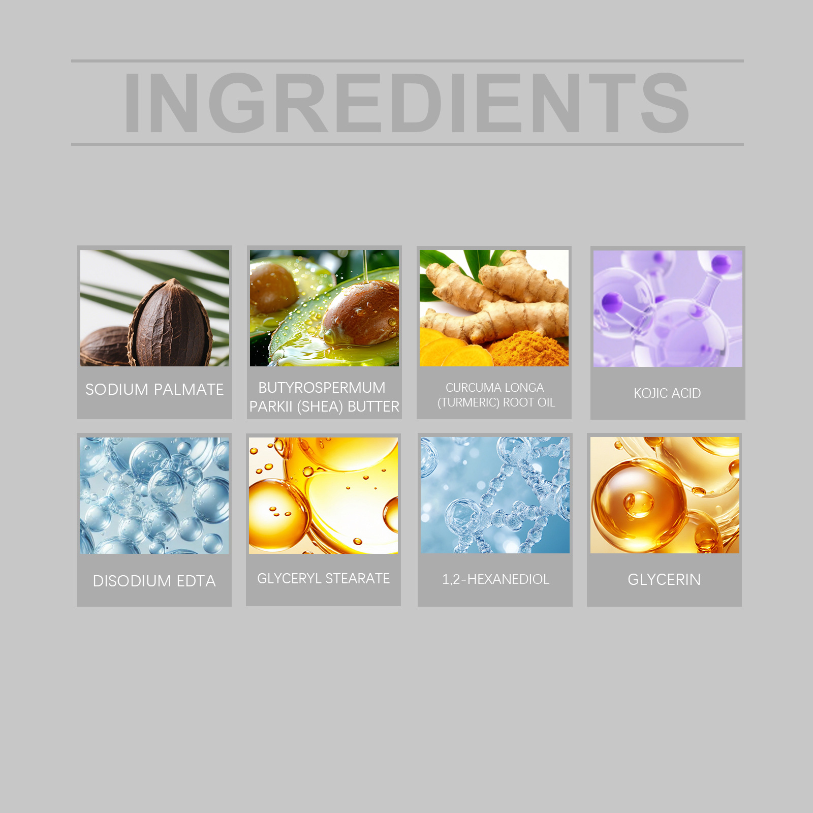 Ingredients: sodium palmitate, glycerol stearate, shea butter, glycerol, 1,2- hexanediol, disodium EDTA, kojic acid and turmeric root oil.