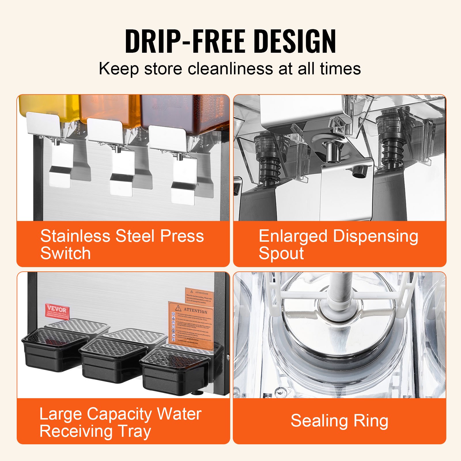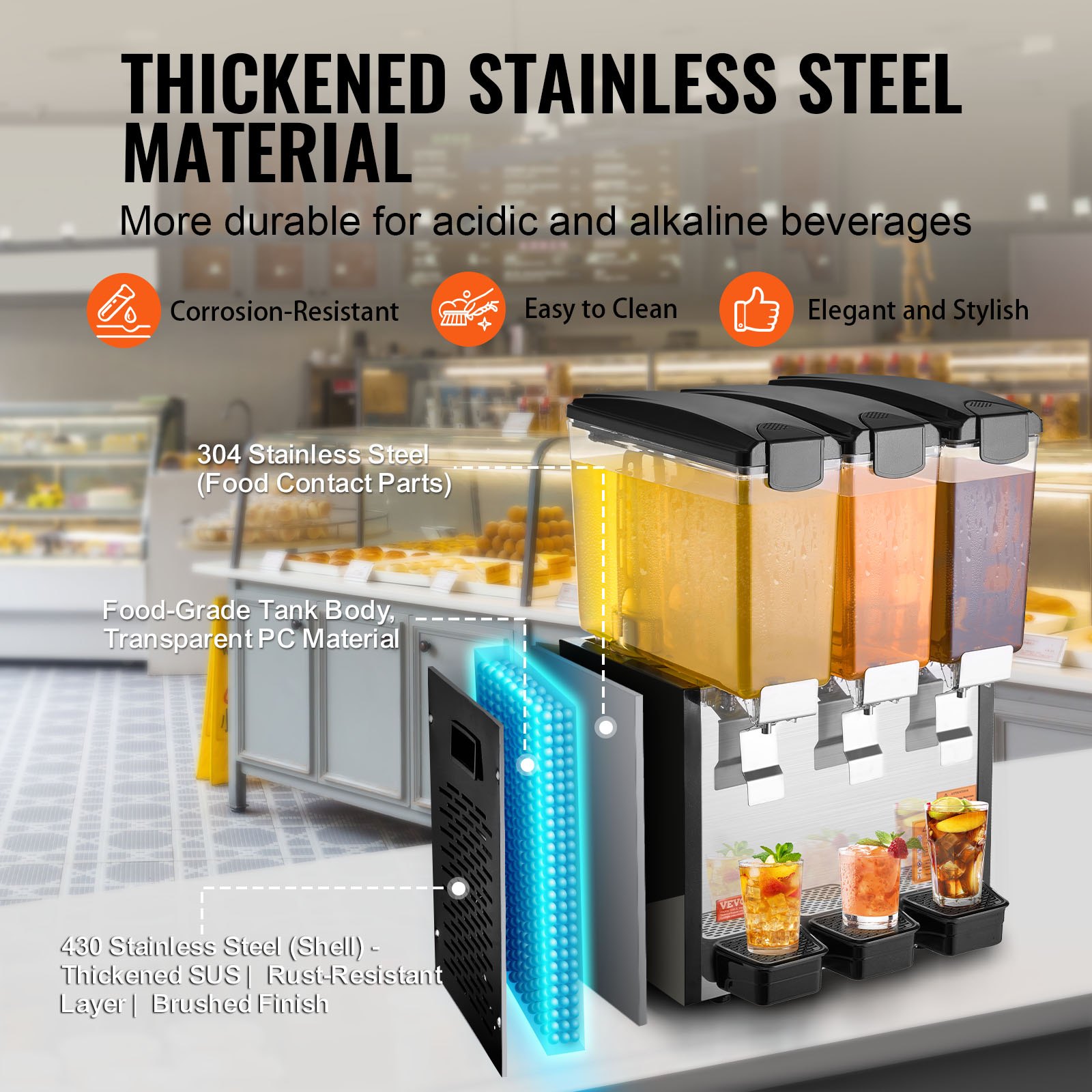 VEVOR kommerzieller Getränkespender mit 3 Tanks, Saftspender 10 L (pro Tank), 440 W Edelstahl Eistee-Getränkeautomat mit 7_12 °C Kühltemperatur, für Kaltgetränke Restaurant Bar Party Buffet Catering
