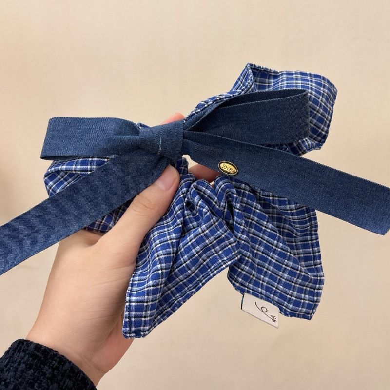 Color: 1# Denim hair band-plaid ribbon, 2# Plaid hair band-Denim ribbon, 3# Plaid large intestine ring-blue edge, 4# Blue Large intestine ring-plaid edge