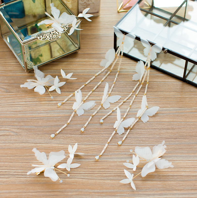 Korean brides long flowers, butterflies, butterflies, Juan, yarn, hairpin, ear and ear, ear, ear, ear and ear, wedding and wedding wedding