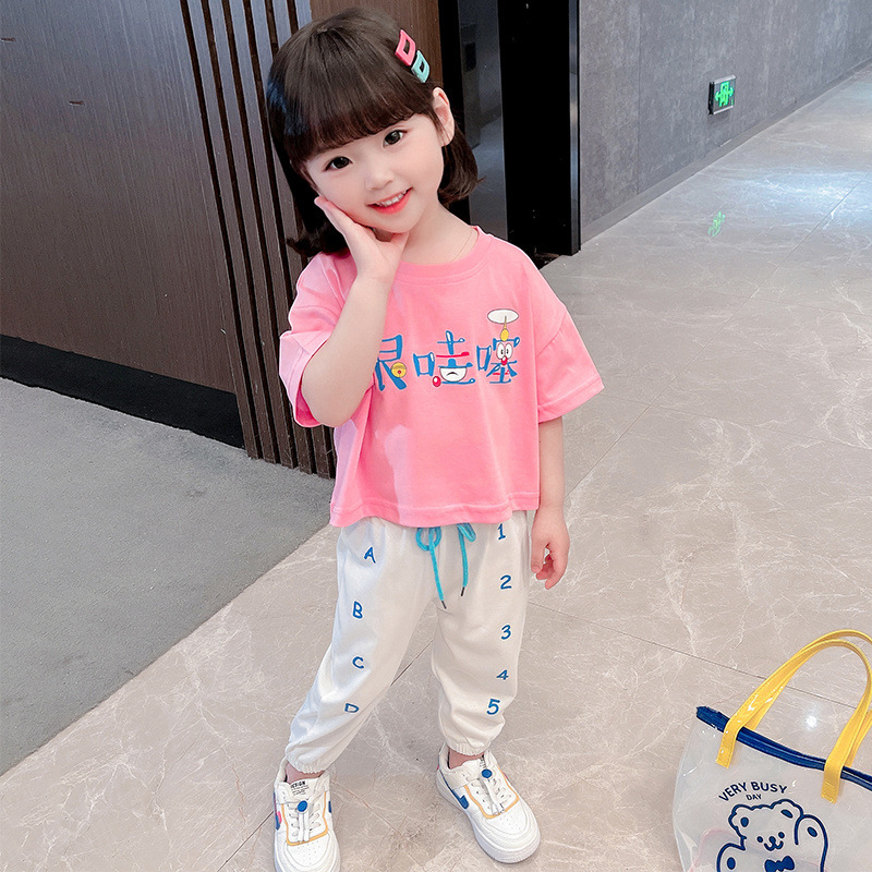 Korean children"s summer girls" suit new summer baby printed short sleeve T-shirt children"s sports pants