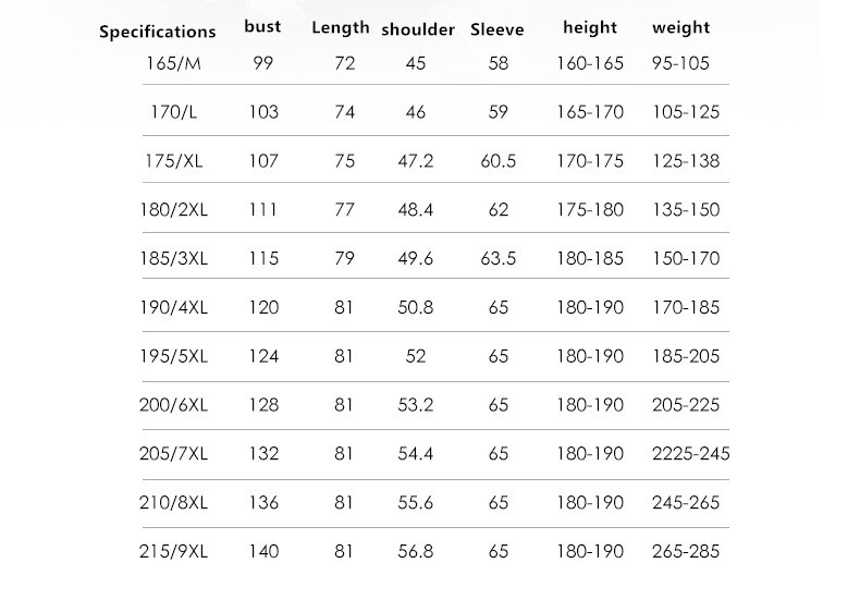 Size: 165 / m, 170 / L, 175 / XL, 180 / 2XL, 185 / 3XL, 190 / 4XL, 195 / 5XL, 200 / 6xl