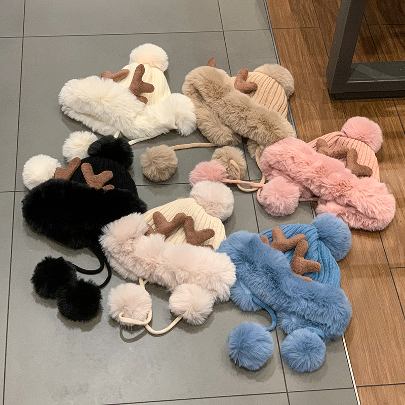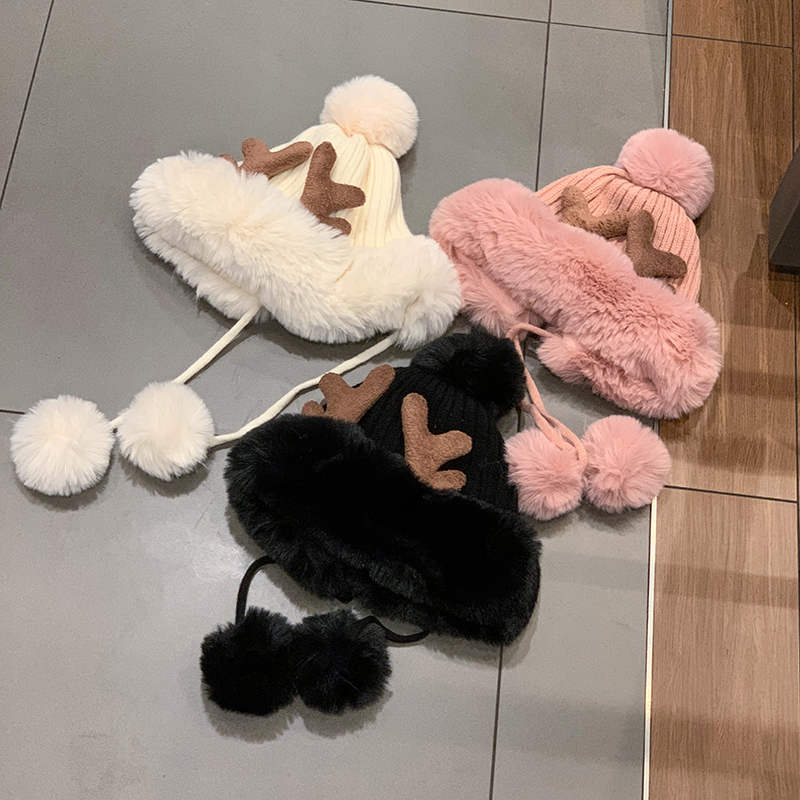 Color: beige/antlers ear protector plush hat, white/antlers ear protector plush hat, khaki/antlers ear protector plush hat, pink/antlers ear protector plush hat, blue/antlers ear protector plush hat, black/antlers ear protector plush hat, red/antlers ear protector plush hat