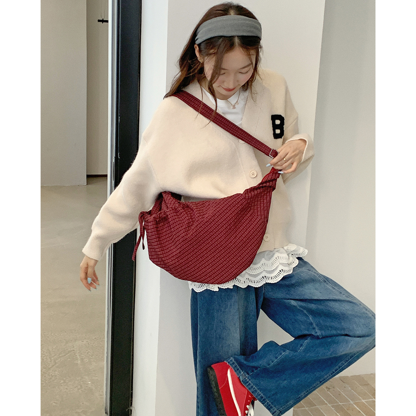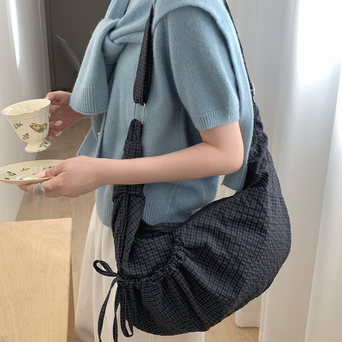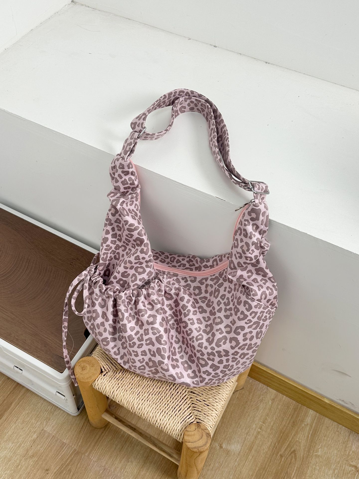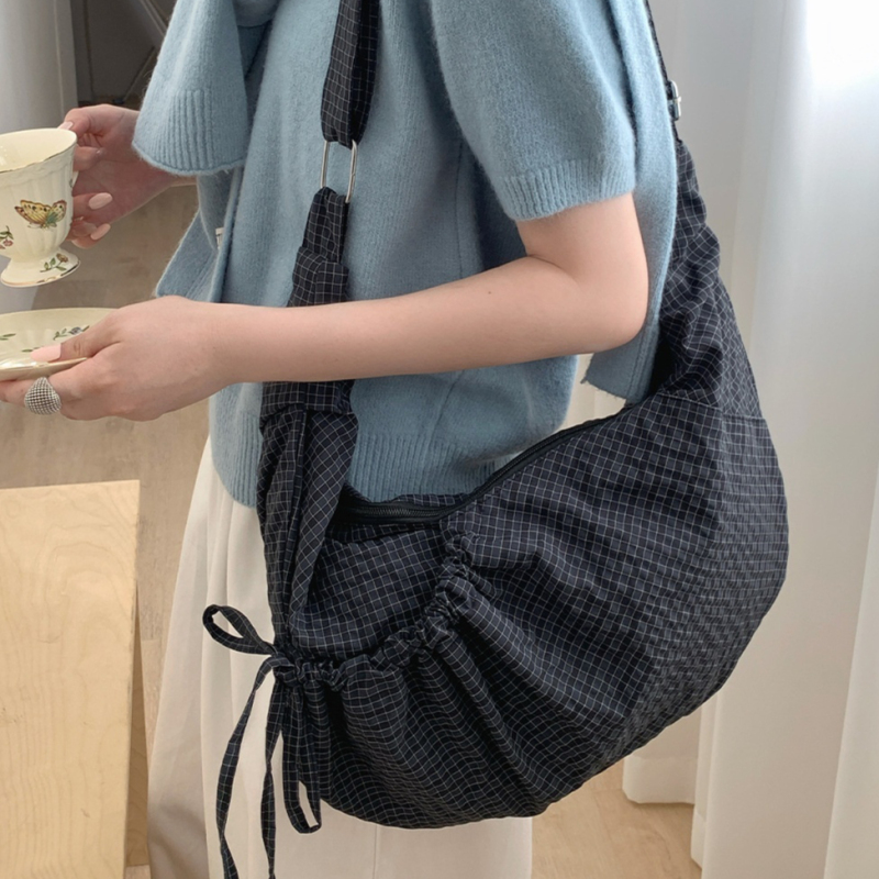 Colors: Pleated drawstring horn bag – quilted pink; pleated drawstring horn bag – quilted black; pleated drawstring horn bag – black-brown leopard print; pleated drawstring horn bag – pink leopard print; pleated drawstring horn bag – brown smiley face leopard print; pleated drawstring horn bag – brown-green leopard print; small-check pleated drawstring horn bag – black-and-blue check; small-check pleated drawstring horn bag – light-gray check; small-check pleated drawstring horn bag – purplish-red check; small-check pleated drawstring horn bag – light-green check