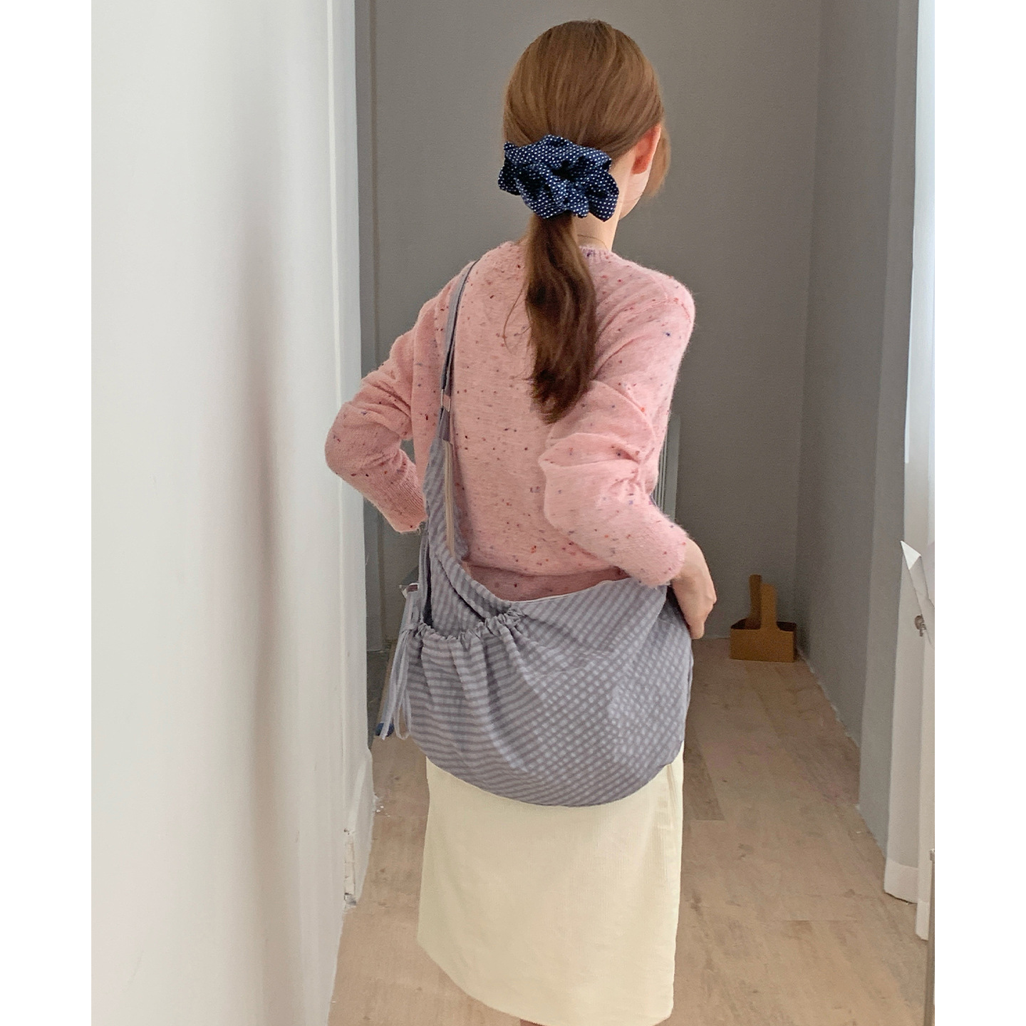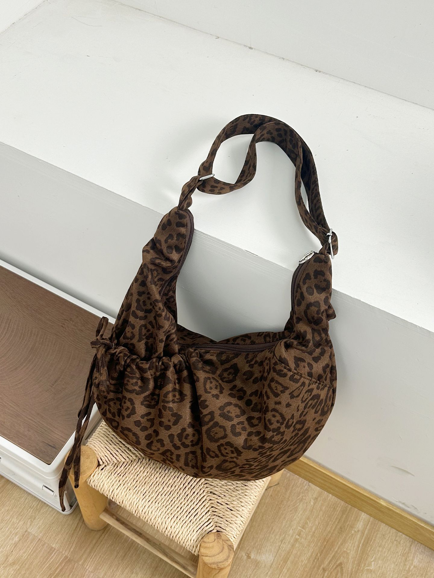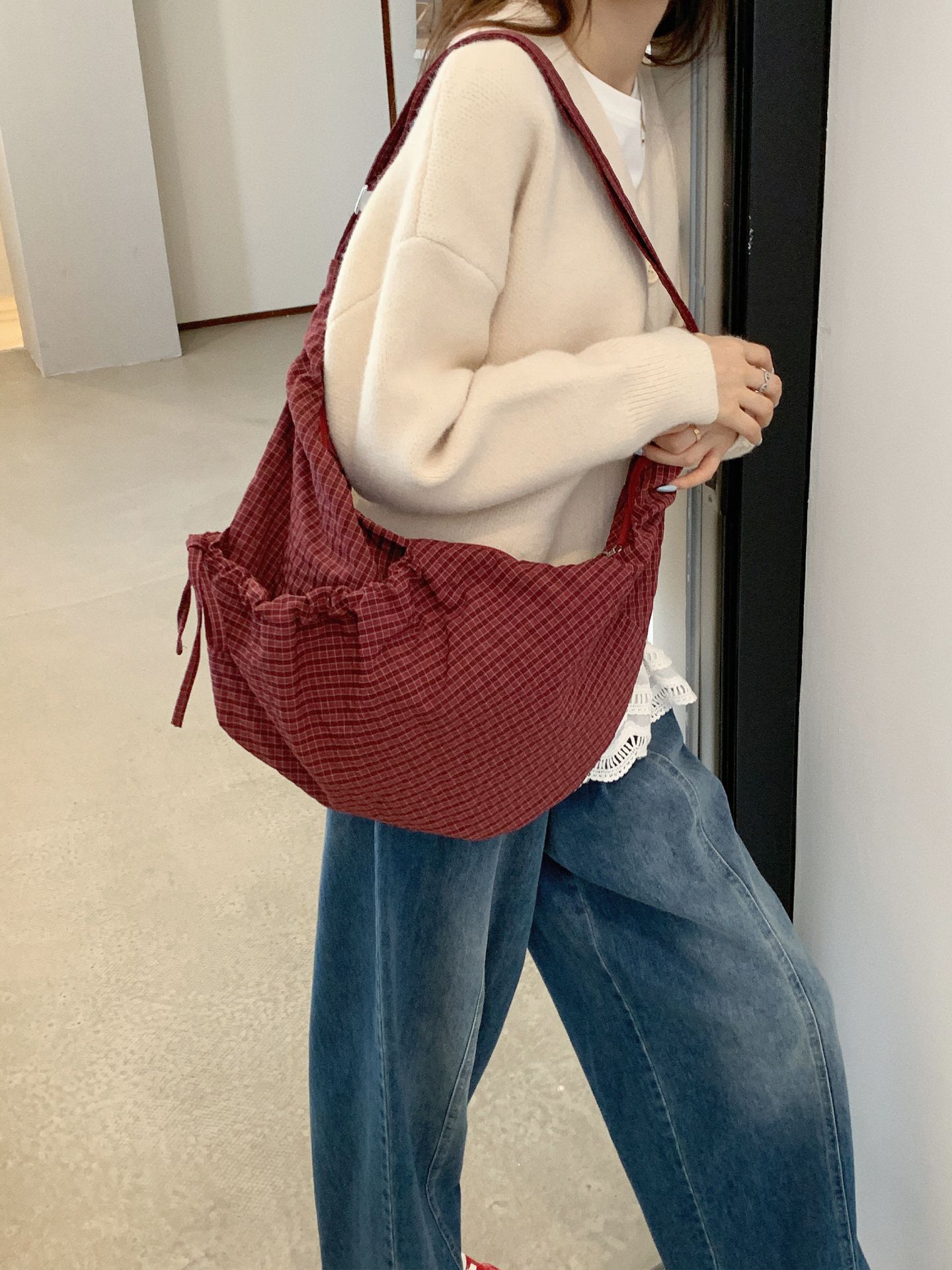 Colors: Pleated drawstring horn bag – quilted pink; pleated drawstring horn bag – quilted black; pleated drawstring horn bag – black-brown leopard print; pleated drawstring horn bag – pink leopard print; pleated drawstring horn bag – brown smiley face leopard print; pleated drawstring horn bag – brown-green leopard print; small-check pleated drawstring horn bag – black-and-blue check; small-check pleated drawstring horn bag – light-gray check; small-check pleated drawstring horn bag – purplish-red check; small-check pleated drawstring horn bag – light-green check