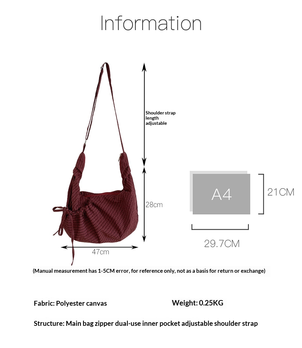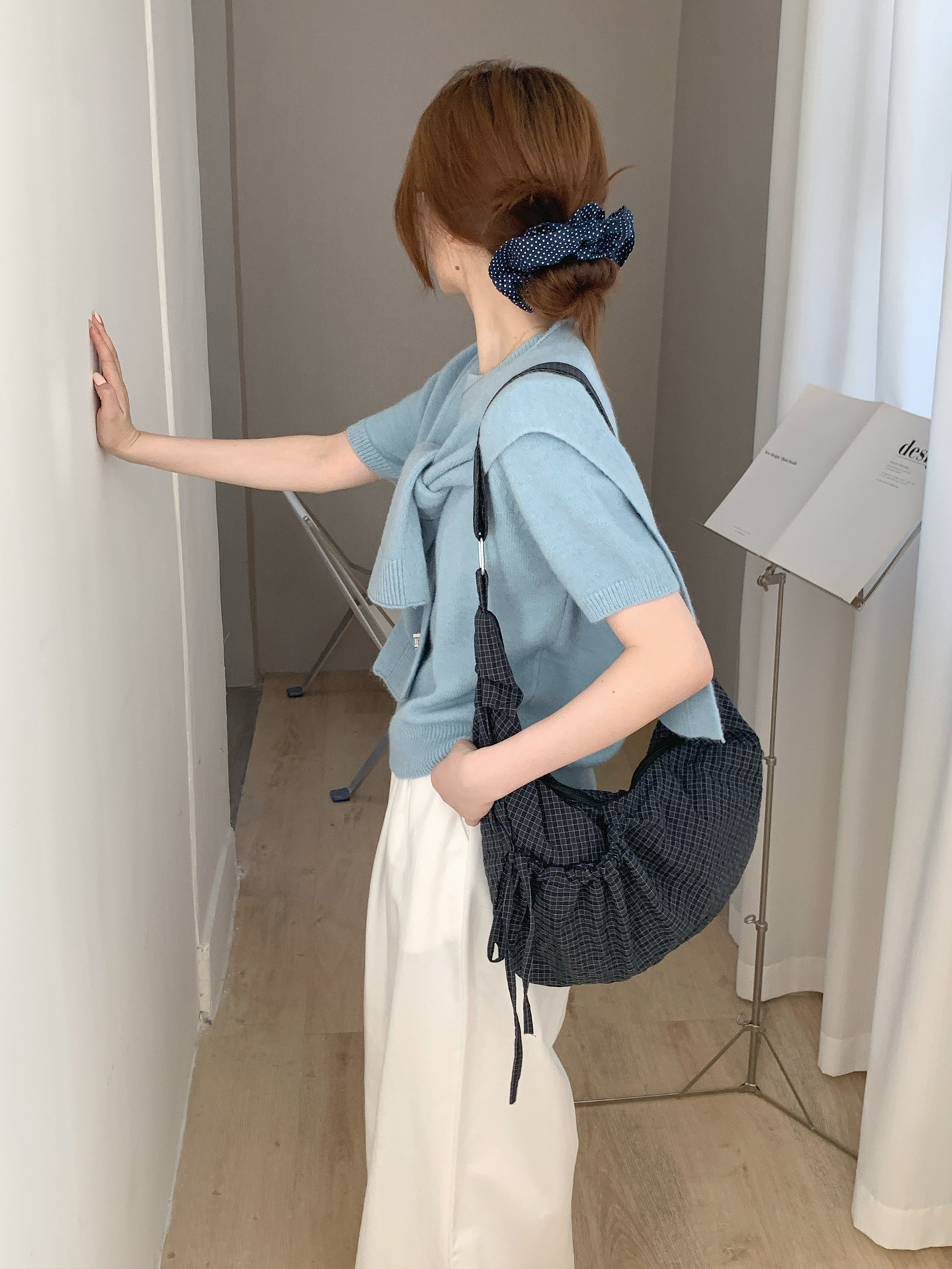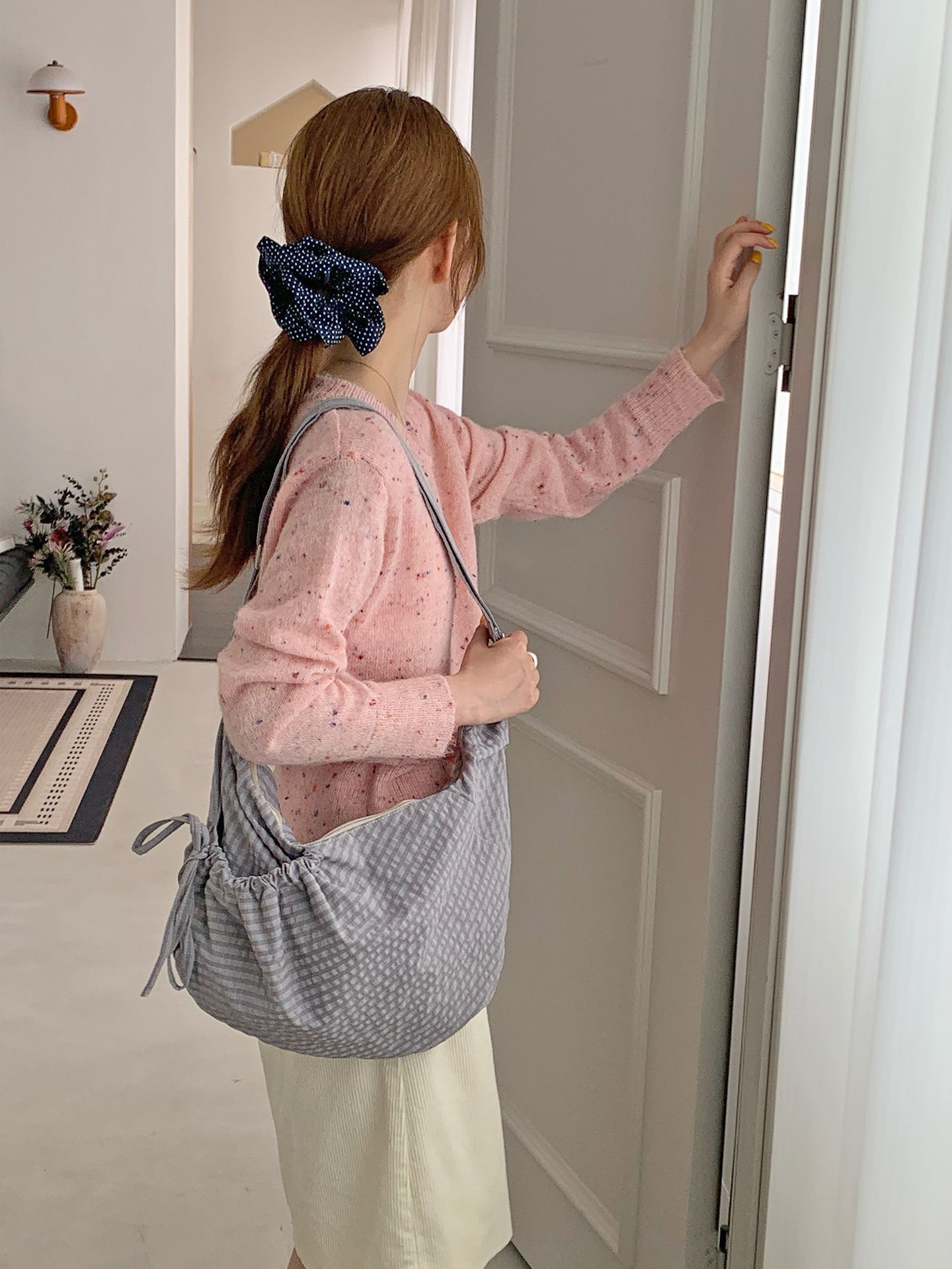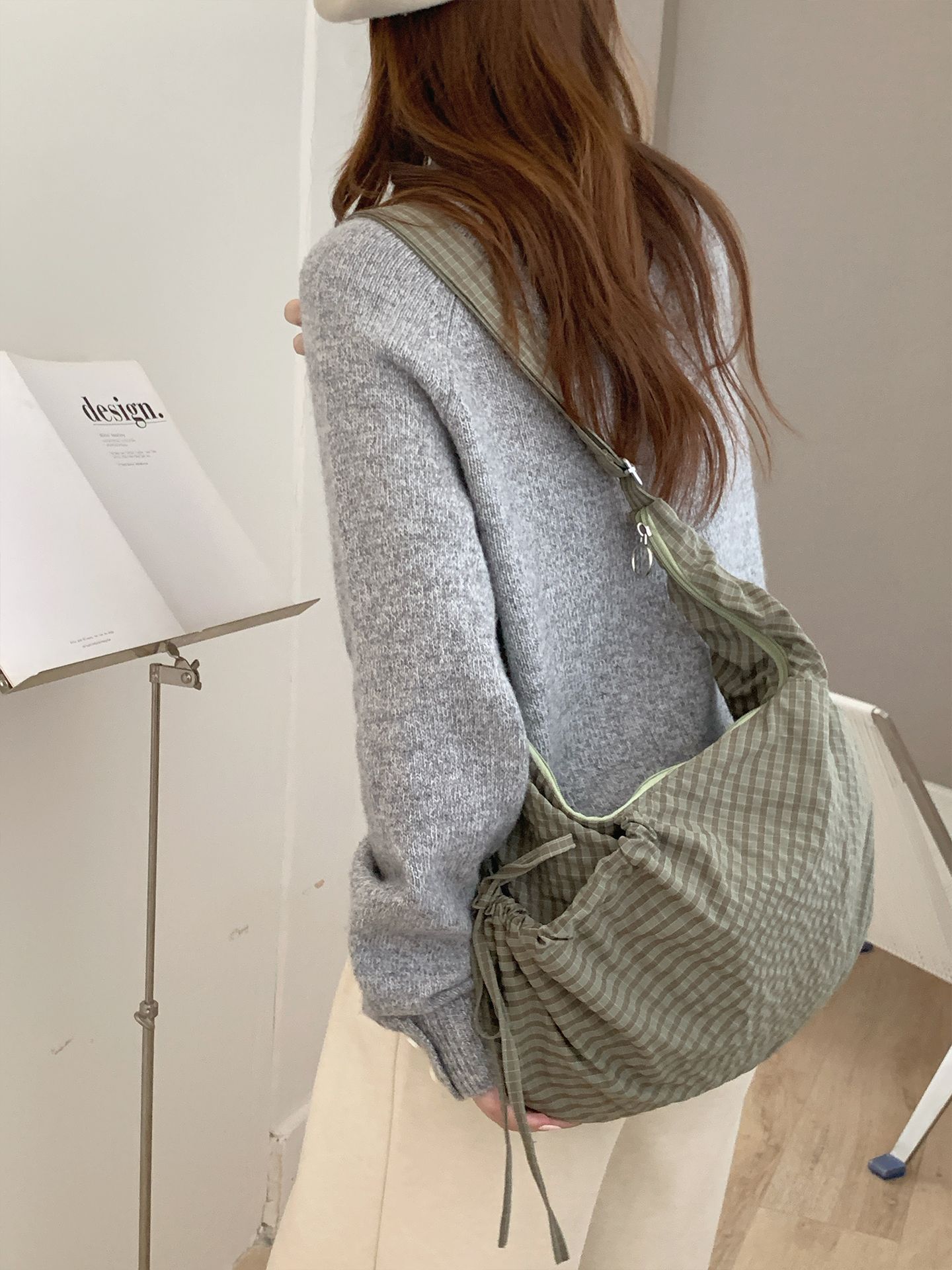 Colors: Pleated drawstring horn bag – quilted pink; pleated drawstring horn bag – quilted black; pleated drawstring horn bag – black-brown leopard print; pleated drawstring horn bag – pink leopard print; pleated drawstring horn bag – brown smiley face leopard print; pleated drawstring horn bag – brown-green leopard print; small-check pleated drawstring horn bag – black-and-blue check; small-check pleated drawstring horn bag – light-gray check; small-check pleated drawstring horn bag – purplish-red check; small-check pleated drawstring horn bag – light-green check