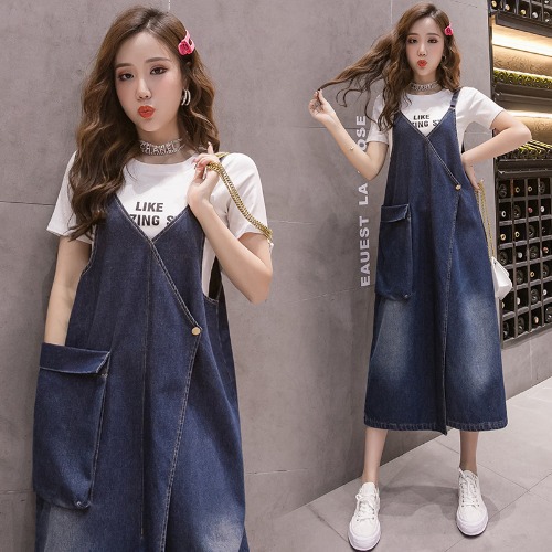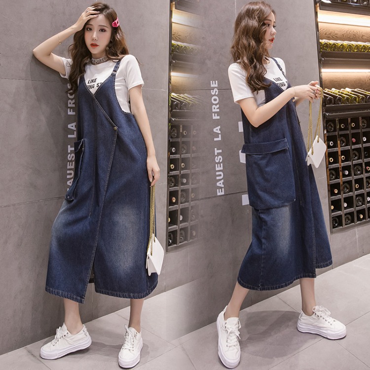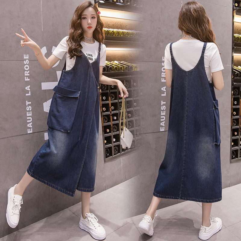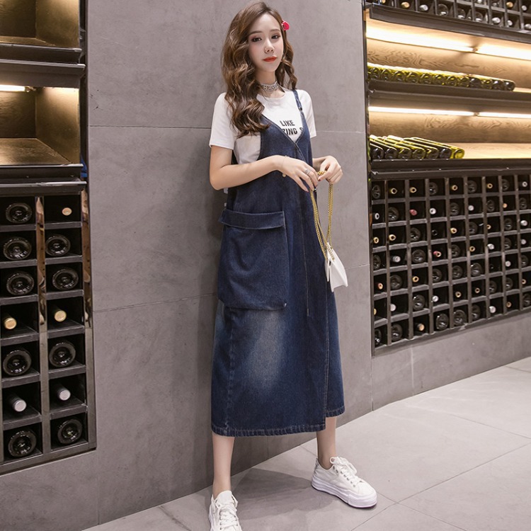 Korean Style Loose Casual Denim Suspender Skirt Mid-length