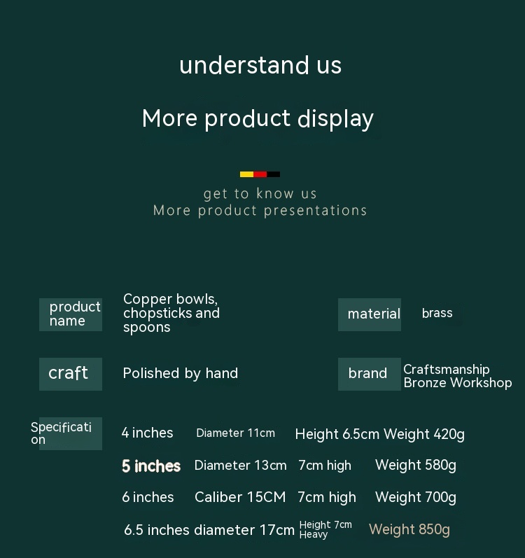 Specifications: 5-inch Korean brass bowl [polishing], 4-inch Korean brass bowl [frosted], 6-inch Korean brass bowl [polishing], 6.5-inch Korean brass bowl [polishing], 4-inch bowl chopsticks, 4-inch Bowl Spoon, 4-inch bowl chopsticks spoon, 5-inch bowl chopsticks, 5-inch bowl chopsticks, 6-inch bowl chopsticks, 6-inch Bowl Spoon, 6-inch bowl chopsticks, 6.5-inch bowl chopsticks, 6.5 inch Bowl Spoon, 6 inch bowl chopsticks spoon