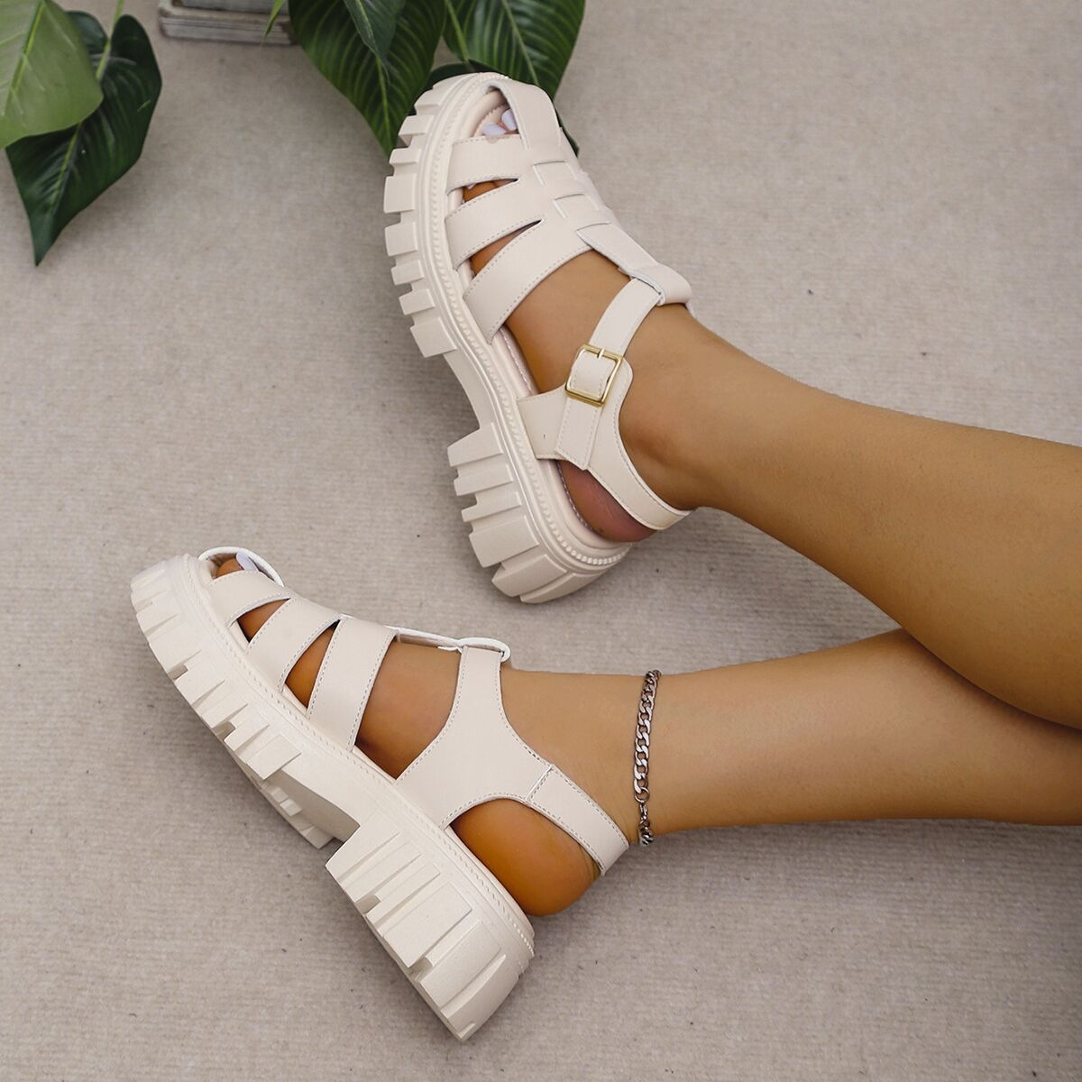 Korean Style Round Toe Ankle-strap Buckle Closed Toe Flat Hollowed