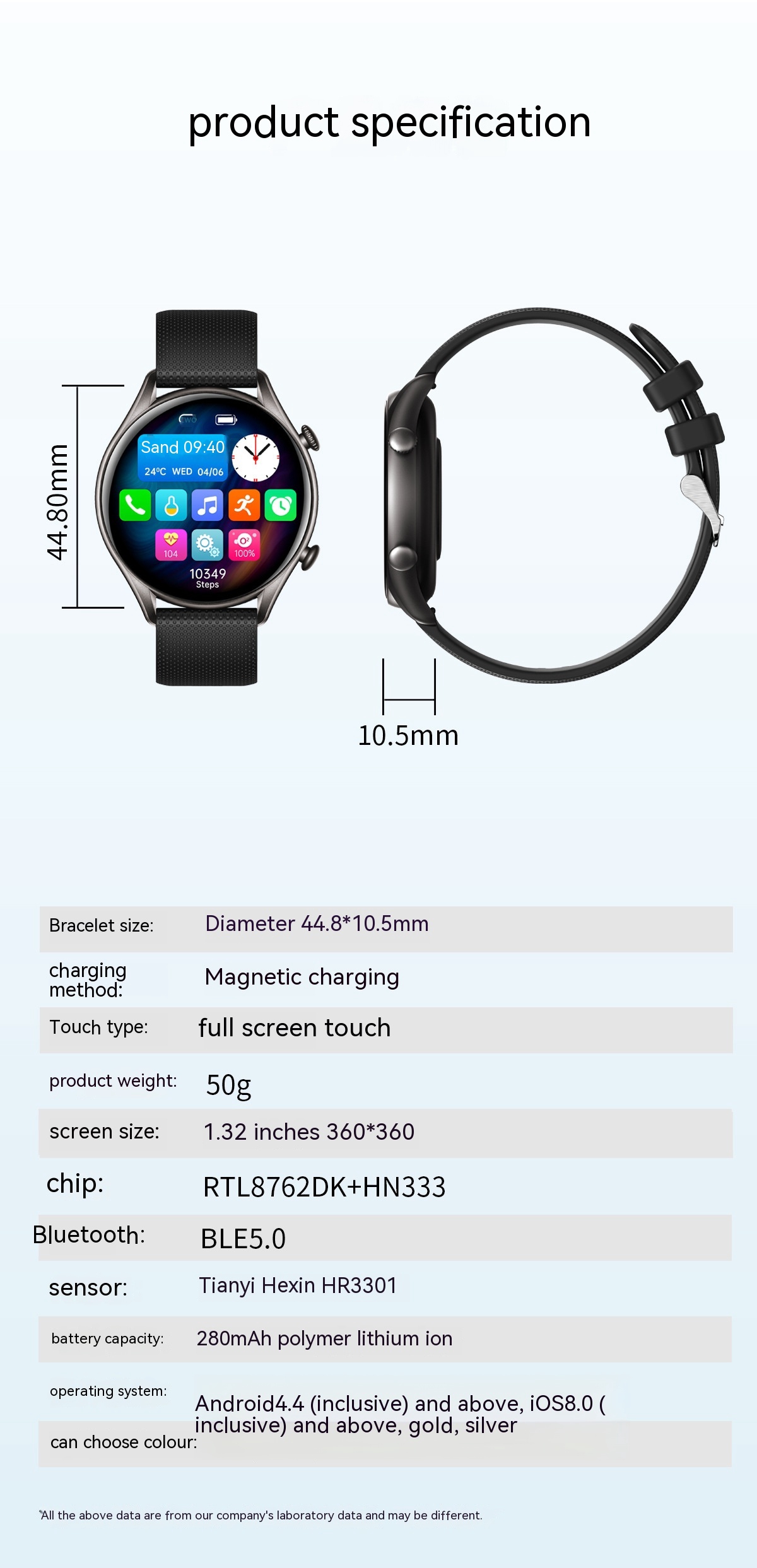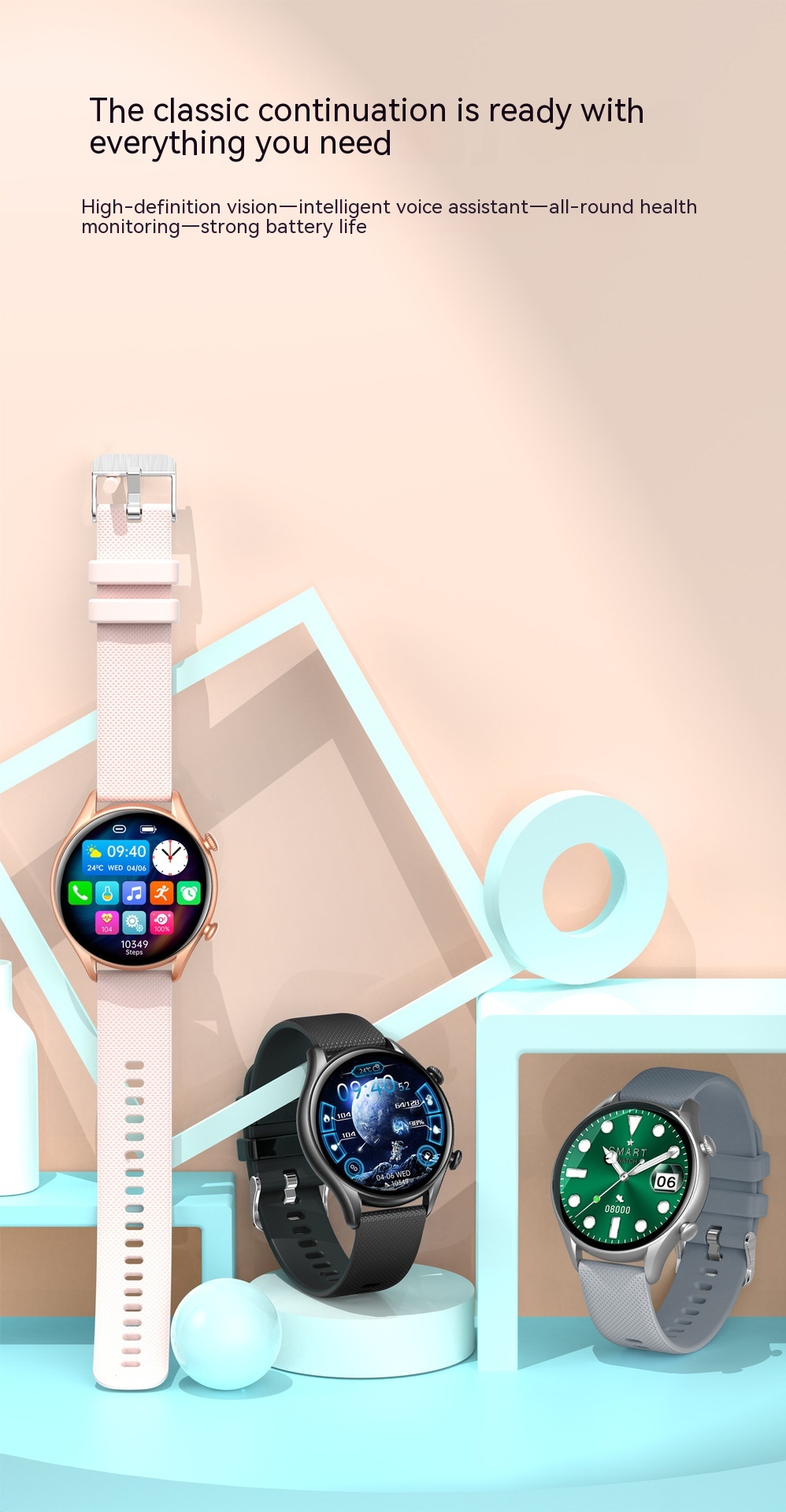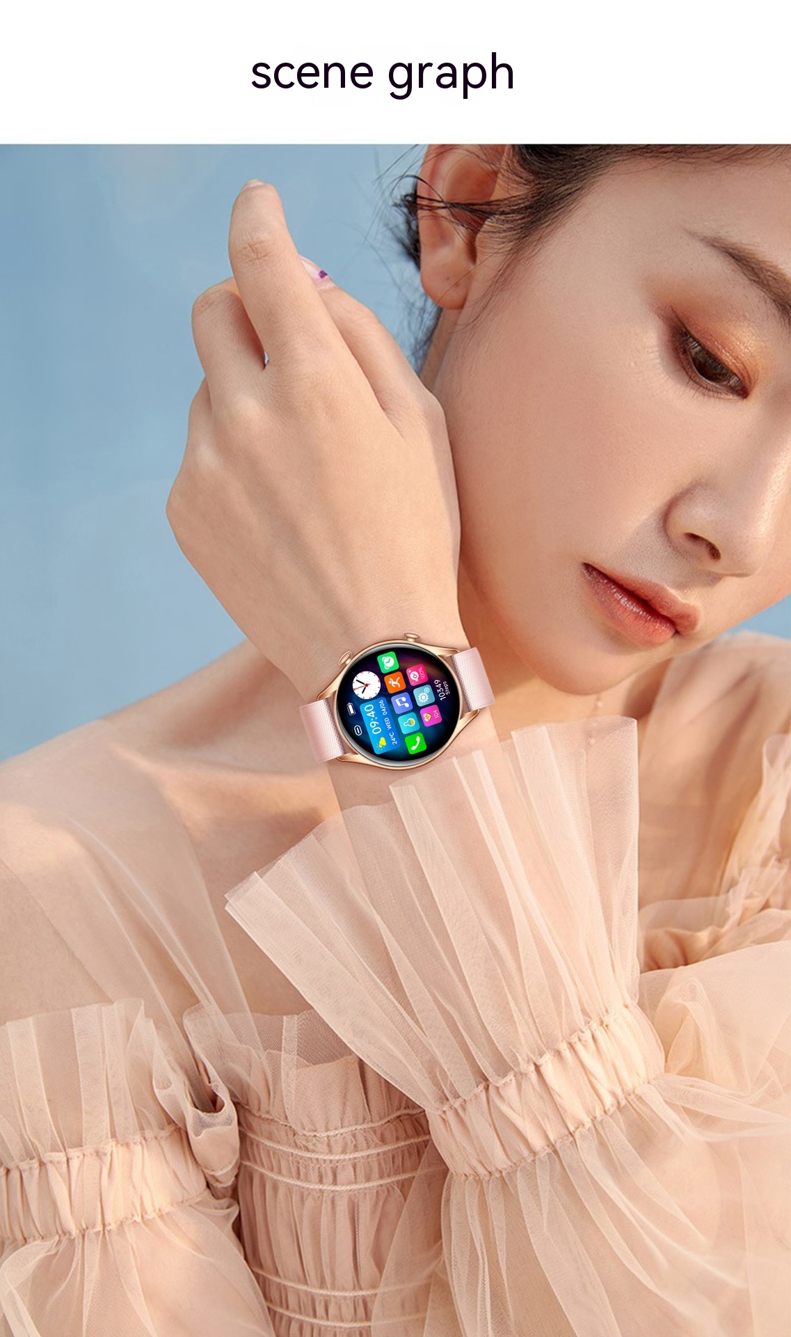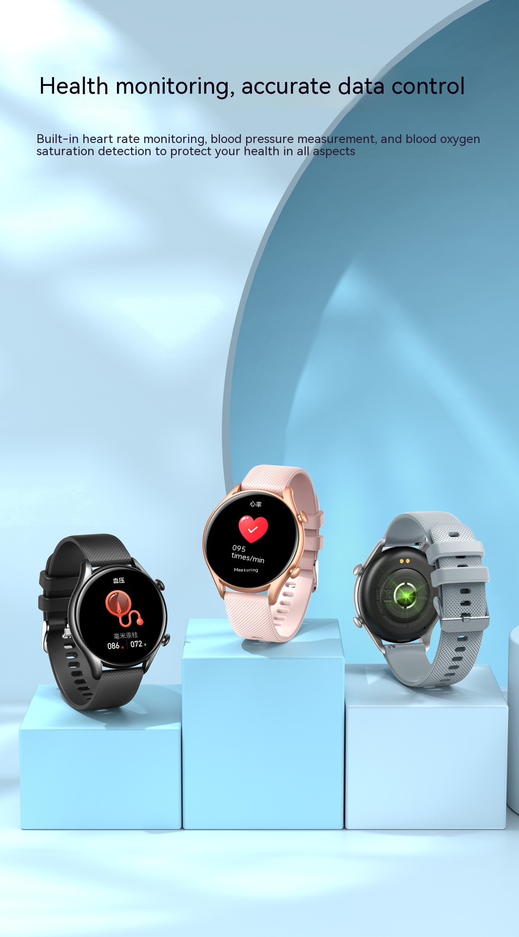 Functions: Waterproof, photographing, step counting, heart rate monitoring, blood pressure measurement, social entertainment, Bluetooth calling, smart reminder, remote control selfie, sleep monitoring, blood oxygen detection