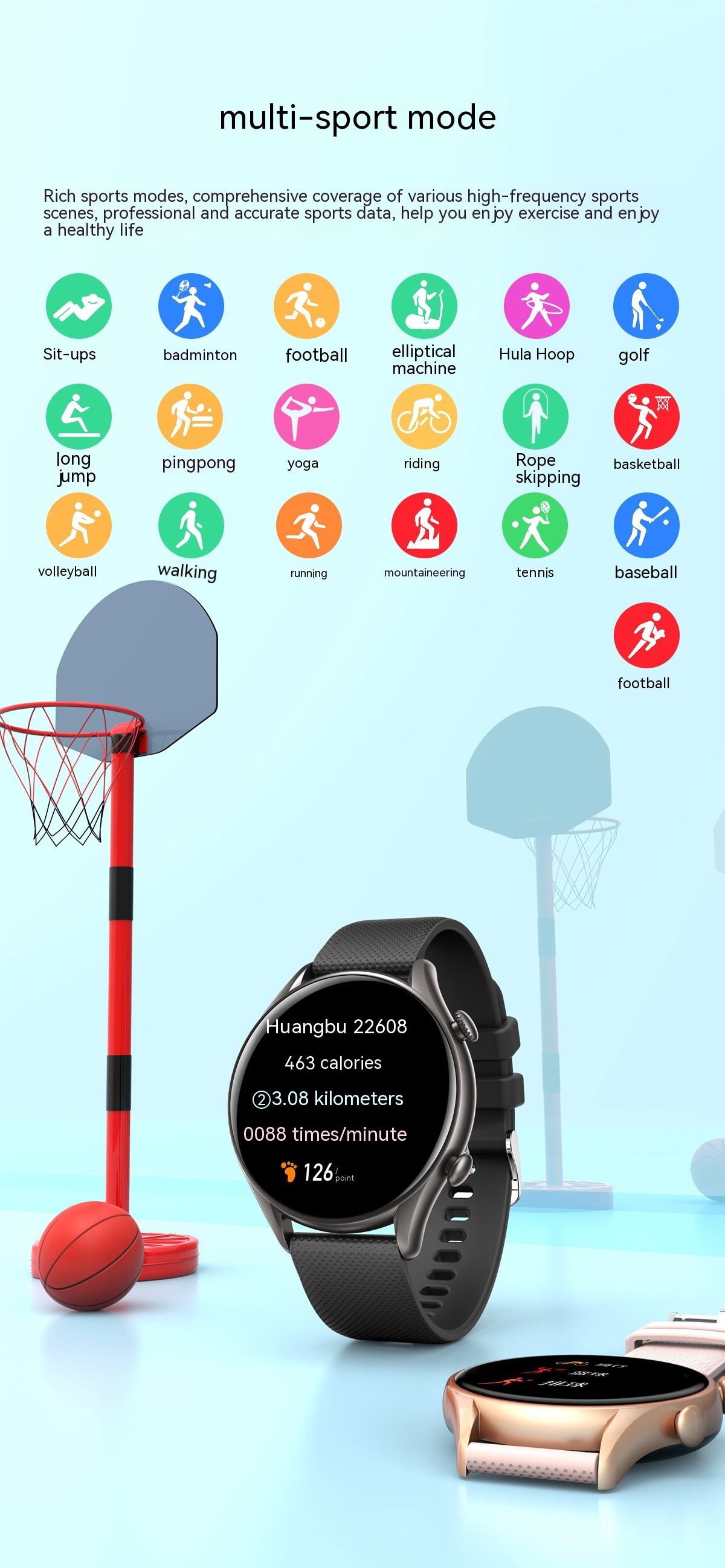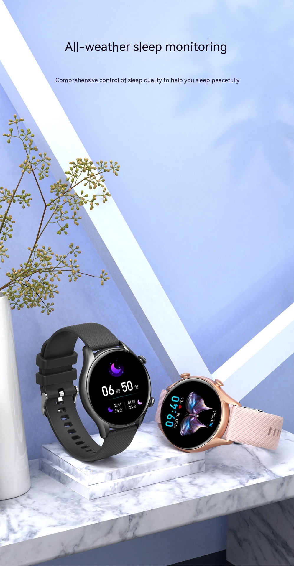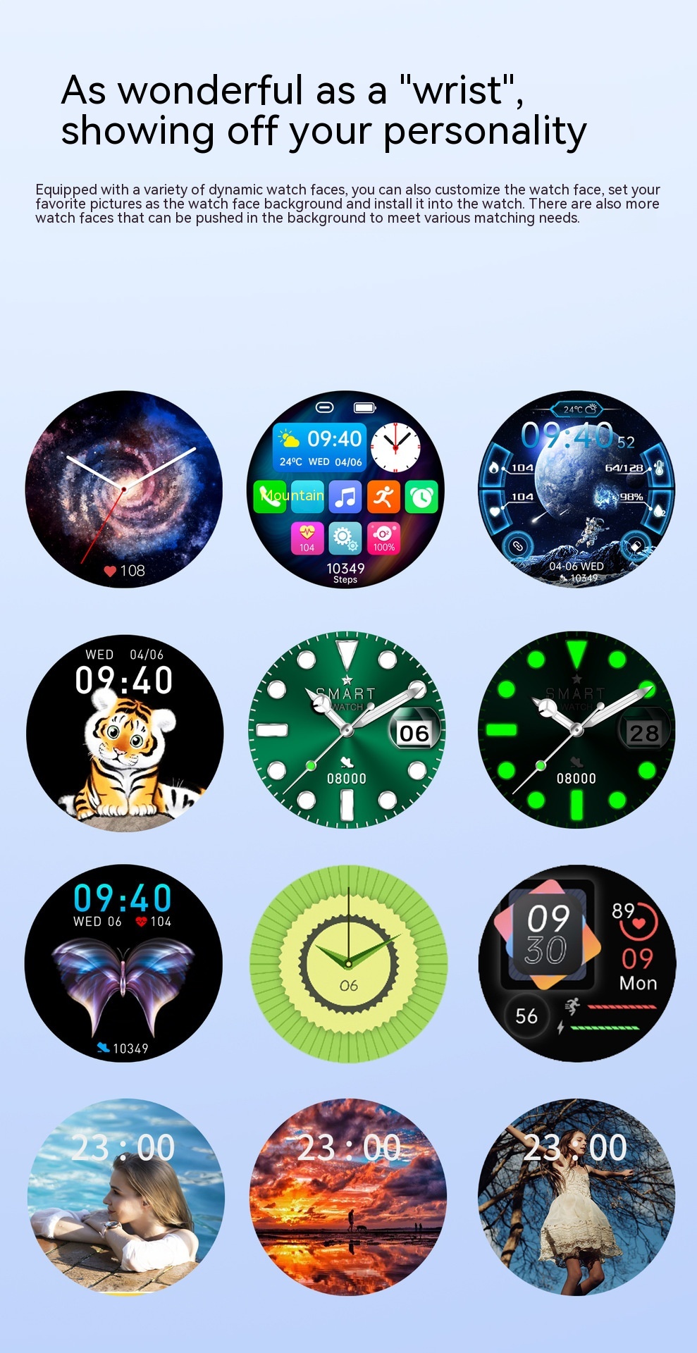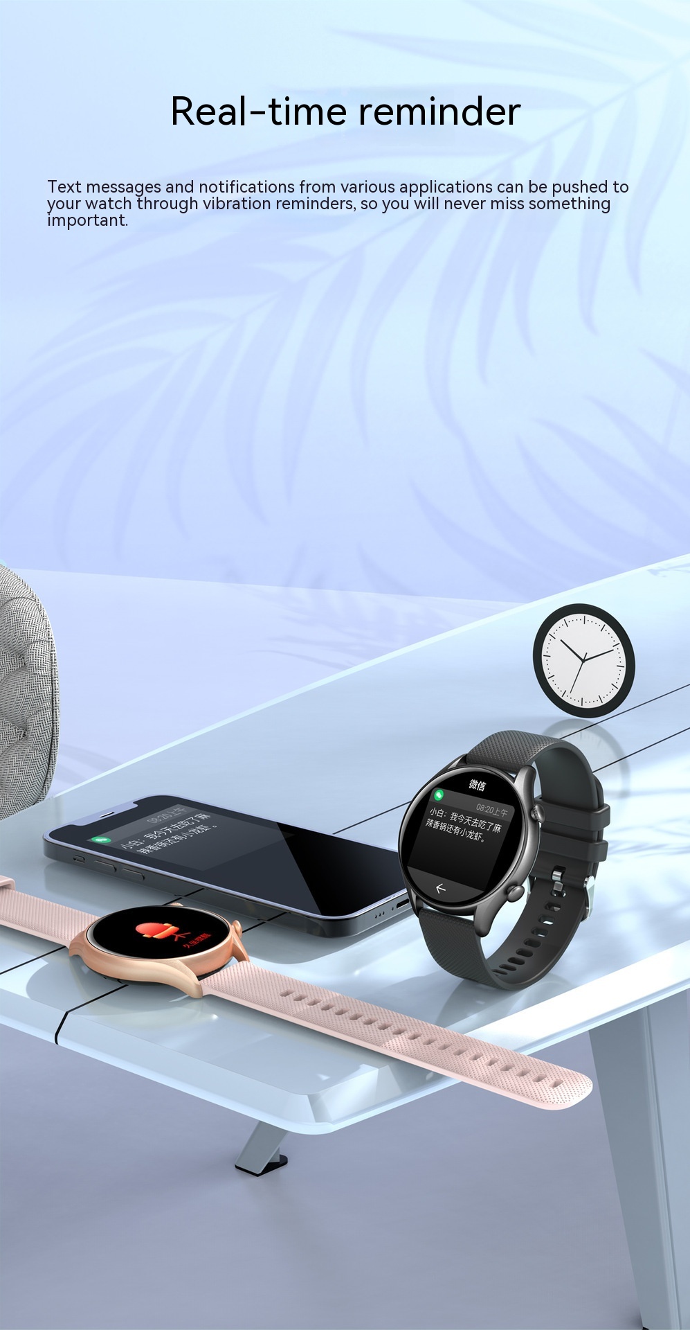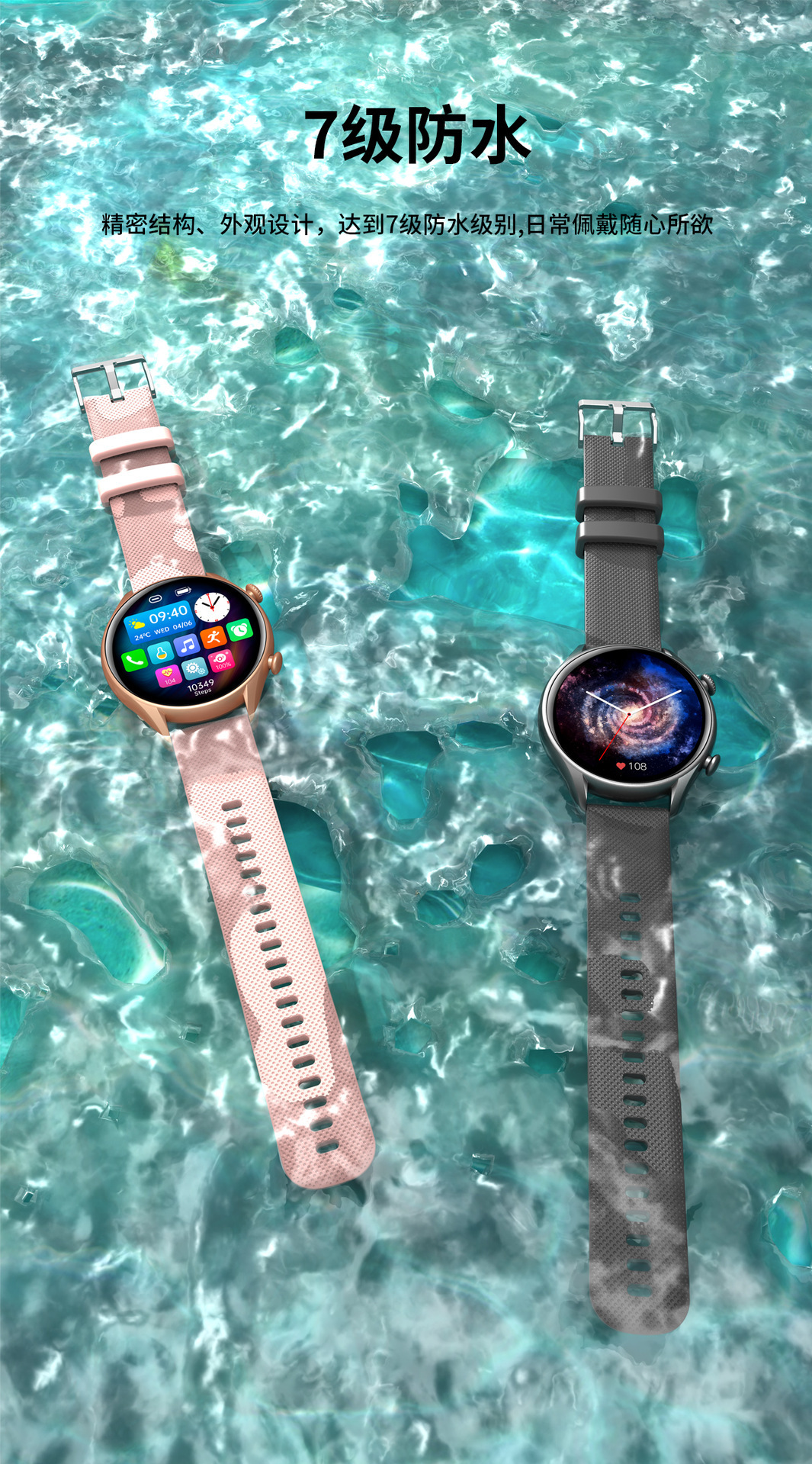 Functions: Waterproof, photographing, step counting, heart rate monitoring, blood pressure measurement, social entertainment, Bluetooth calling, smart reminder, remote control selfie, sleep monitoring, blood oxygen detection