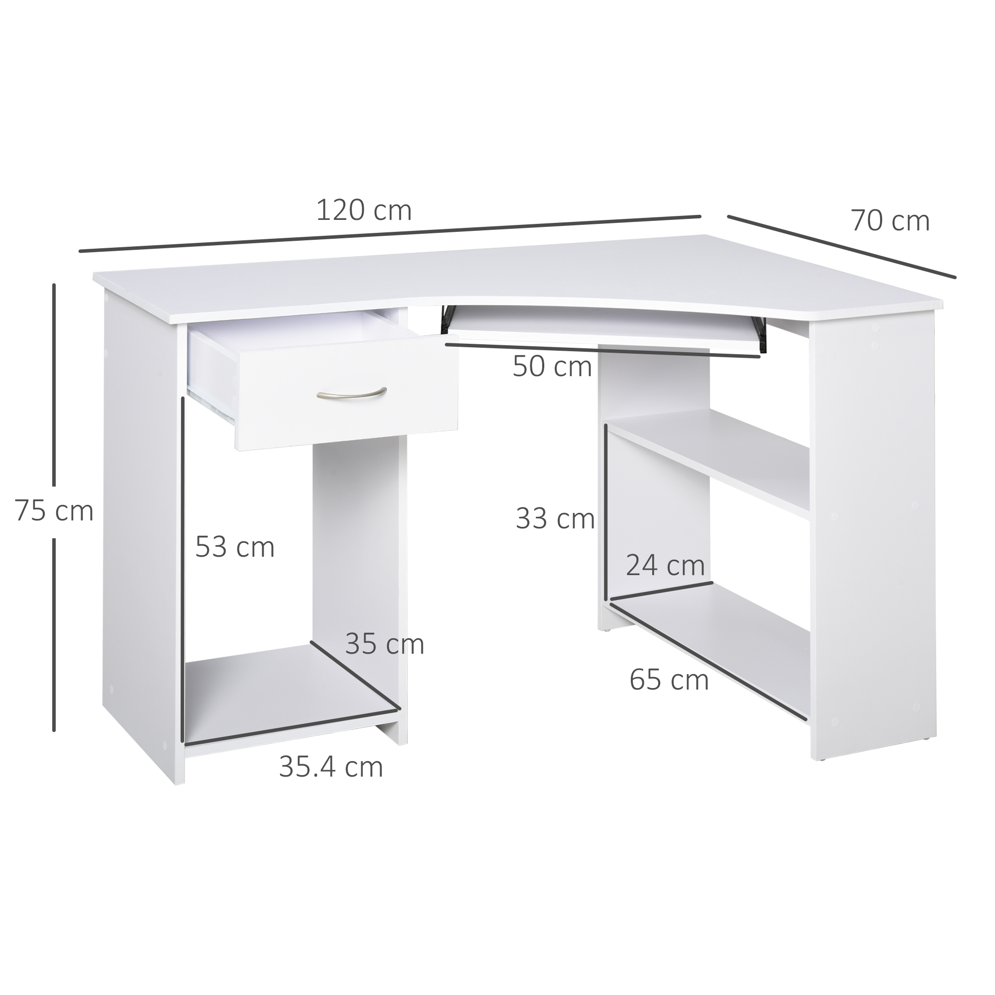 Make the most of those unused corners with this 'L' shaped desk from . This space-efficient piece is made with two wide shelves, an open oblong compartment, a slide-out drawer, keyboard tray and open table top - giving you lots of room needed for working from and keeping your essentials stored. It's made from particle board, meaning the structure is tough and durable so you can use it every day with confidence. It's finished with a smooth melamine coating, which keeps its surface lightly protected and makes it easy to clean. The perfect place to focus your attention all day long.