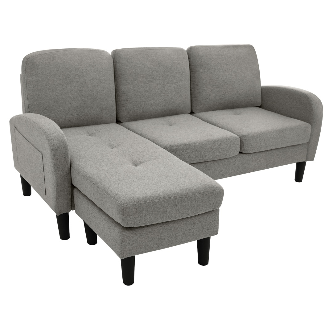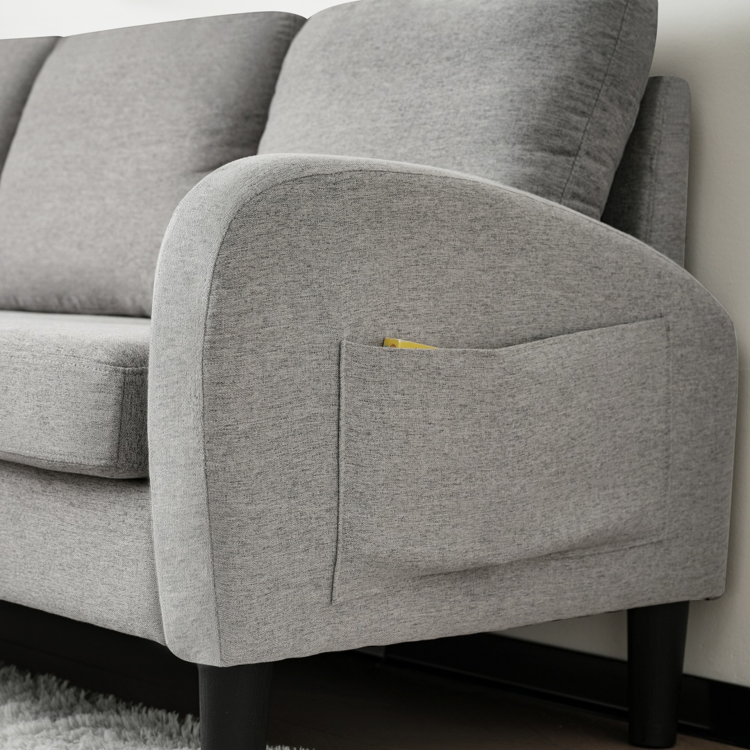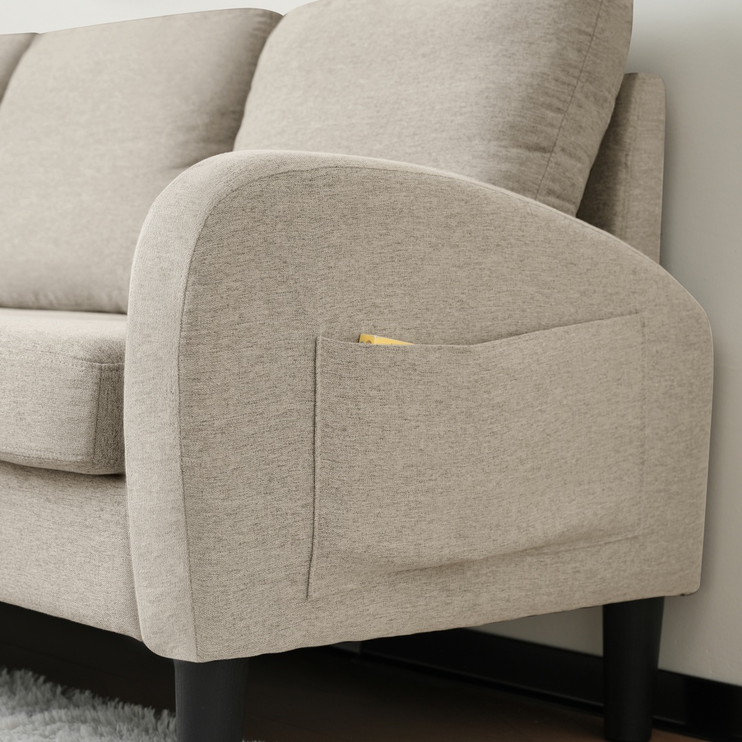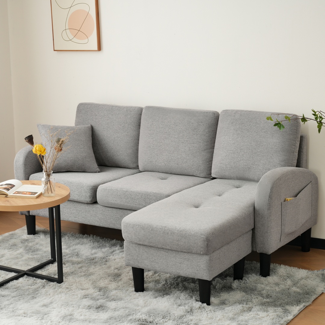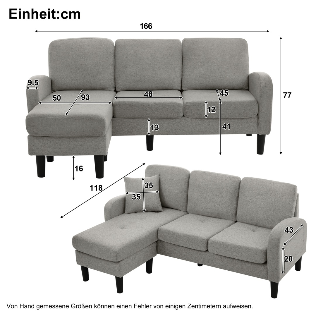 1.Modular Design: The sofa can be flexibly arranged, with a chaise lounge that can be positioned on the left or right to fit different room configurations. 2.Comfortable Padding: The soft cushions provide excellent seating comfort, making it perfect for relaxation and lying down. 3.Ideal for Small Spaces: With compact dimensions of 166 x 118 x 77 cm, this sofa fits perfectly into smaller living rooms, apartments, and offices without sacrificing comfort. 4.Breathable Fabric: The cotton-linen blend fabric cover offers excellent ventilation and remains fresh and cool even on hot days. 5.Sturdy Construction: Thanks to the stable frame and plastic legs, the sofa is particularly durable and stable. 6.Flexible Chaise Lounge: The chaise lounge can be used as an additional lying area or seating space, making the sofa versatile. 7.Easy Assembly: The sofa is quick and easy to assemble – the modular design allows for simple and fast assembly without extra help.