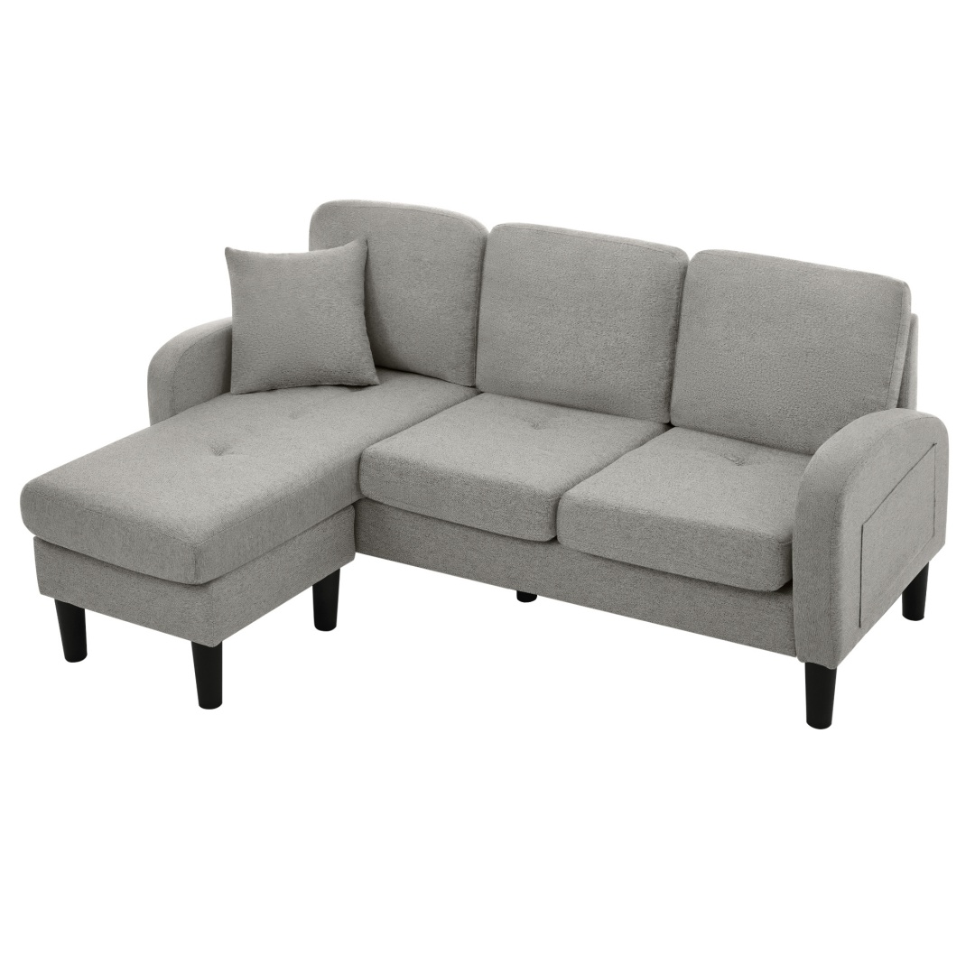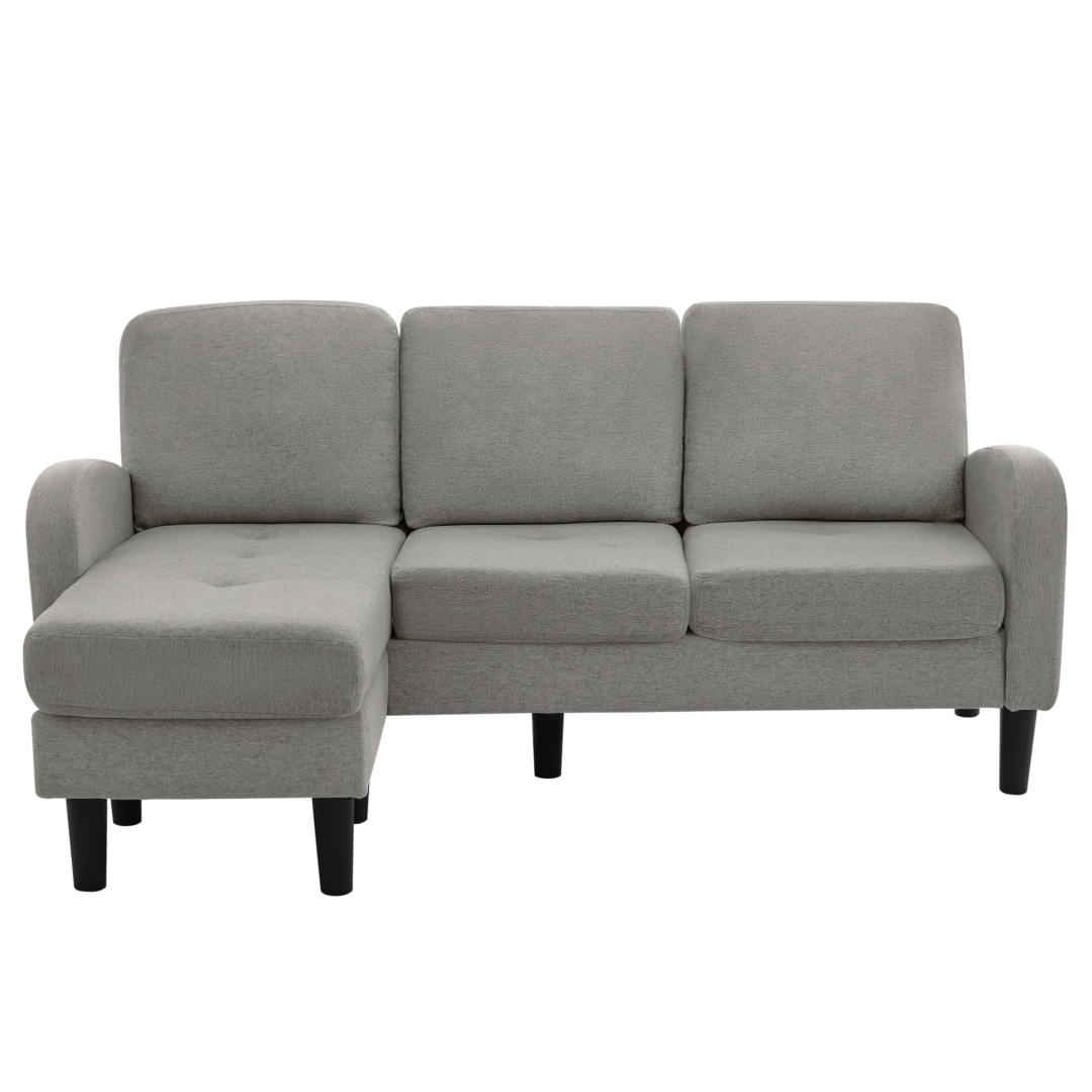 This L-shaped corner sofa with a chaise lounge combines modern design and functionality, making it ideal for small to medium-sized spaces like living rooms, apartments, or offices. It comfortably seats up to three people and stands out with its practical modular design. The sofa consists of a two-seater module and a flexible chaise lounge that can be positioned on the left or right side, depending on your room layout. The breathable cotton-linen surface ensures excellent ventilation and stays pleasantly cool and comfortable. The soft padding provides superior comfort for both sitting and lying down, while the sofa's compact size of 166 x 118 x 77 cm fits perfectly in smaller spaces without compromising on space or functionality. The sofa is particularly durable and stable, thanks to its robust frame and sturdy plastic legs. With an easy assembly process and an additional cushion for extra comfort, this sofa is the perfect solution for modern, functional living spaces that are both stylish and comfortable.