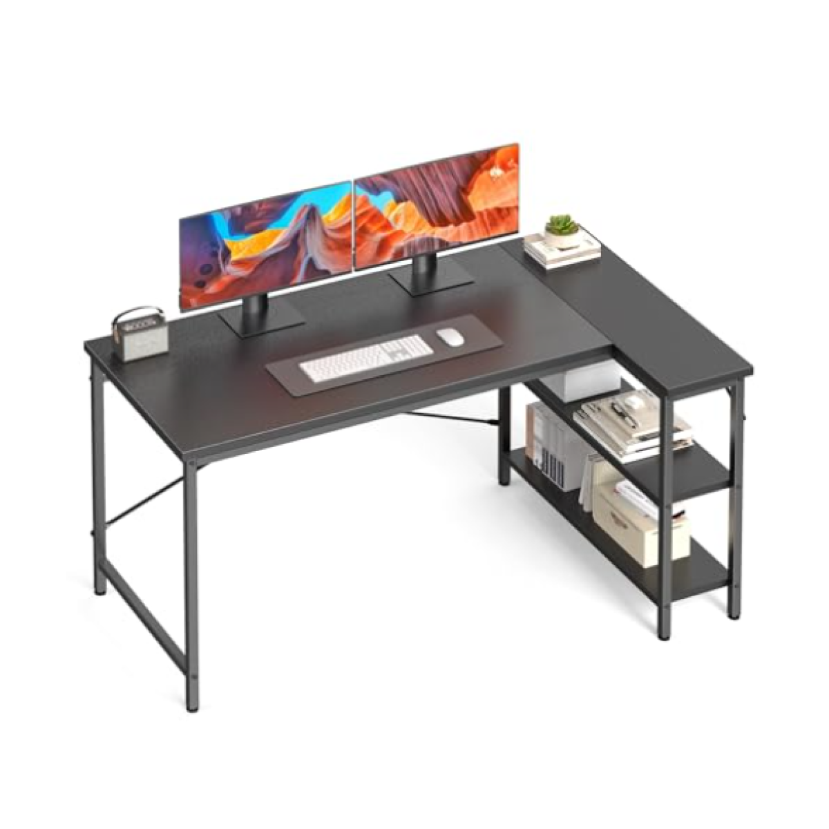 Large Workspace & Smart Organization - Enjoy a spacious L-shaped desktop for multiple monitors and work essentials. The 2-tier shelving keeps books and supplies neatly organized, while the open leg design ensures comfortable seating and movement.