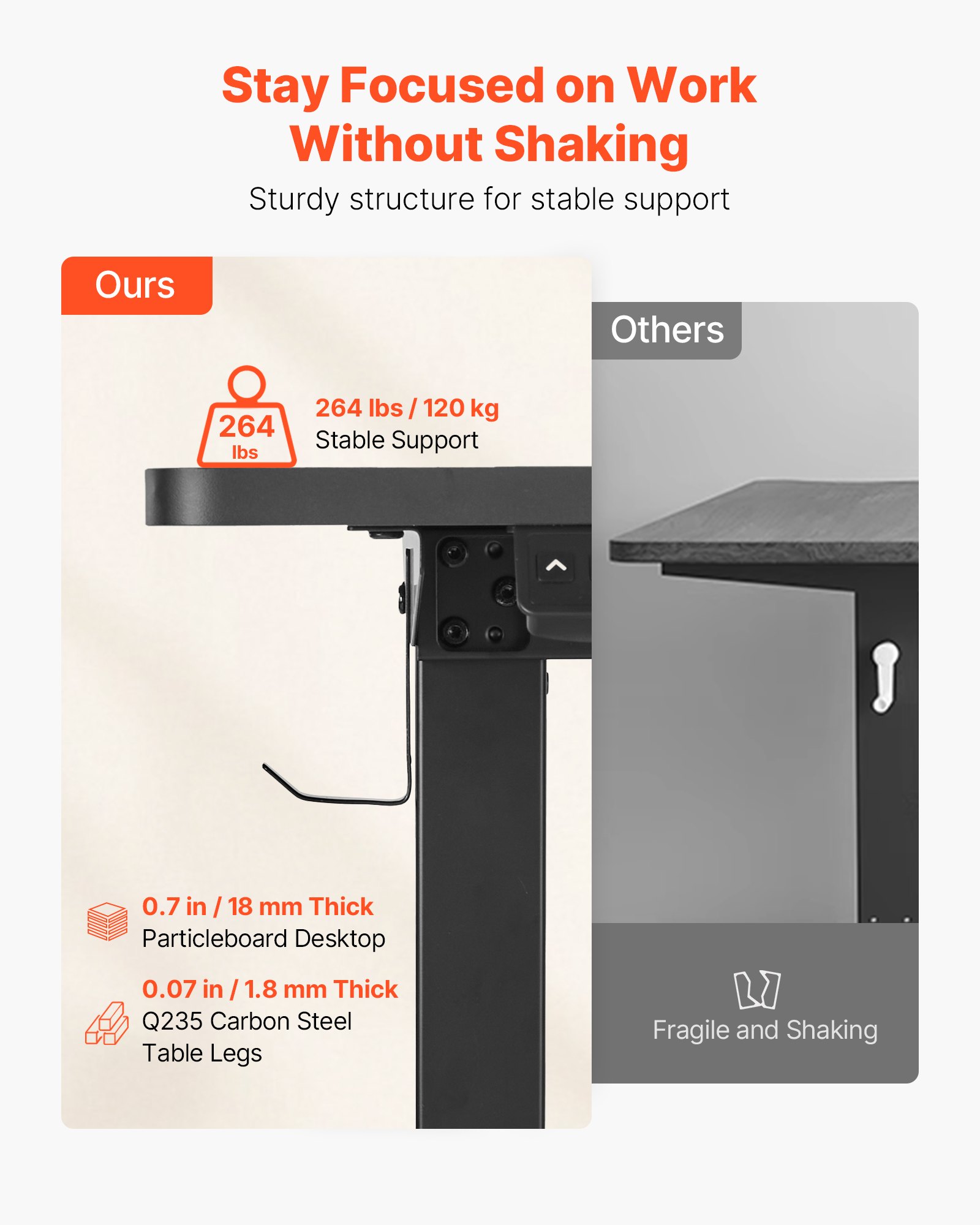 Sturdy Frame & Thick Desktop: This corner gaming desk features a high-carbon steel frame and a thick particleboard desktop, ensuring durability and maximum stability. It supports a load capacity of up to 264 lbs / 120 kg, securely holding multiple devices for office use
