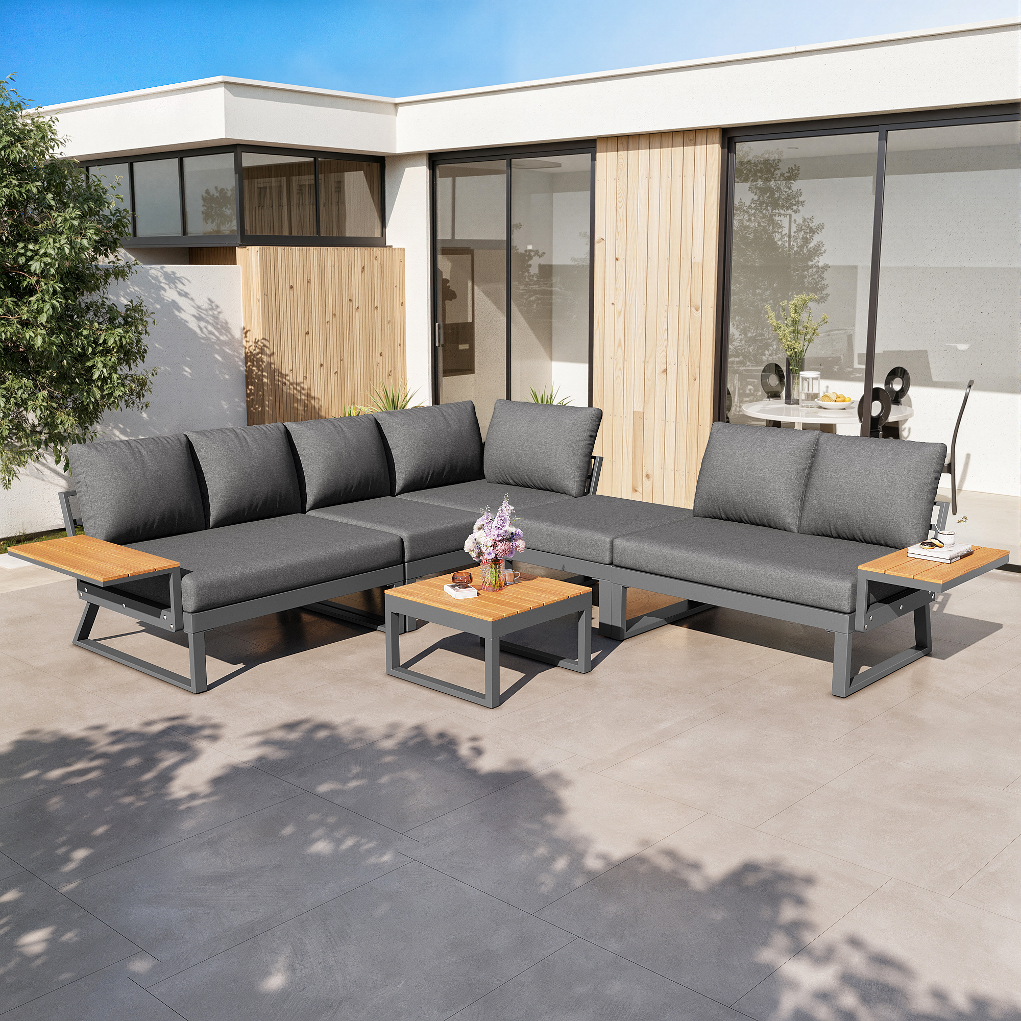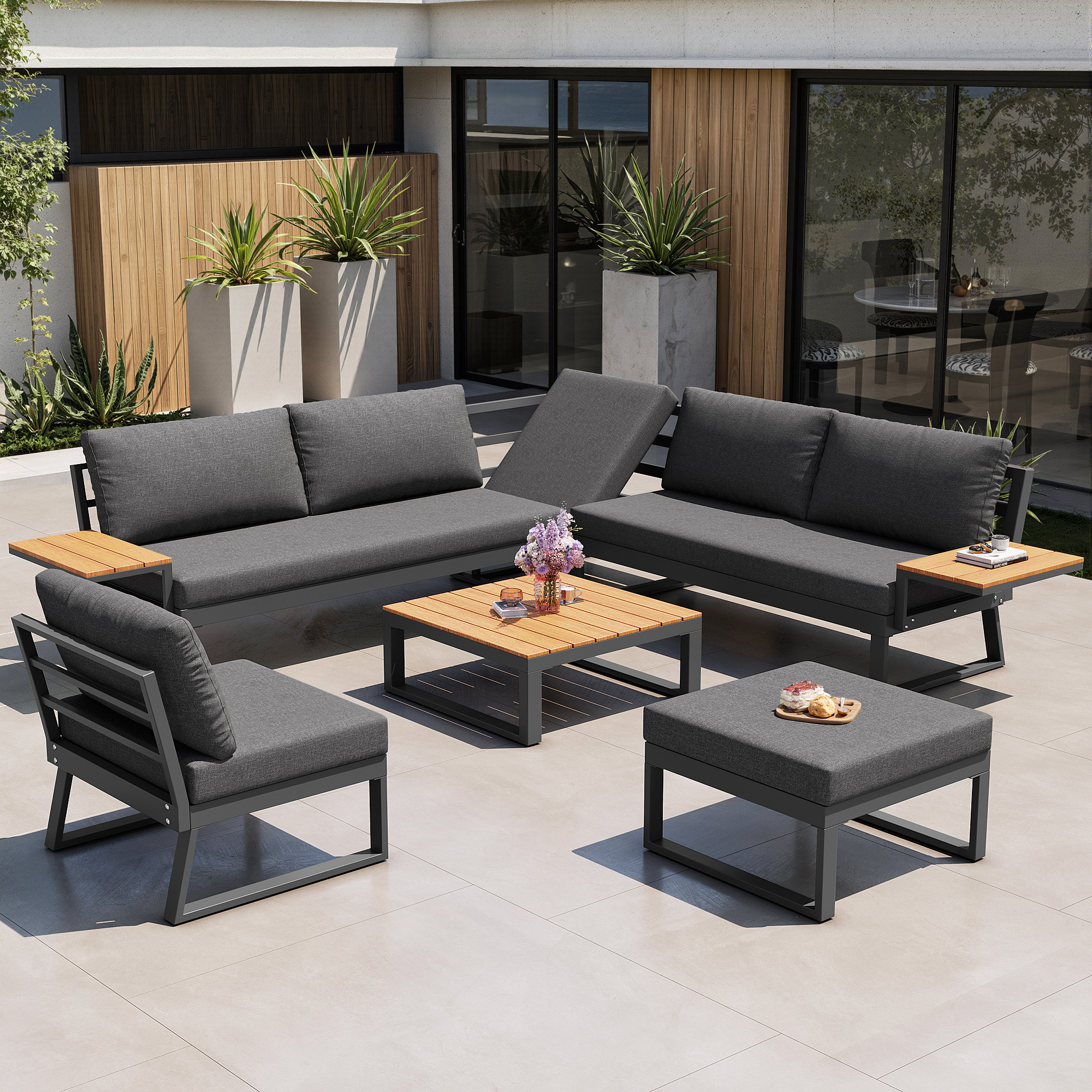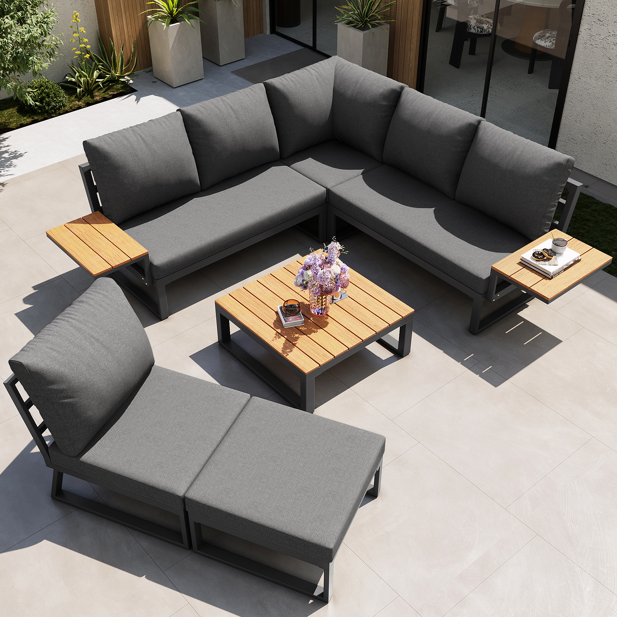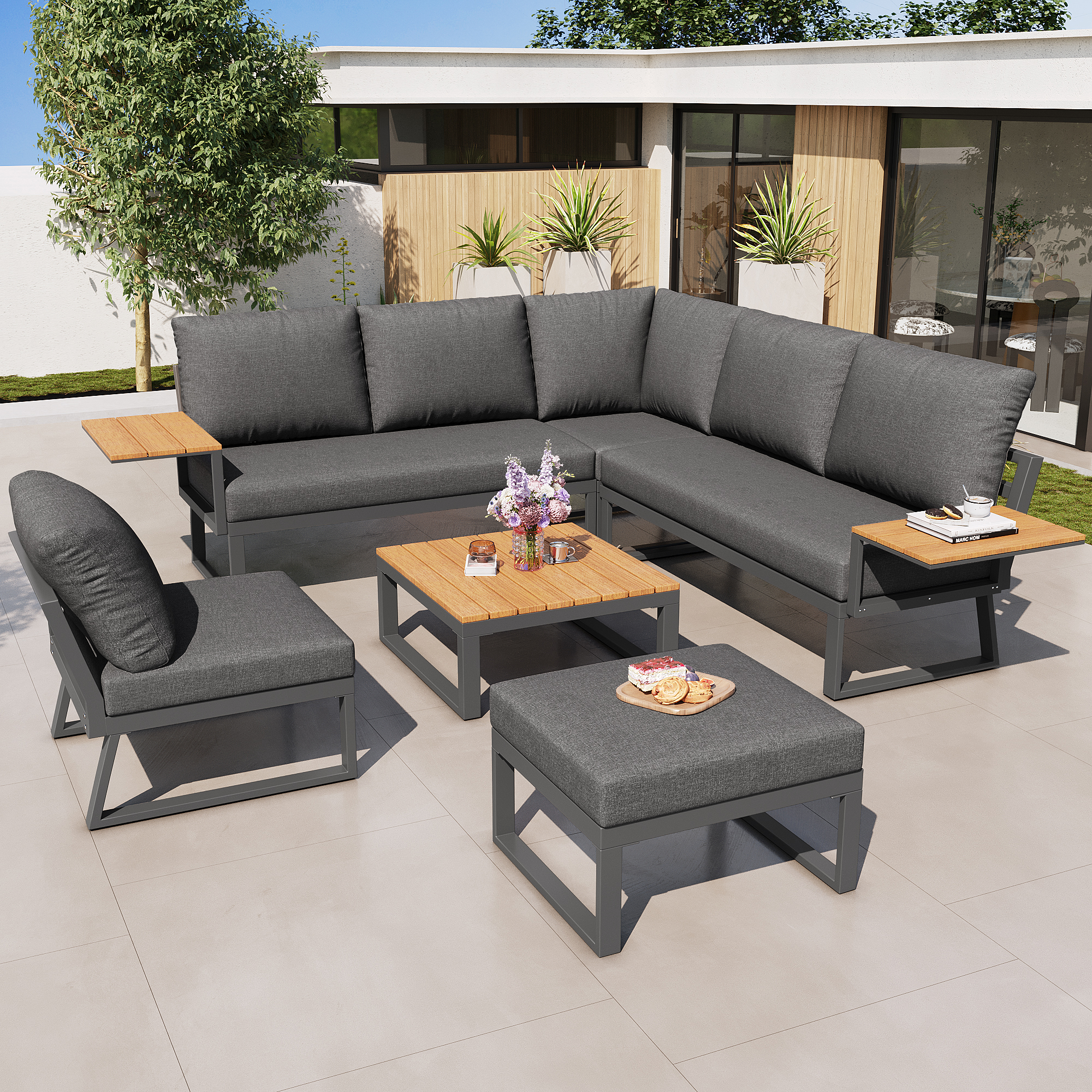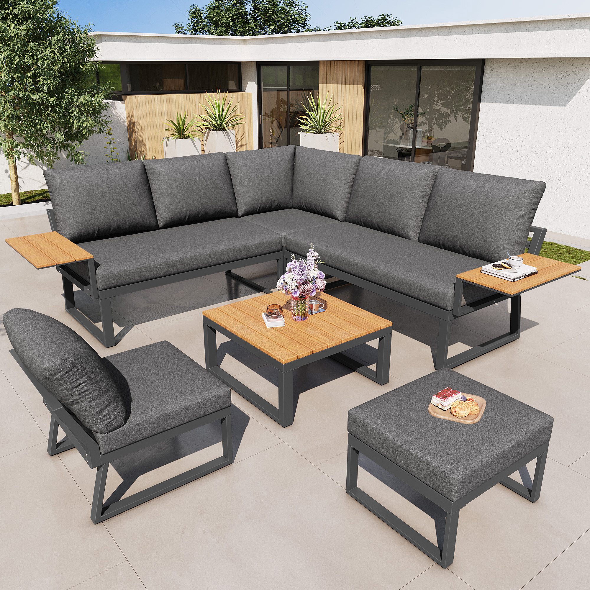 Product Name:L-Shaped Garden Sofa Set with Wooden Armrests / Weather-Resistant Corner Suite & Daybed Made of Iron / Including Wooden Table, Armchair & Stool, 7-Person / With Cushions / Gray