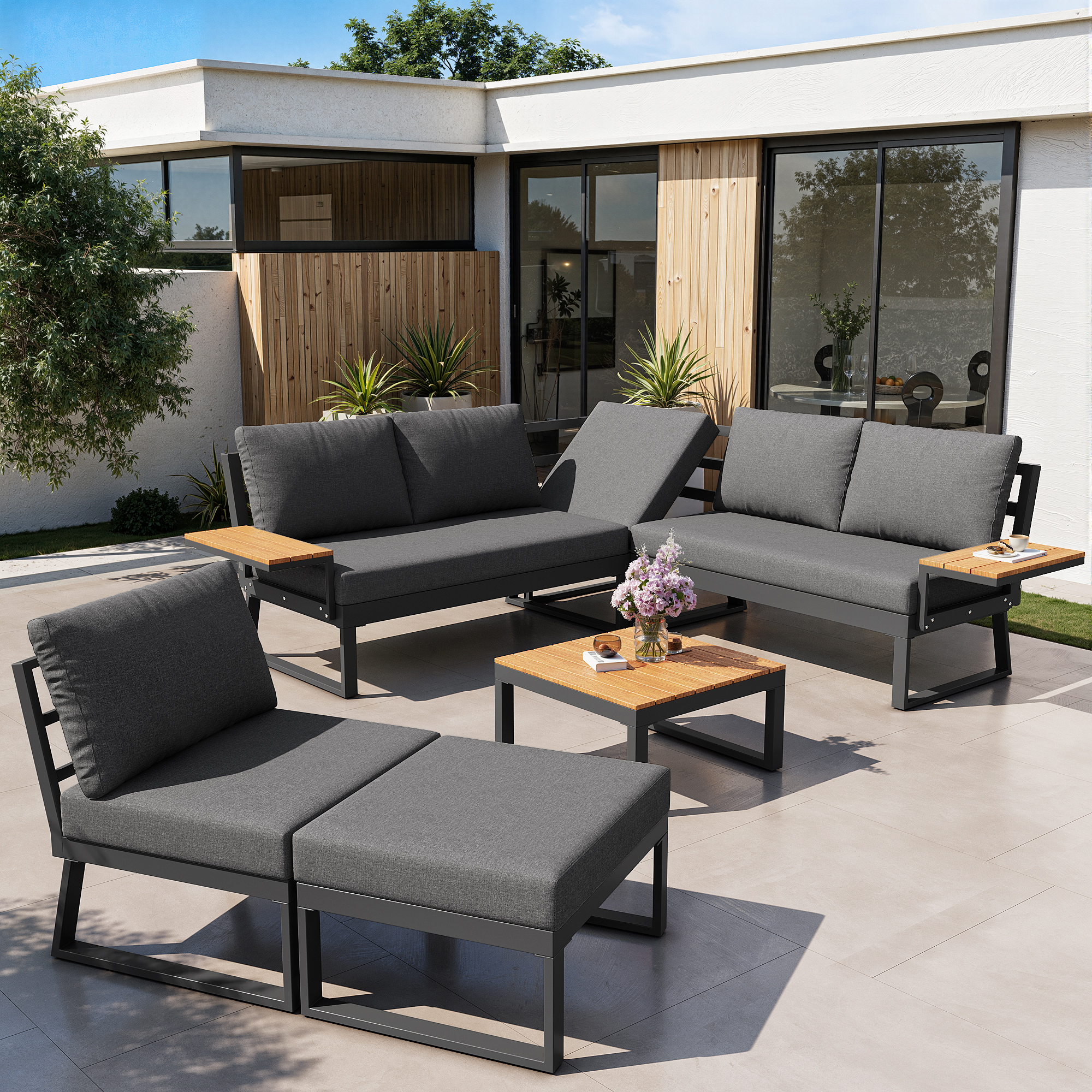 This furniture set includes four sofas, a stool, and a wooden coffee table and offers seating for seven people. The 10 cm thick seat cushions are soft and breathable. The wooden armrests give this lounge sofa set a unique design character. The widened armrests not only provide relaxation for the arms but can also serve as a temporary storage surface. The overall color combination is elegant and pleasant, suitable for various interior styles, comfortable and durable – the ideal choice for leisure and entertainment outdoors!