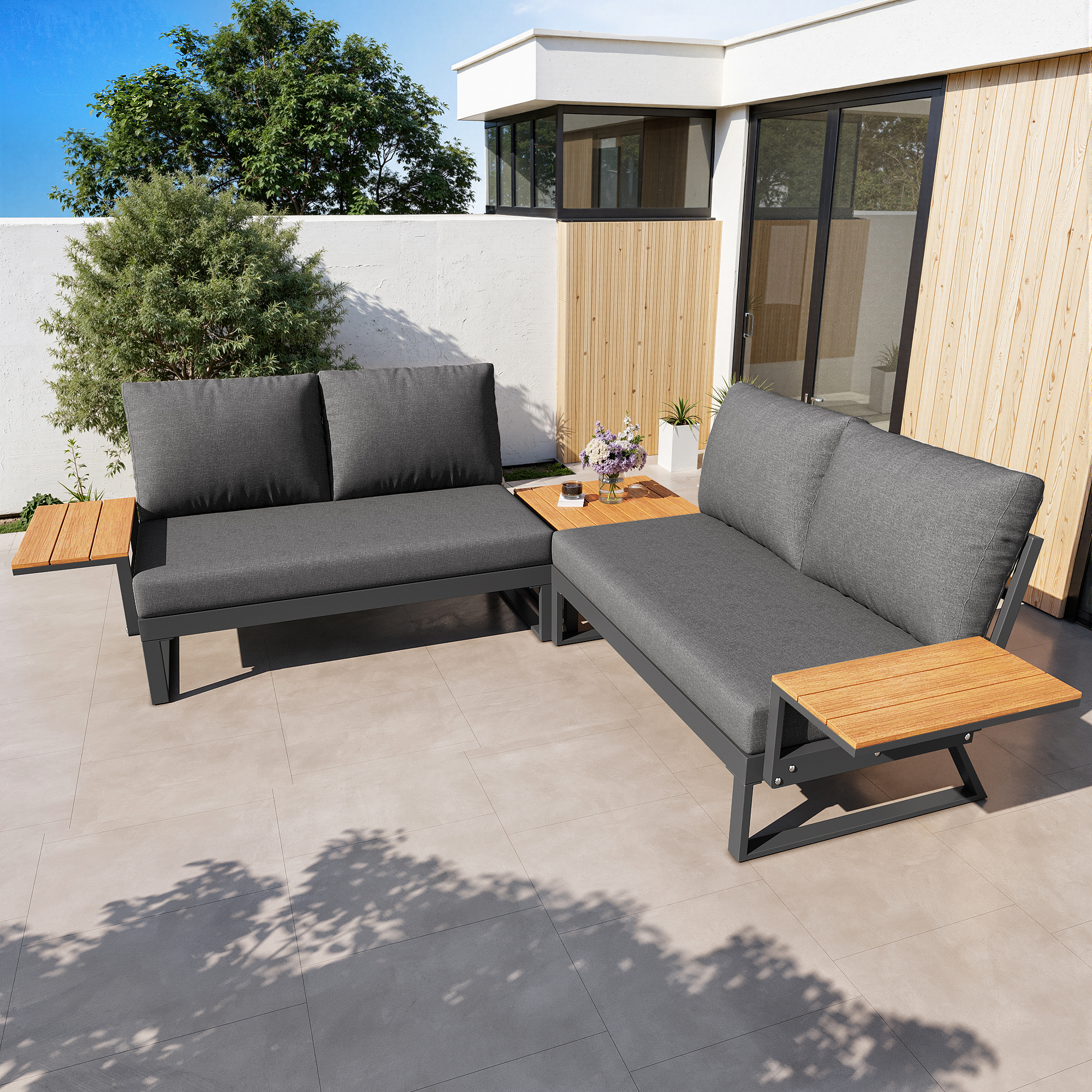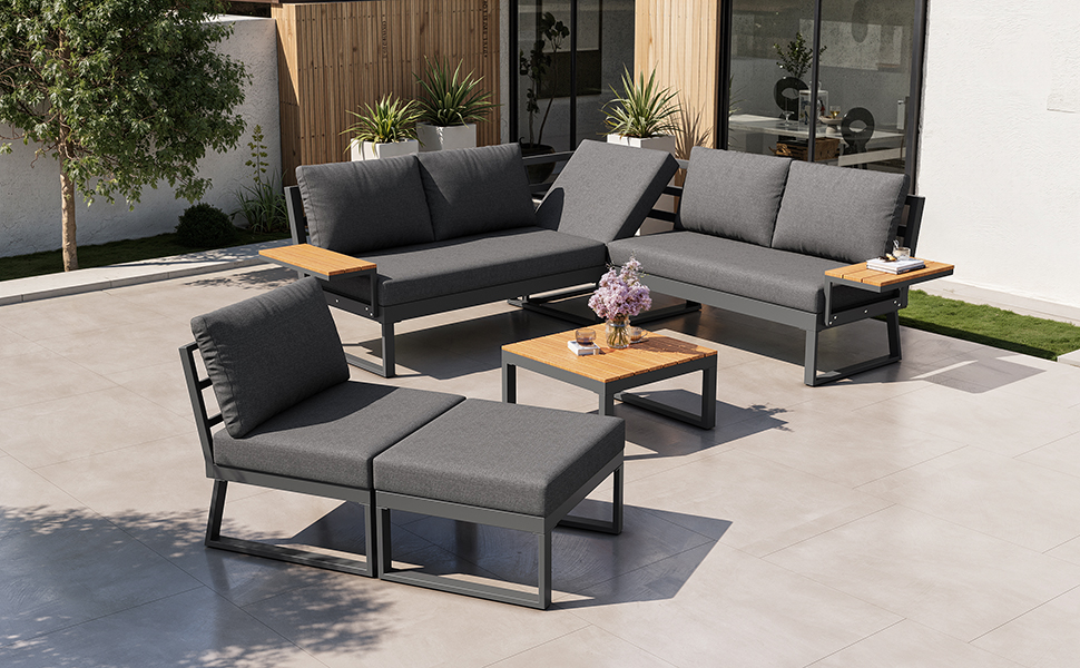 The covers of the cushions and seat pads are removable and washable. The splash-proof fabric effectively protects against stains. The seat cushions are equipped with fastening straps that prevent slipping. The two multi-person sofas can be combined into an L-shaped sofa as needed to accommodate different numbers of people. The wooden tabletop is very easy to clean, and the water-repellent design guarantees a long product life outdoors.