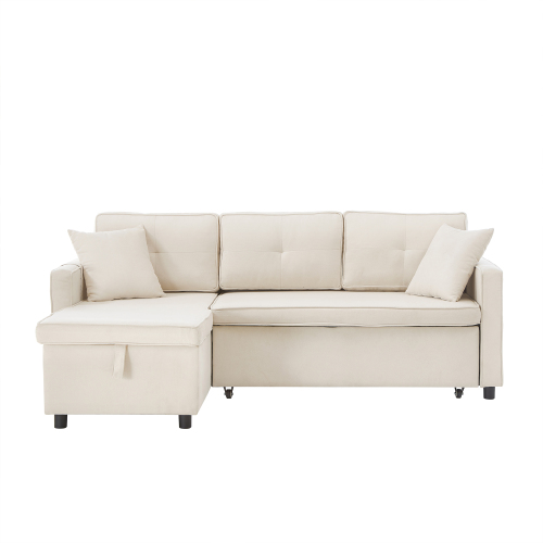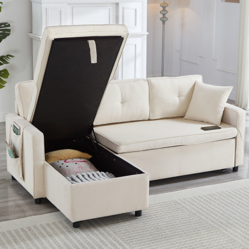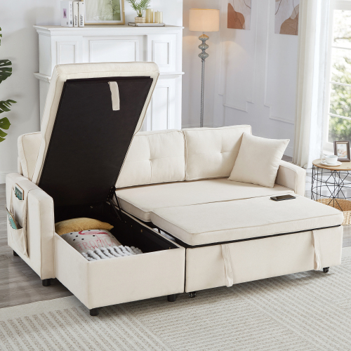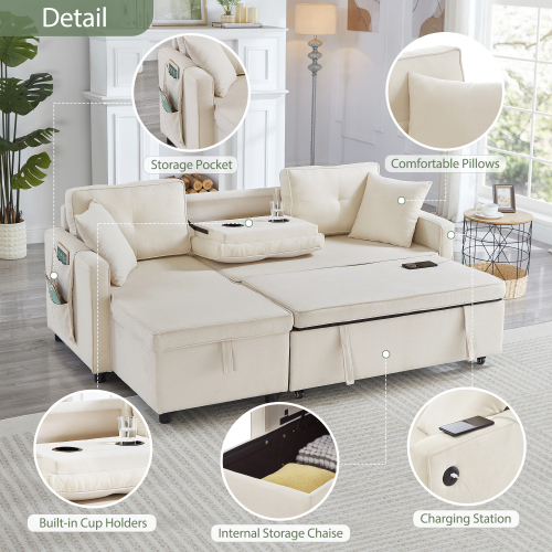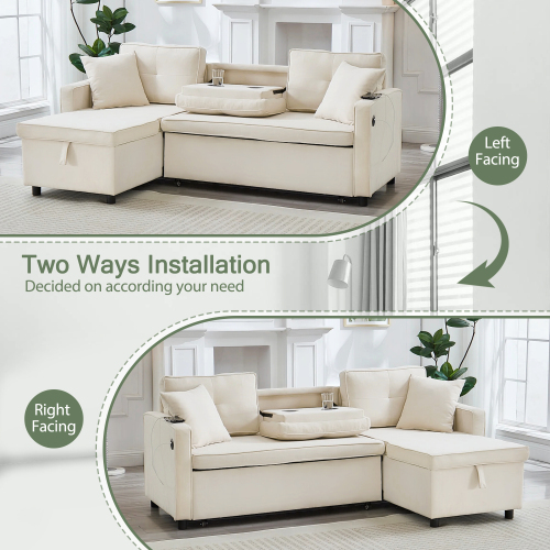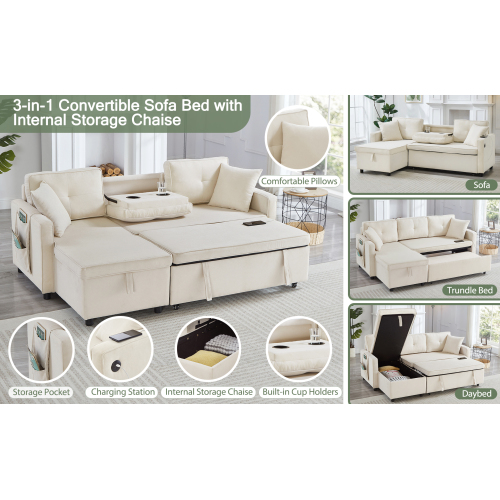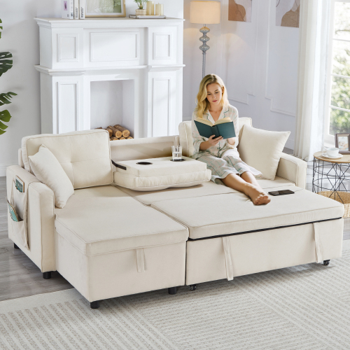 Product Name:L-Shaped Pull Out Sleep Sofabed, Modern Reversible Sleeper Sectional Sofa, 3 in 1 Convertible Sofa Bed with Storage Chaise, Drop-Down Table, Cup Holders and Charging Ports (USB & Type-C), Beige
