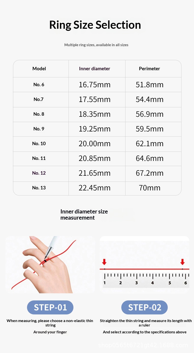Color: Pink No. 6 inner diameter 16.75mm, Pink No. 7 inner diameter 17.55mm, Pink No. 8 inner diameter 18.35mm, Pink No. 9 inner diameter 19.25mm, Pink No. 10 inner diameter 20.00mm, Pink No. 11 inner diameter 20.85mm, Pink No. 12 inner diameter 21.65mm, Pink No. 13 inner diameter 22.45mm; Silver No. 6 inner diameter 16.75mm, Silver No. 7 inner diameter 17.55mm, Silver No. 8 inner diameter 18.35mm, Silver No. 9 inner diameter 19.25mm, Silver No. 10 inner diameter 20.00mm, Silver No. 11 inner diameter 20.85mm, Silver No. 12 inner diameter 21.65mm, Silver No. 13 inner diameter 22.45mm; Black No. 6 inner diameter 16.75mm, Black No. 7 inner diameter 17.55mm, Black No. 8 inner diameter 18.35mm, Black No. 9 inner diameter 19.25mm, Black No. 10 inner diameter 20.00mm, Black No. 11 inner diameter 20.85mm, Black No. 12 inner diameter 21.65mm, Black No. 13 inner diameter 22.45mm.