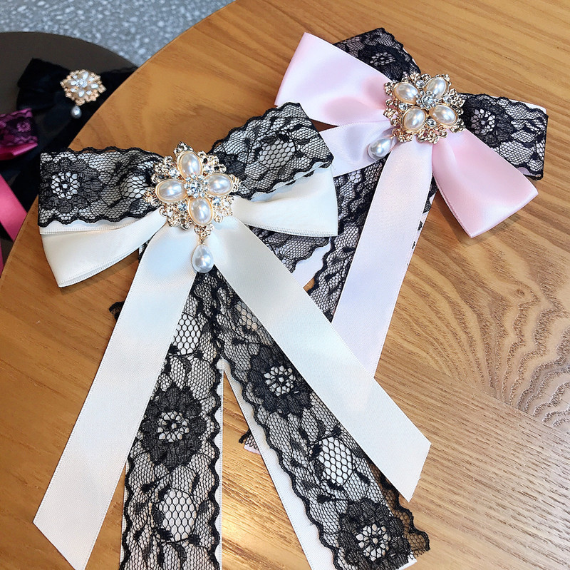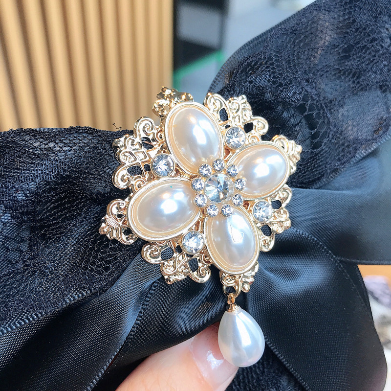 Bow tie collar flower female korean lace big bow rhinestone pearl streamer high-end tie pin pin fashion brooch trend