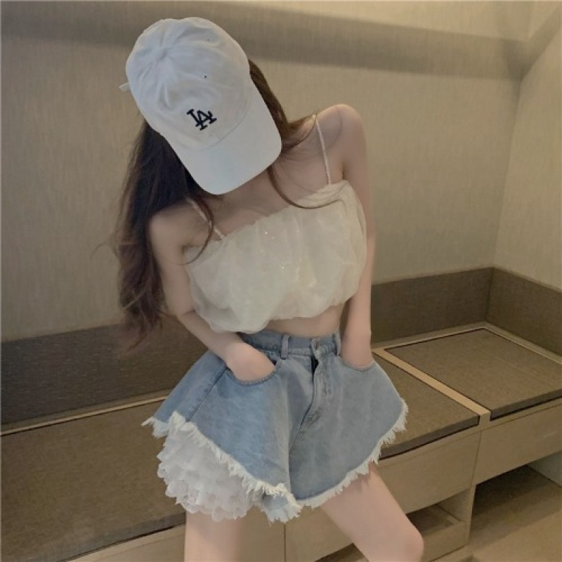Color: beige (gauze top), light blue (jeans), white (lace leggings)