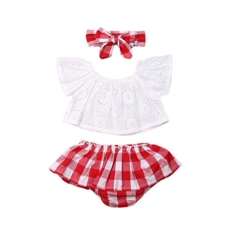 Lace Hollow Embroidered One-shoulder Top Plaid Shorts Set Headwear