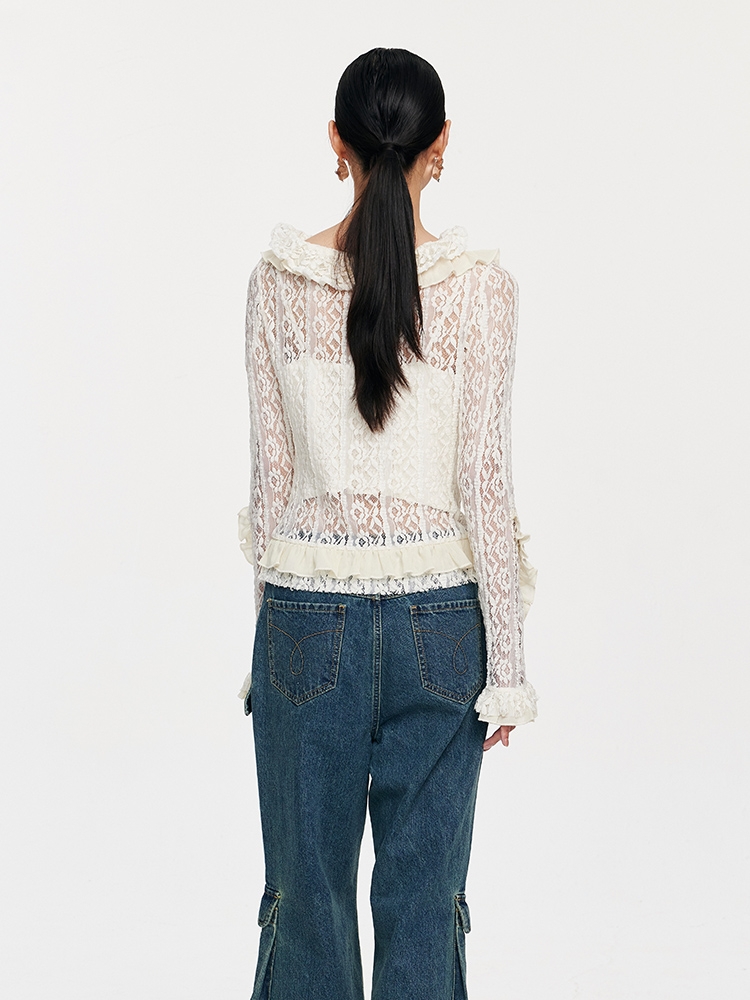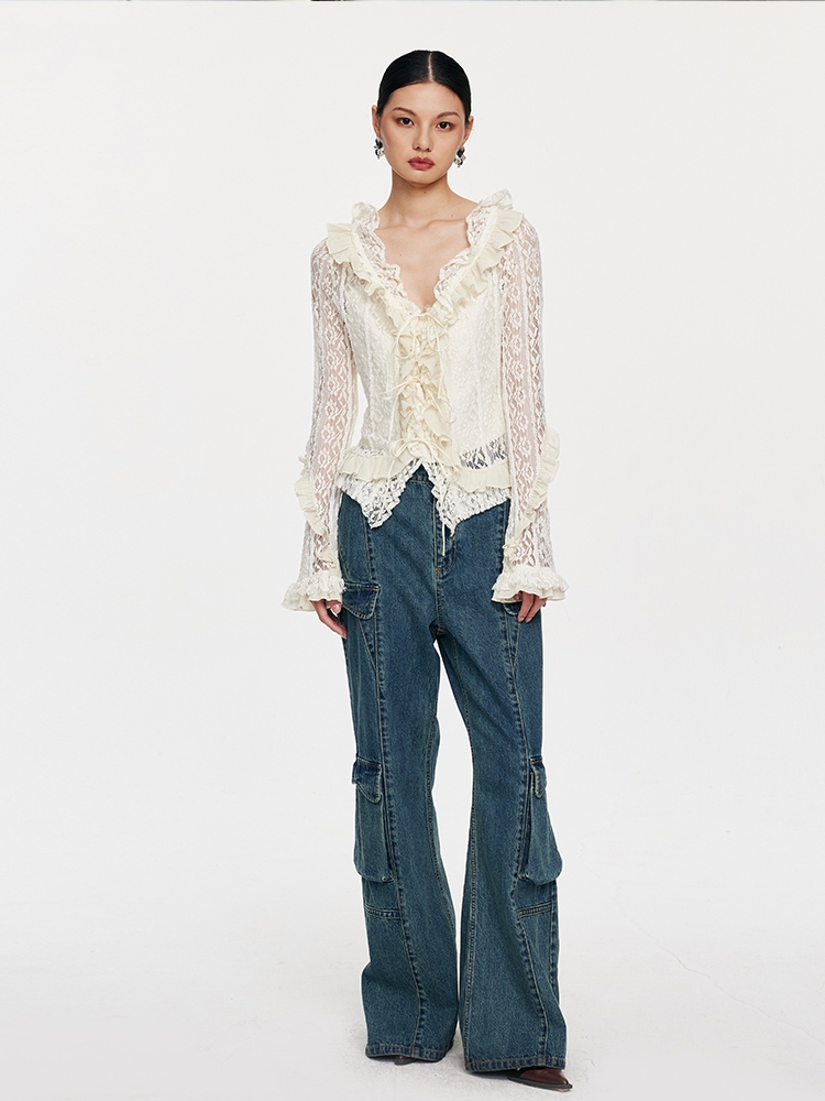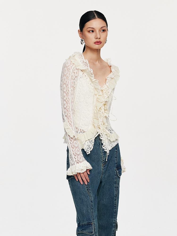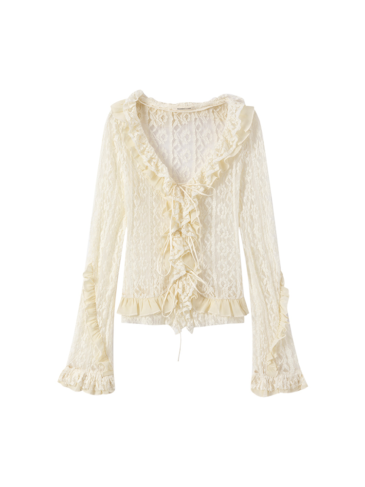 Lace Tie With Fungus Edge Long Sleeved Pullover