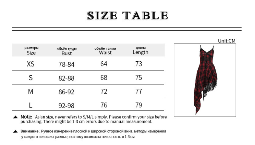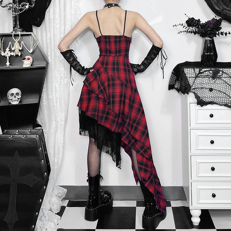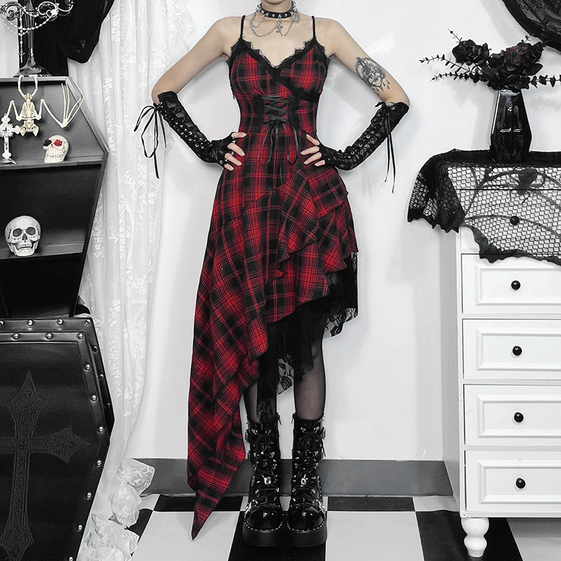 Lace-up Dark-colored Irregular Patchwork Hem Plaid Dress